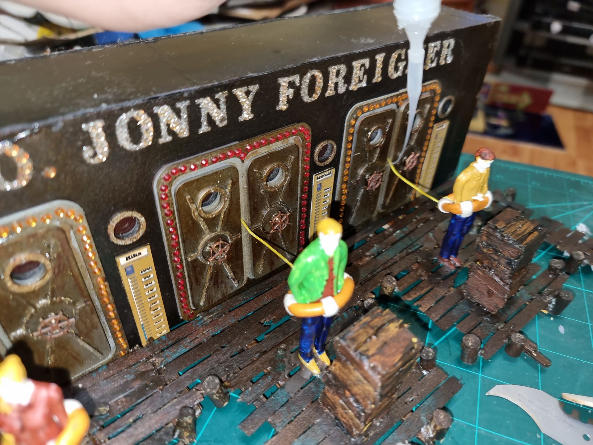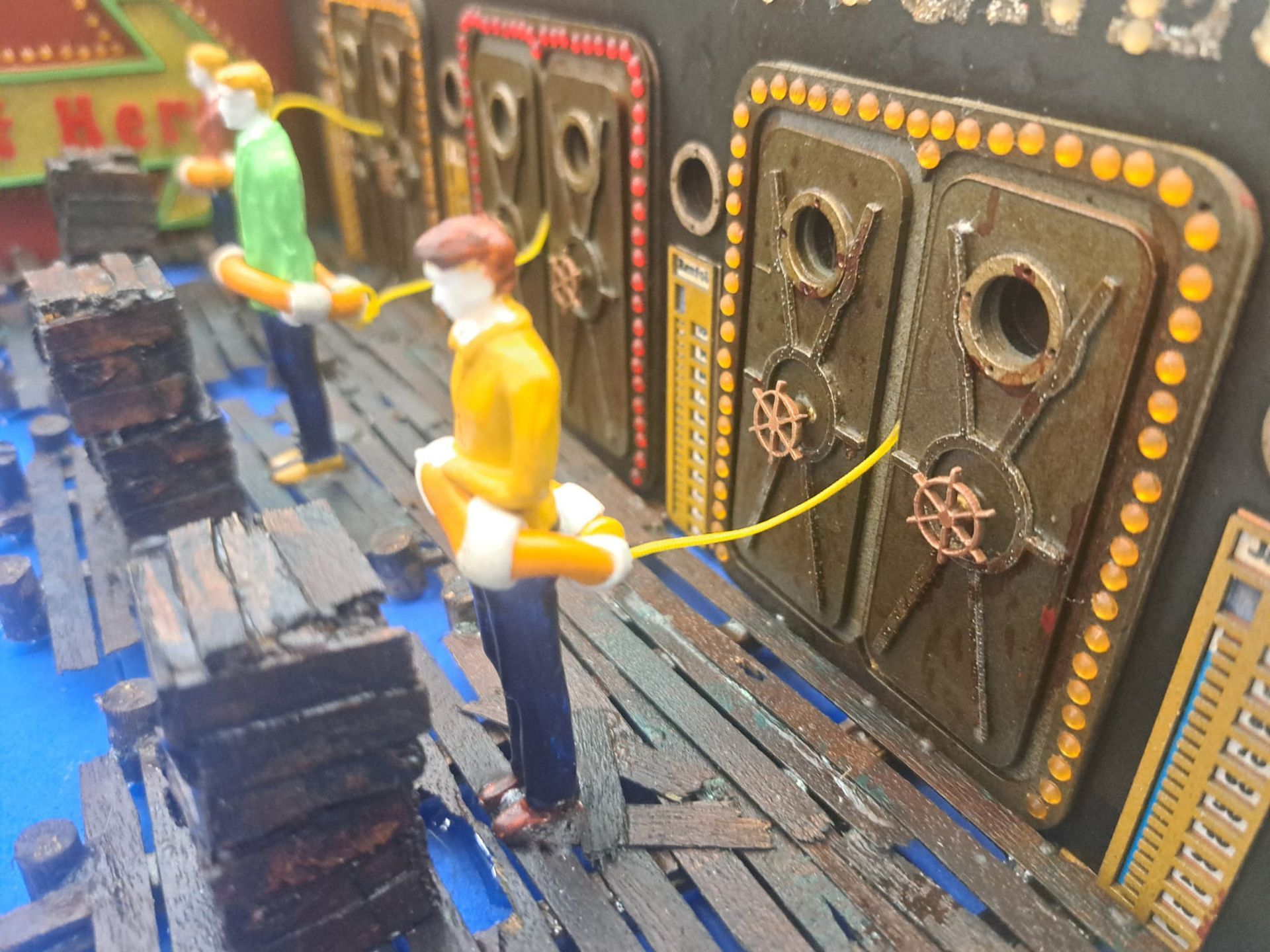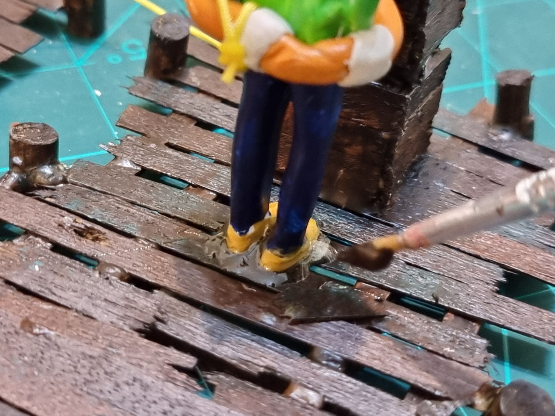 These figures where superglued onto the dock. This glue was painted over and simulated planting onto the glue resin.