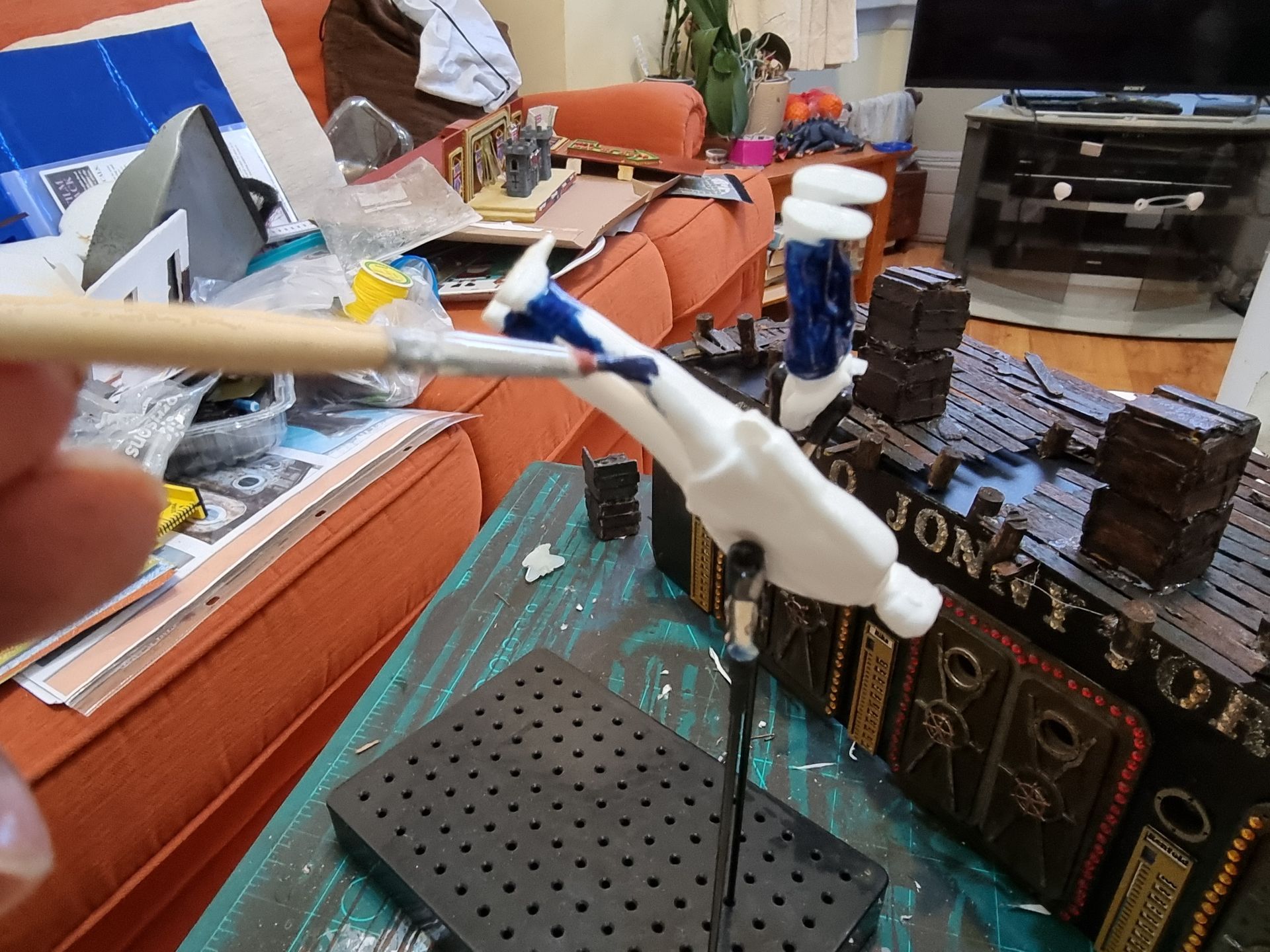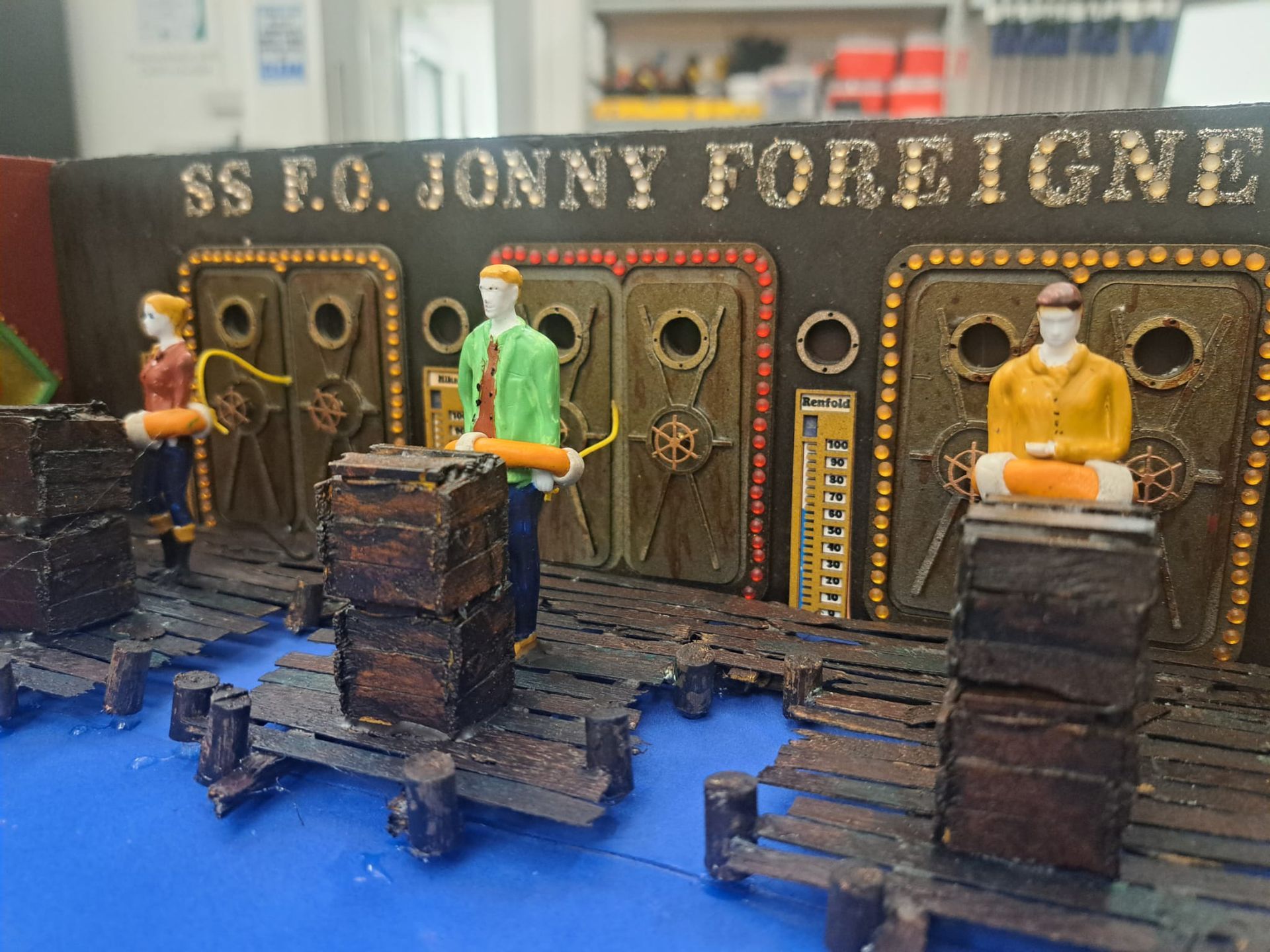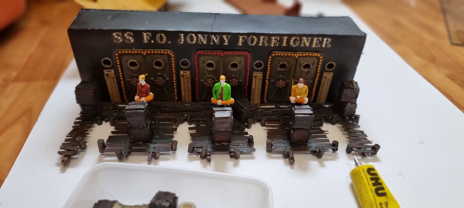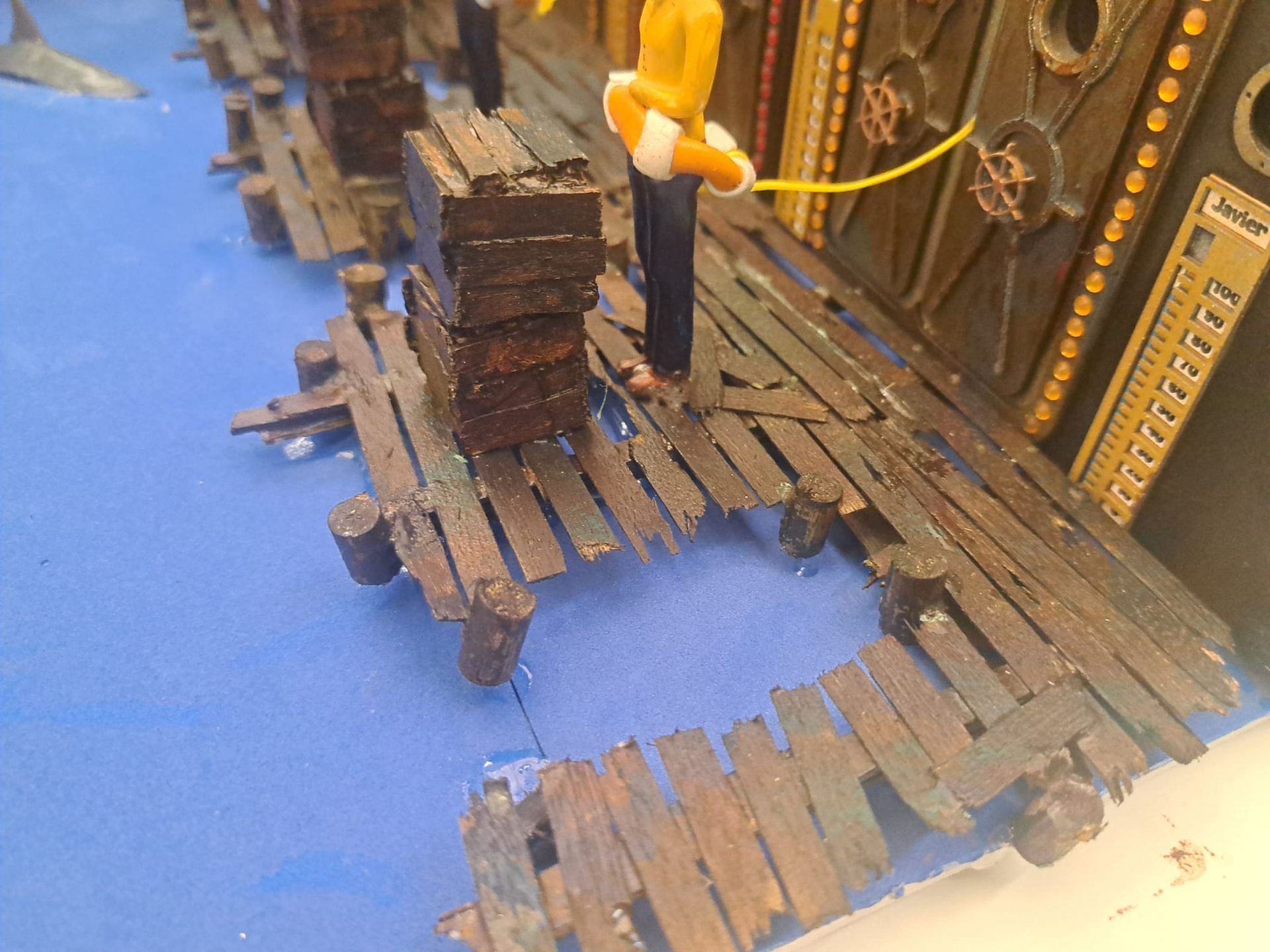 These figures where superglued onto the dock. This glue was painted over and simulated planting onto the glue resin.