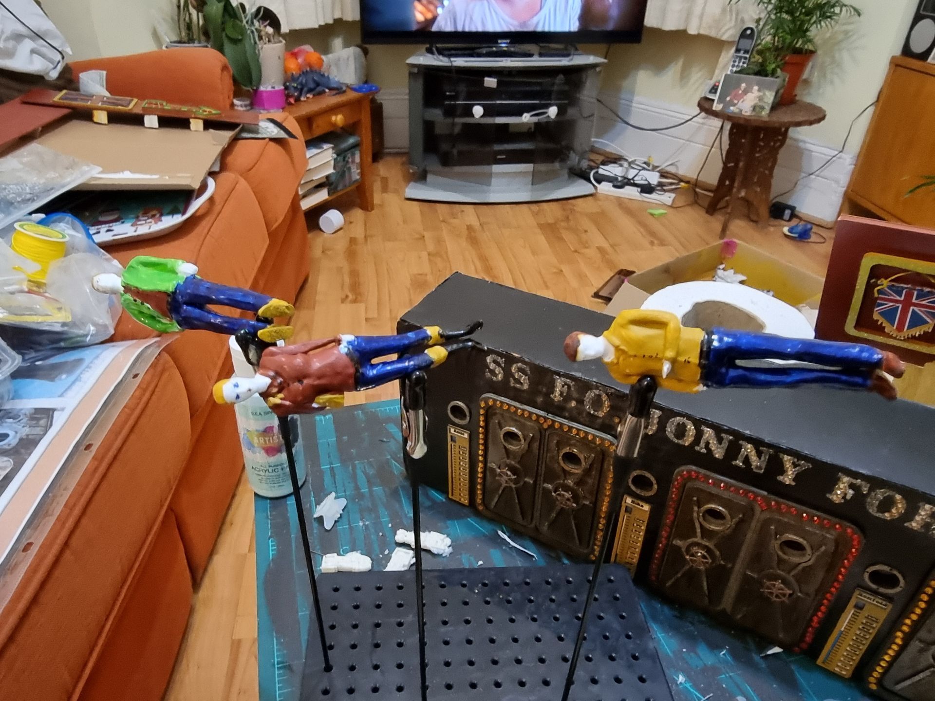 I purchased 1:25 scale figures. I painted these using the same spray paint into lid to make paint pots. This provided a strong but thin paint.