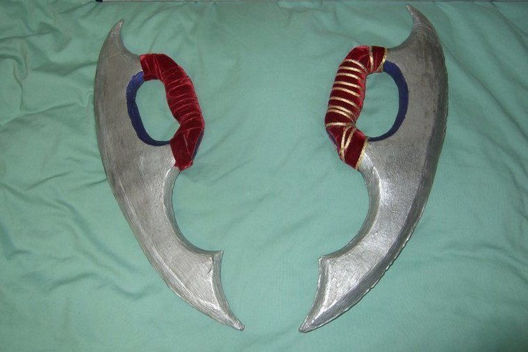A form of short sword / large daggers used in a pair held in a backwards hold, effective in whirling, slashing and stabbing styles. Excellent at hooking opponents and their weapons.