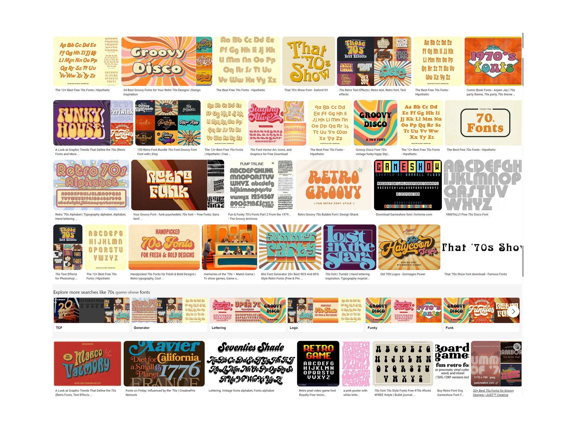 The game show was set in the 70s so the fonts that needed to be chosen needed to me 70s style. These tended to be :