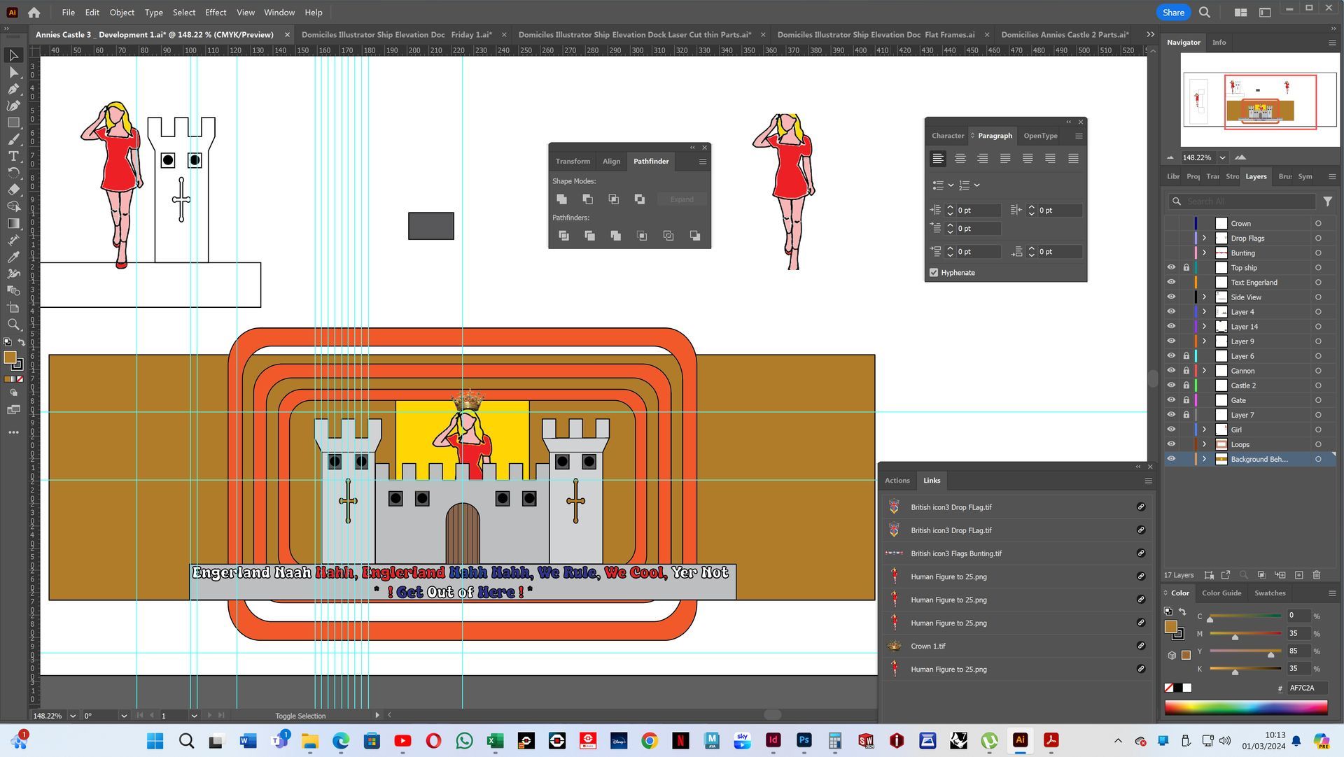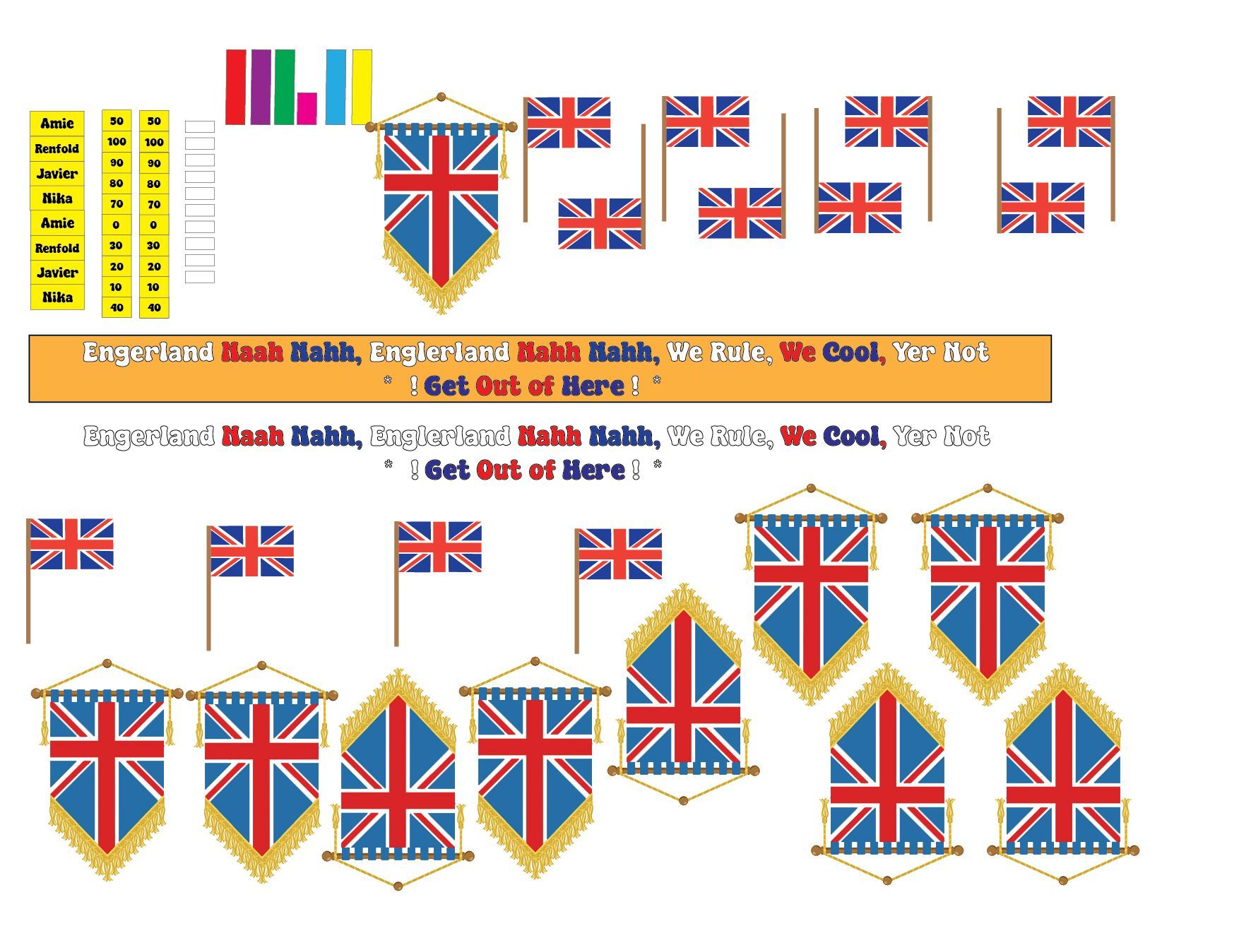 As finishing up the castle wall I added in 70s style game show set decoration such as round corner, rectangular loops and lines of lighting up bulbs (on in my case stick on plastic rhinestones) and I added drop down union jack flags to push the nationalism and sense of power.