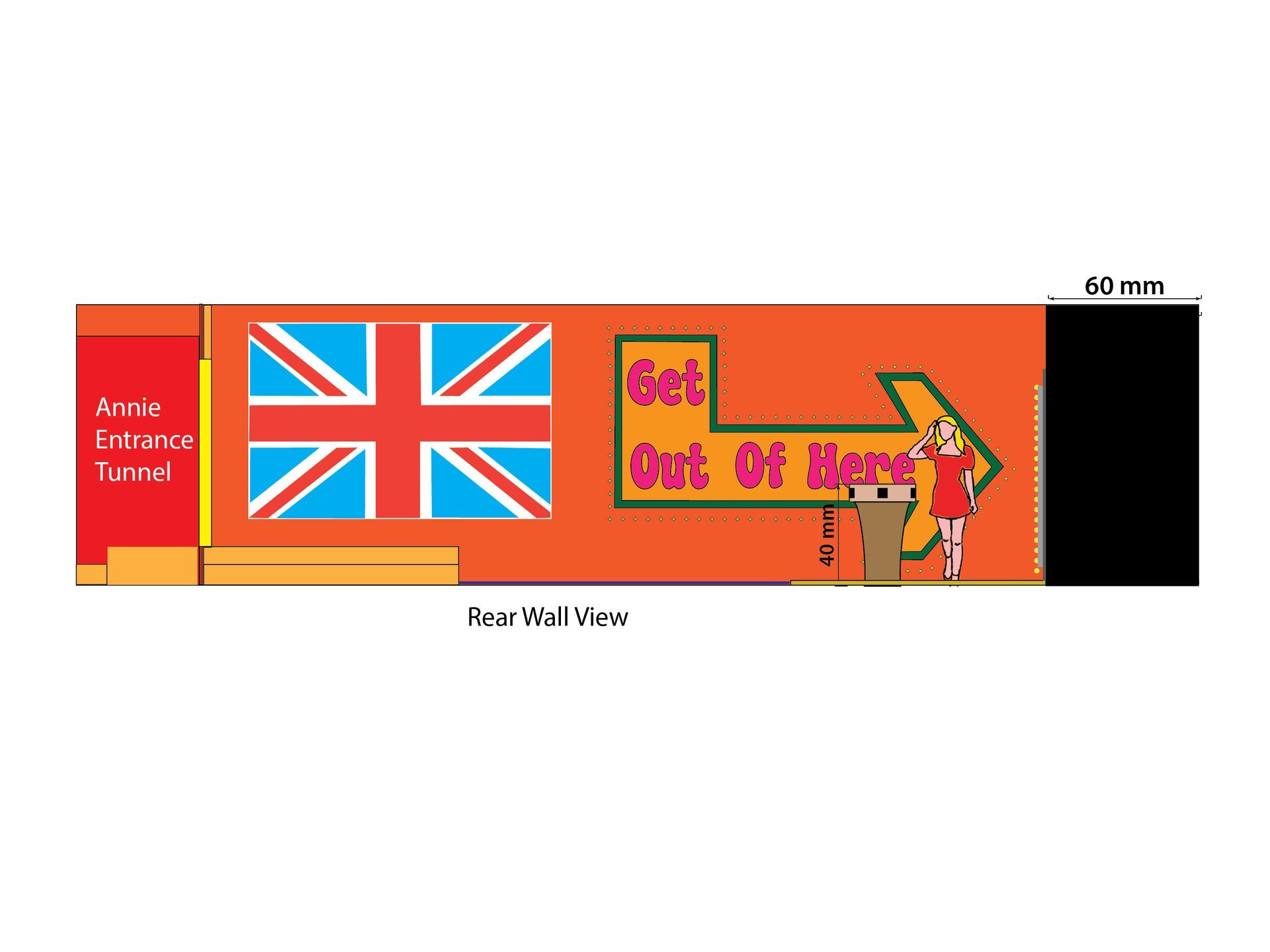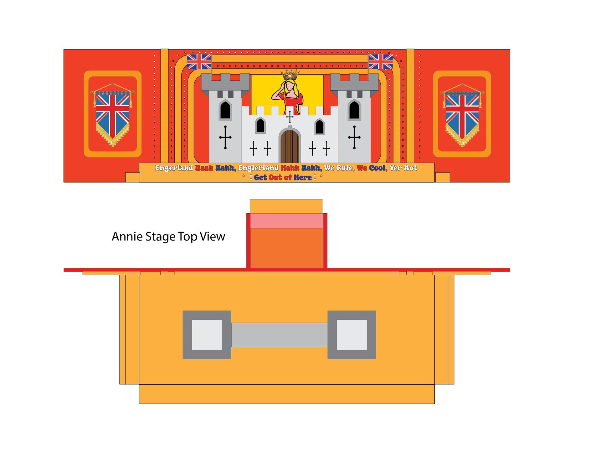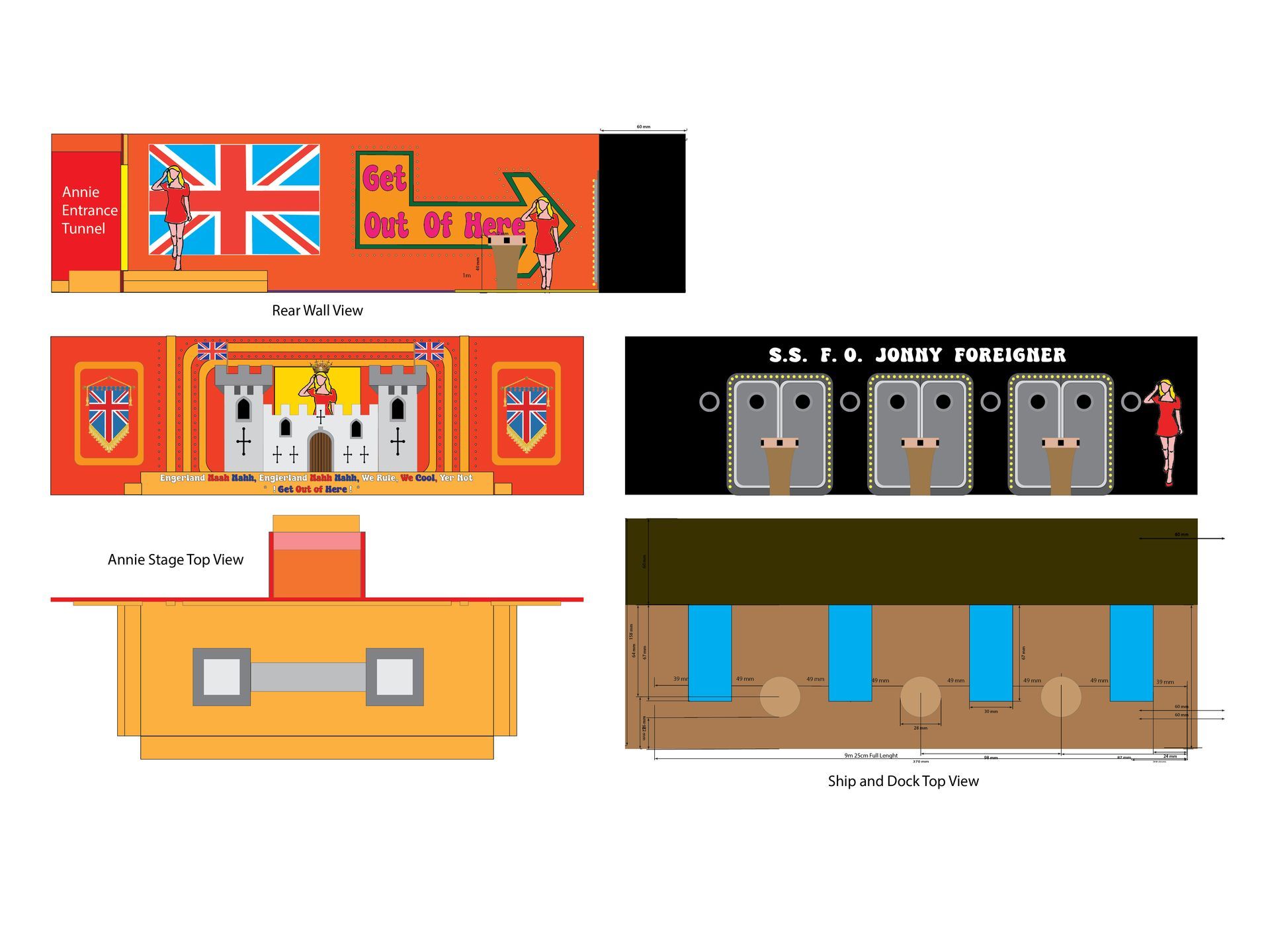 The set walls that make up the backdrop to Amie the host’s castle stage. The rear arrow and union jack wall, plus the ship would be made from standard flats. In the case of the castle rear wall, it needs to be measured around the host gate.