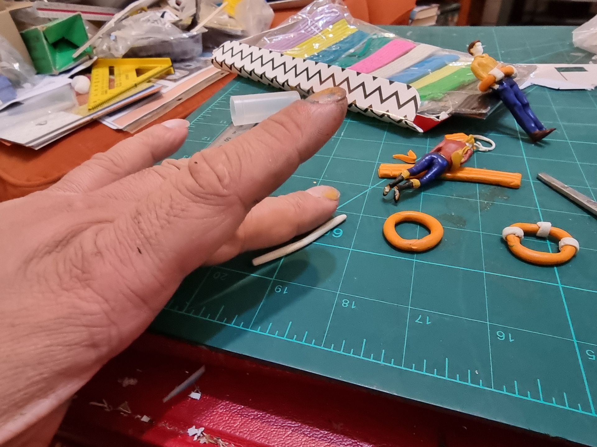 I created life rings with oil based coloured clay Plasteline.