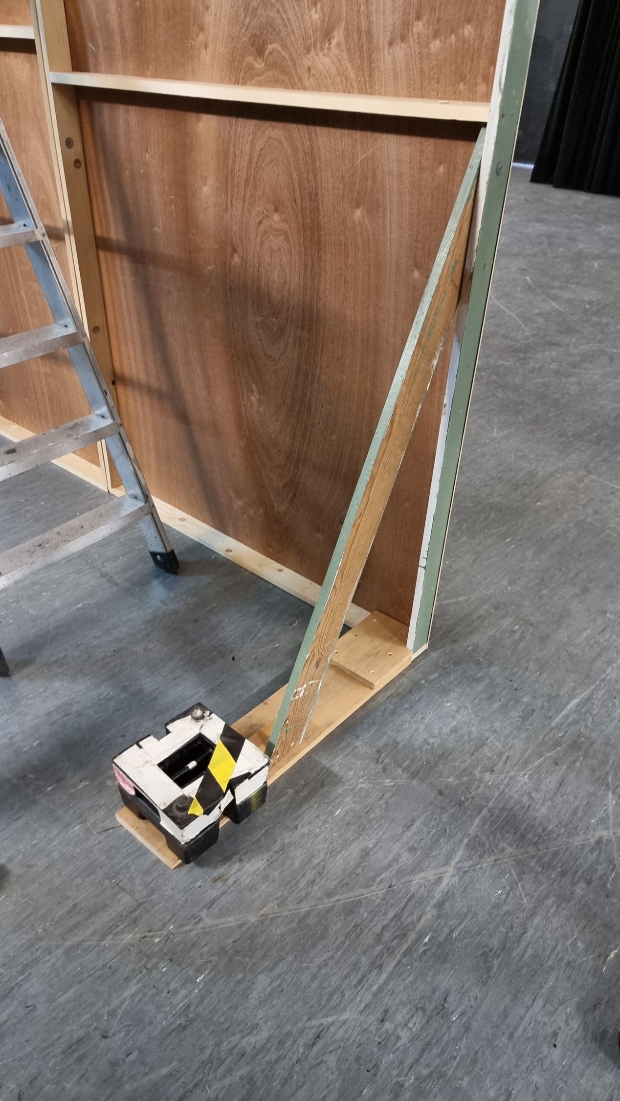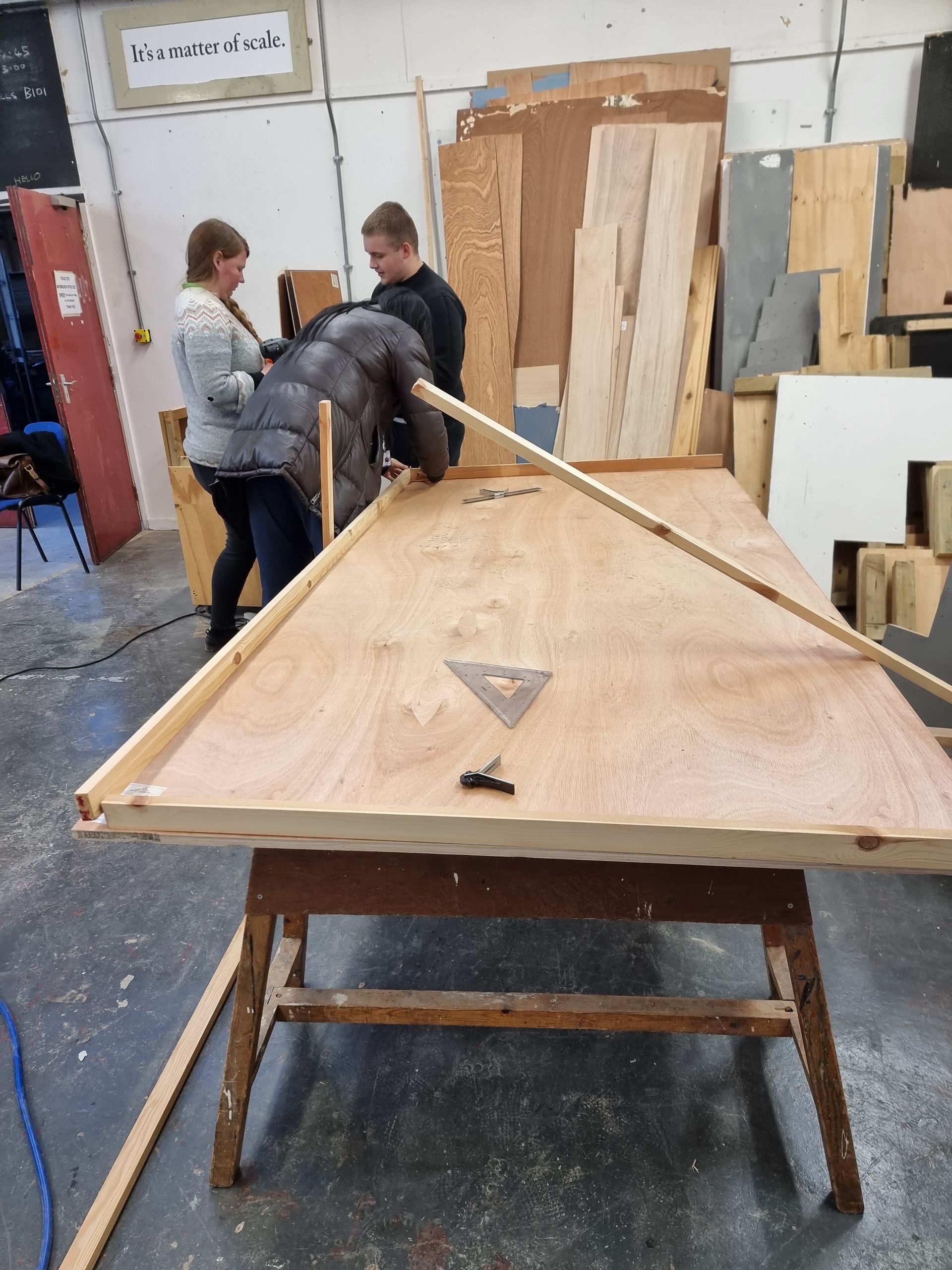 Below is the set construction as we learned to build flats. We were in different groups building the flats but did not get to use the table saw. I added addition coats and touched up paint on the dummy. I also did the creative work on the drop-down transportation flag. Harriet had connections to turn my photo bashing from weird vehicles and sketches into metallic foil printing on material due to connections she had.