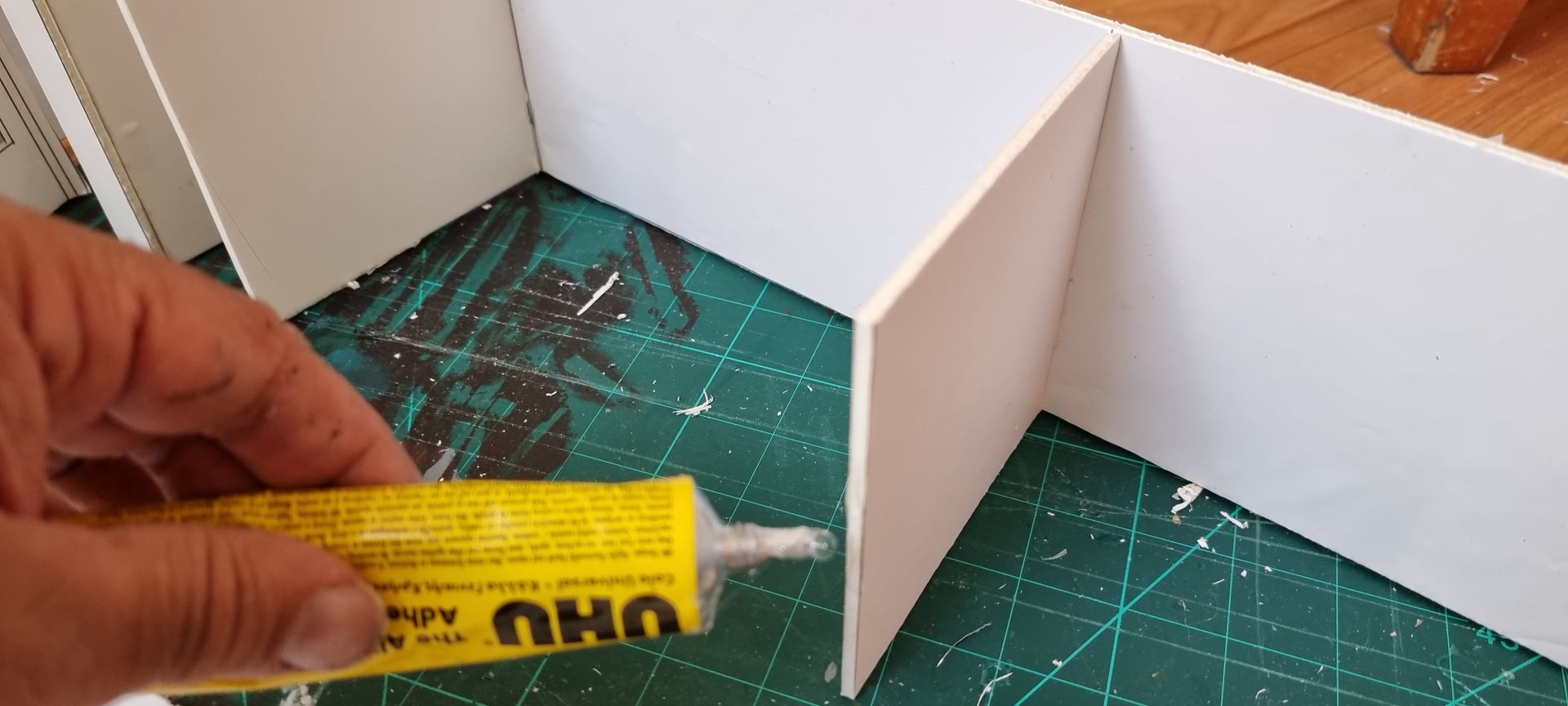 These were then photo spray mounted to the flam board which was stuck together by combining superglue and UHU glue , using the superglue as the holding mechanism and engineering squared used to make sure the walls were perpendicular and vertical