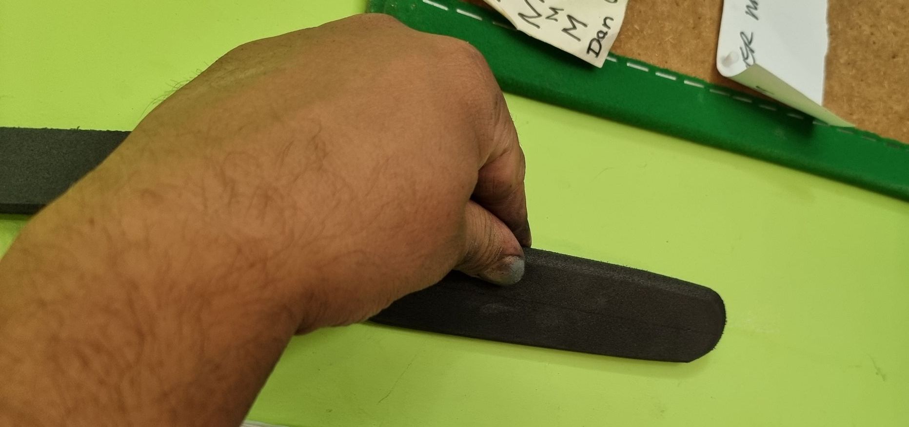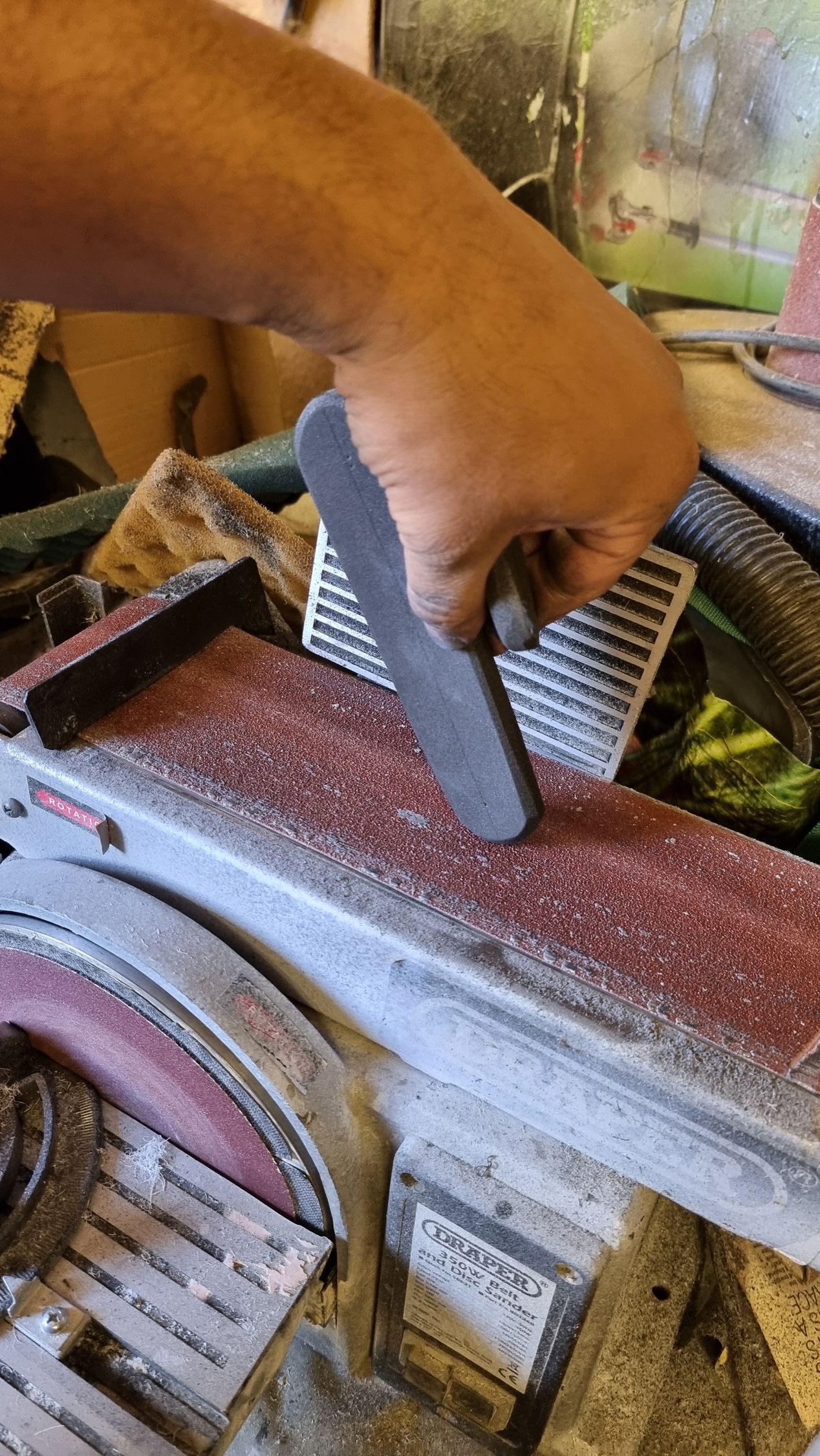To curve the ends, I used the belt sander. Then I heated the foam and pressed this onto smooth surfaces to smooth the surface so it would look more metallic before spray painting.