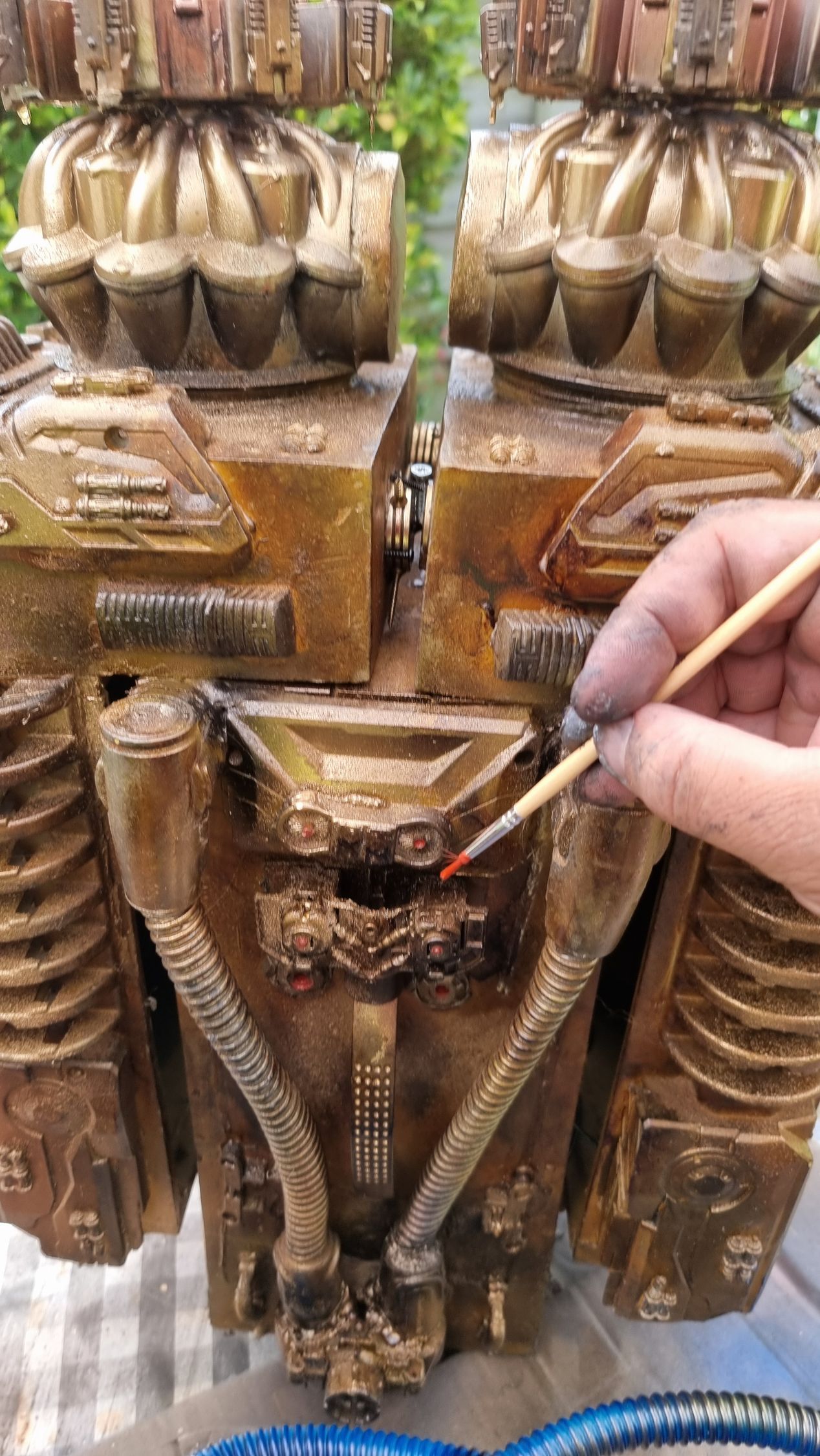 I used a range of paints. Mostly primer, them black then a light dusting spray of old gold, dirty down rust and khaki which gives a bronze like tone.
