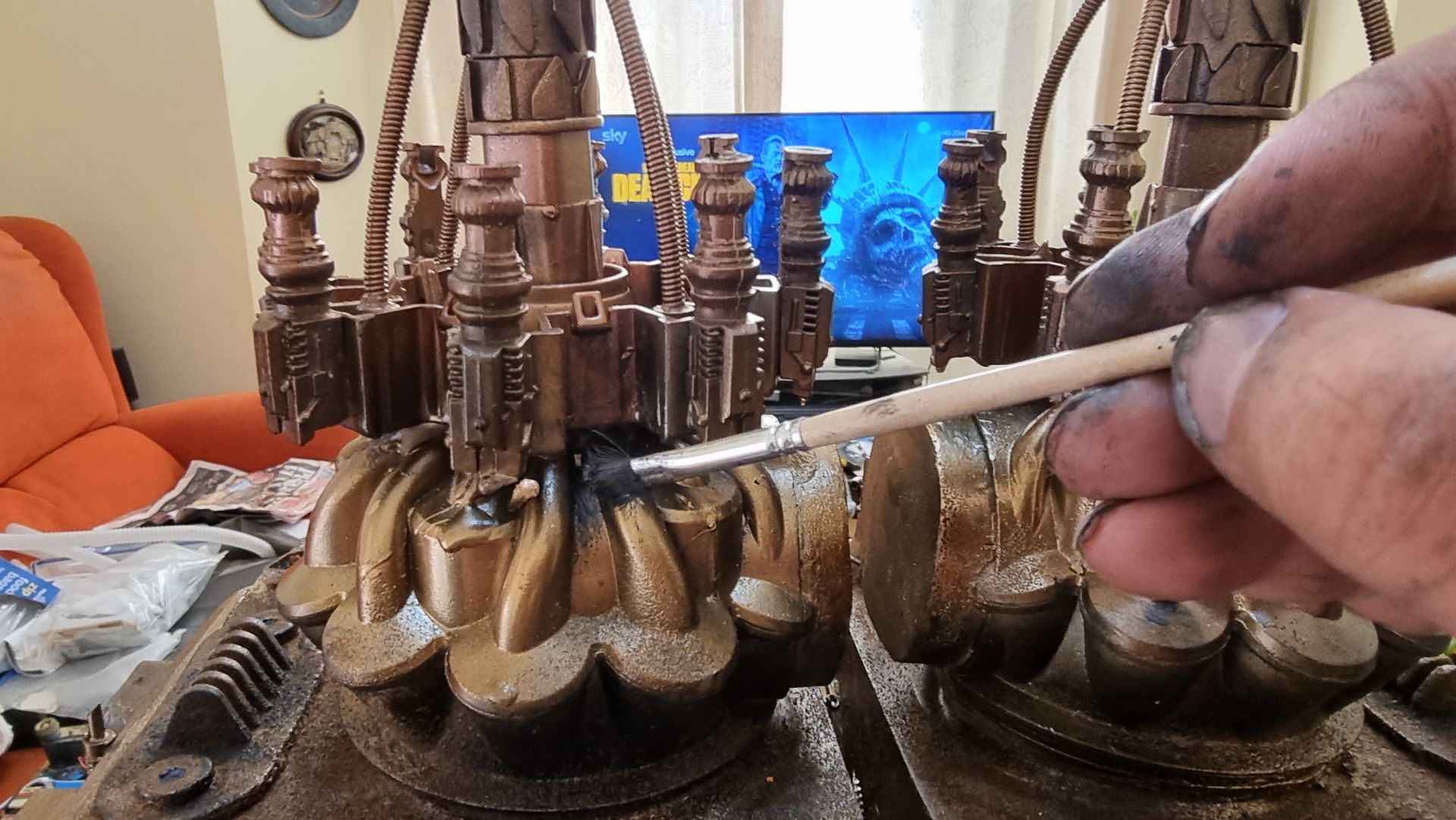 The chopped-up Nerf gun, hair dryer, Warhammer and fast cast resin parts were painted in blend of aged gold, black, copper, dirty down rust, black and khaki dirty down. Generally, after primer, a black layer then light dust over in gold. This gave a bronze look, then added the washes making the appearance patchy.