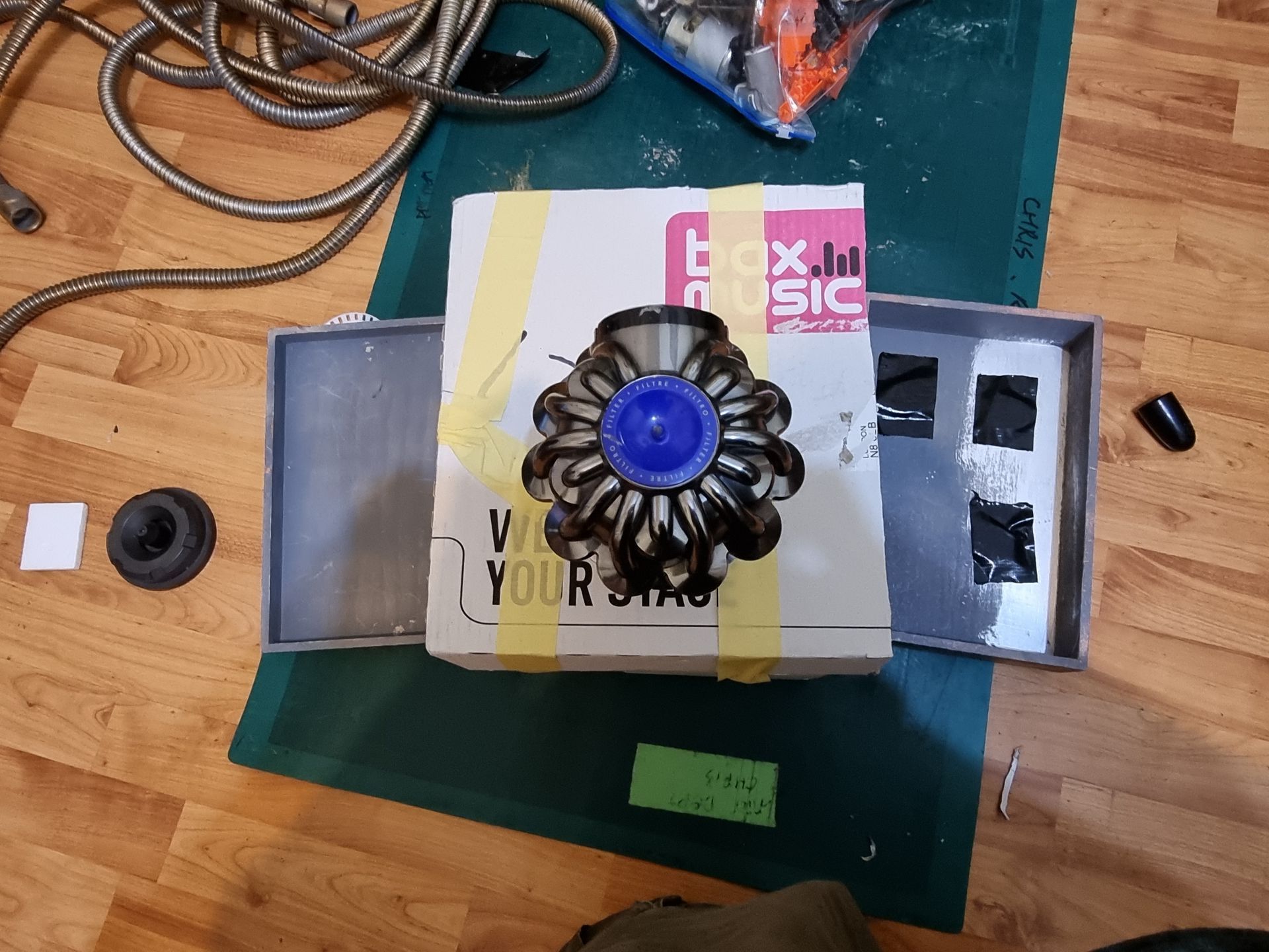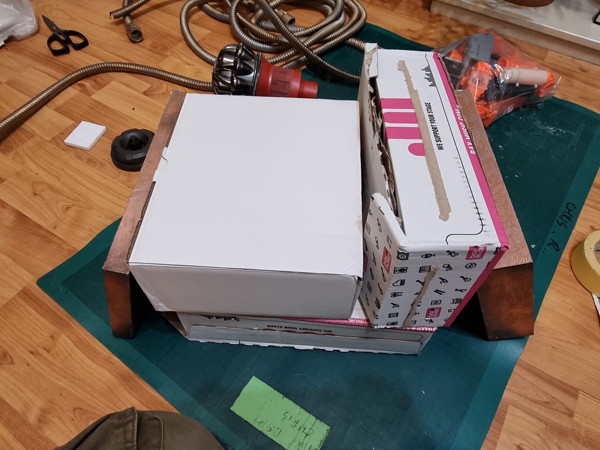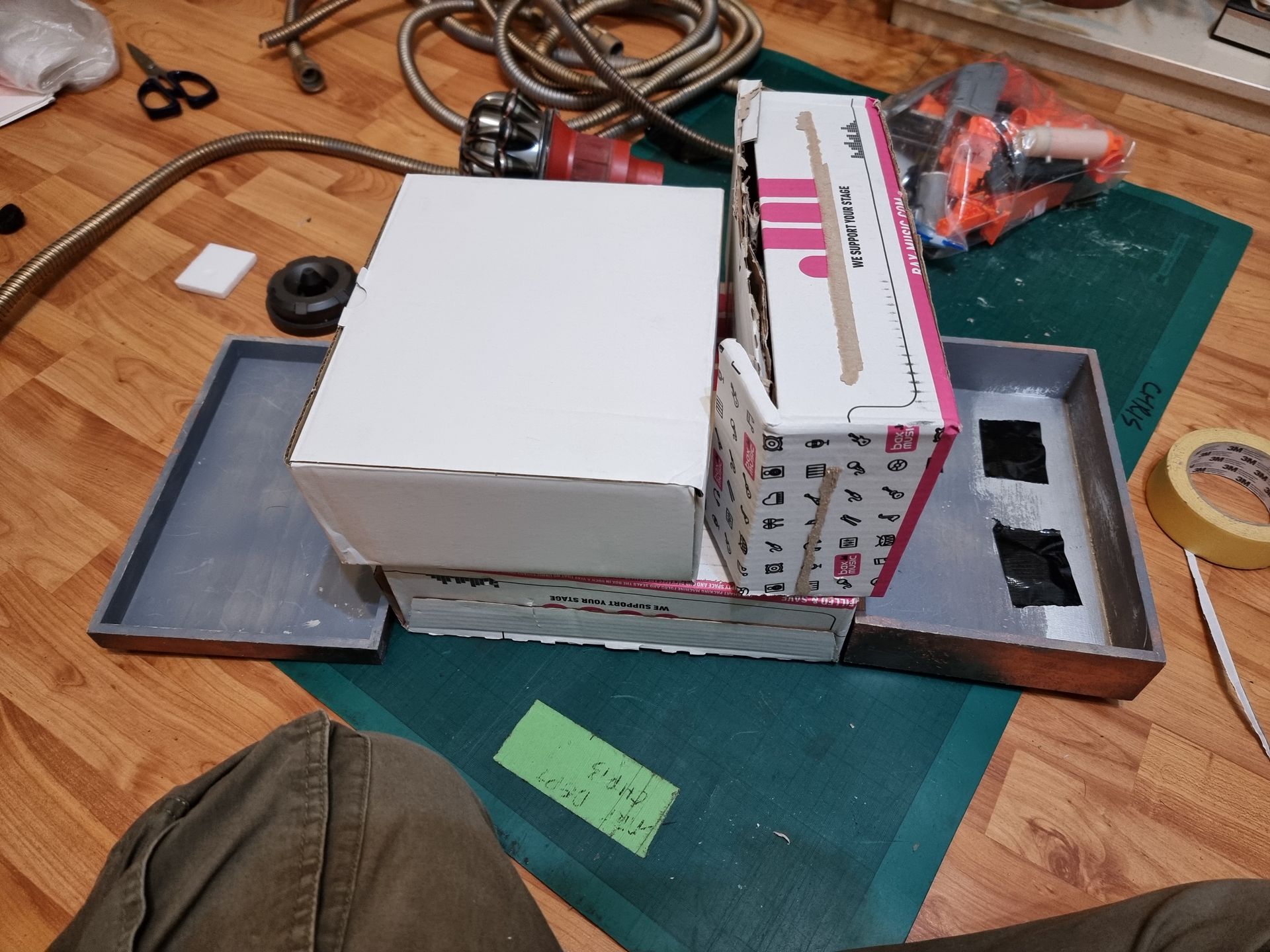 As I started to pick up set decoration to help kit bash the prop I started to prototype the concept with card boxes and duct tape to look at size and mechanics of how the unit will work and fit together and what sizes to build the component parts, how to place the controls, what works what does not and how to fit it together.
