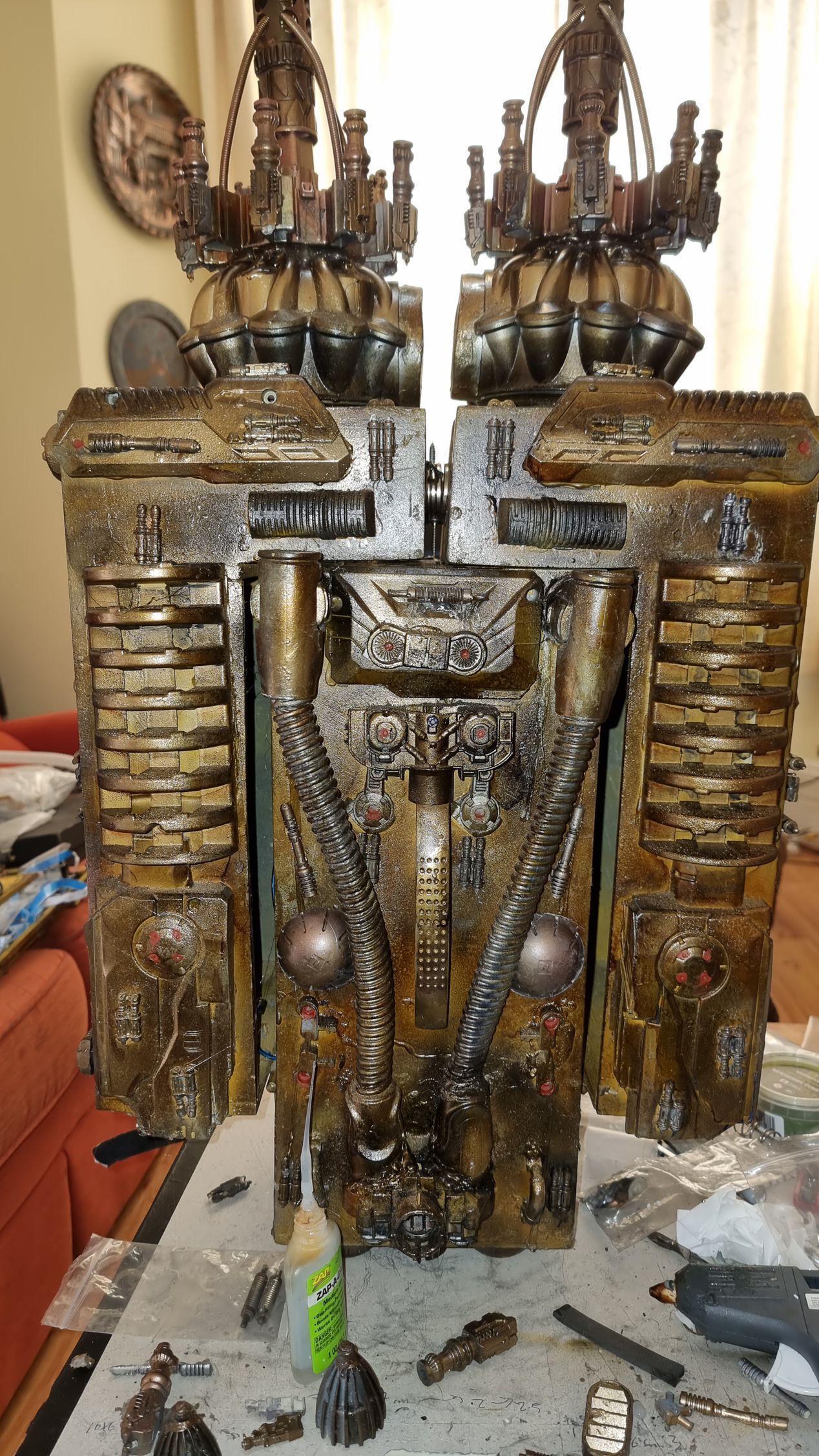 Outer brackets that had been placed in slots had filler covered to hide them. The kit bash parts also hid the brackets.