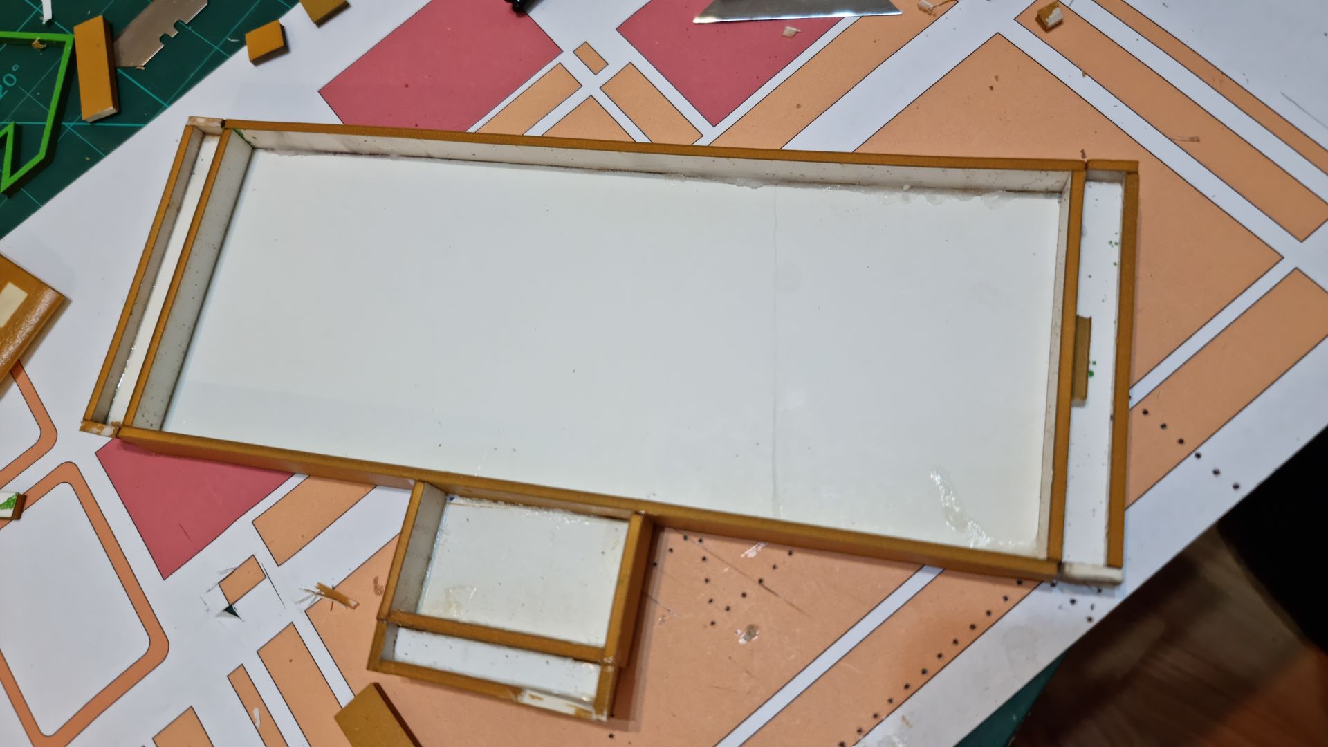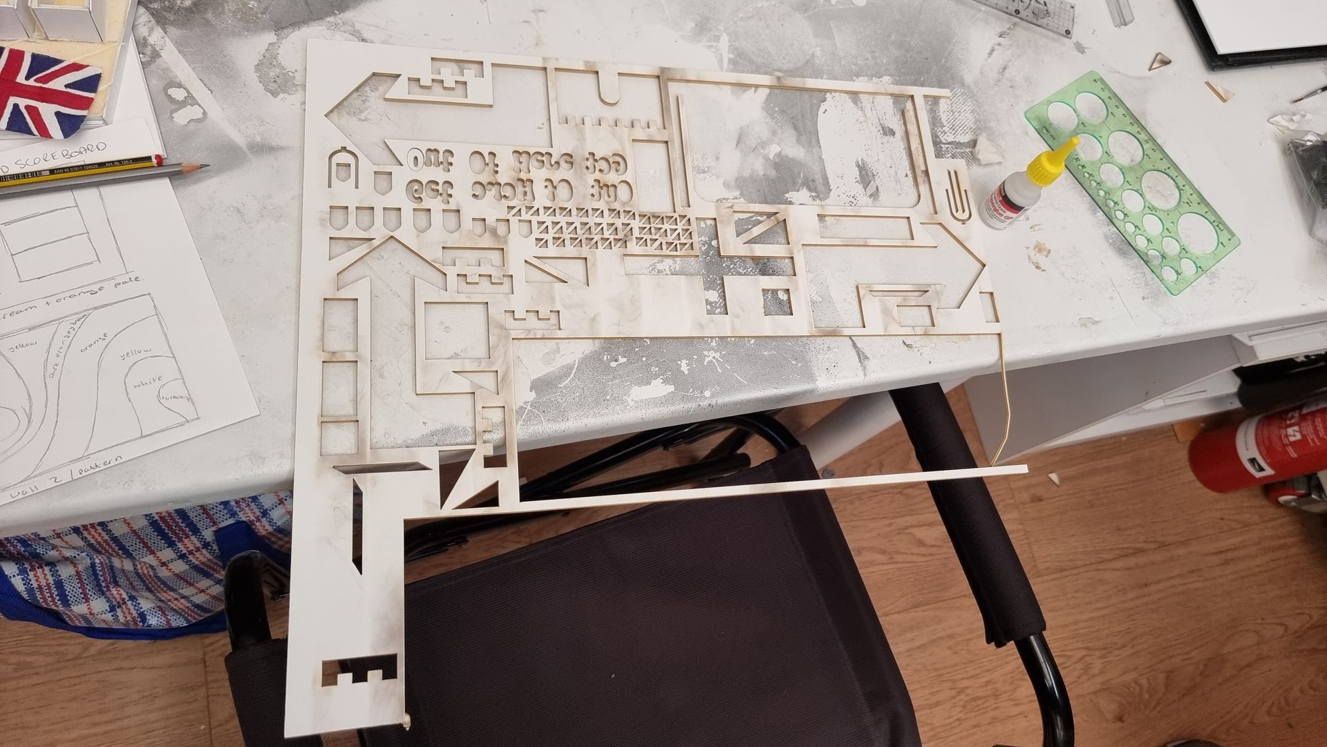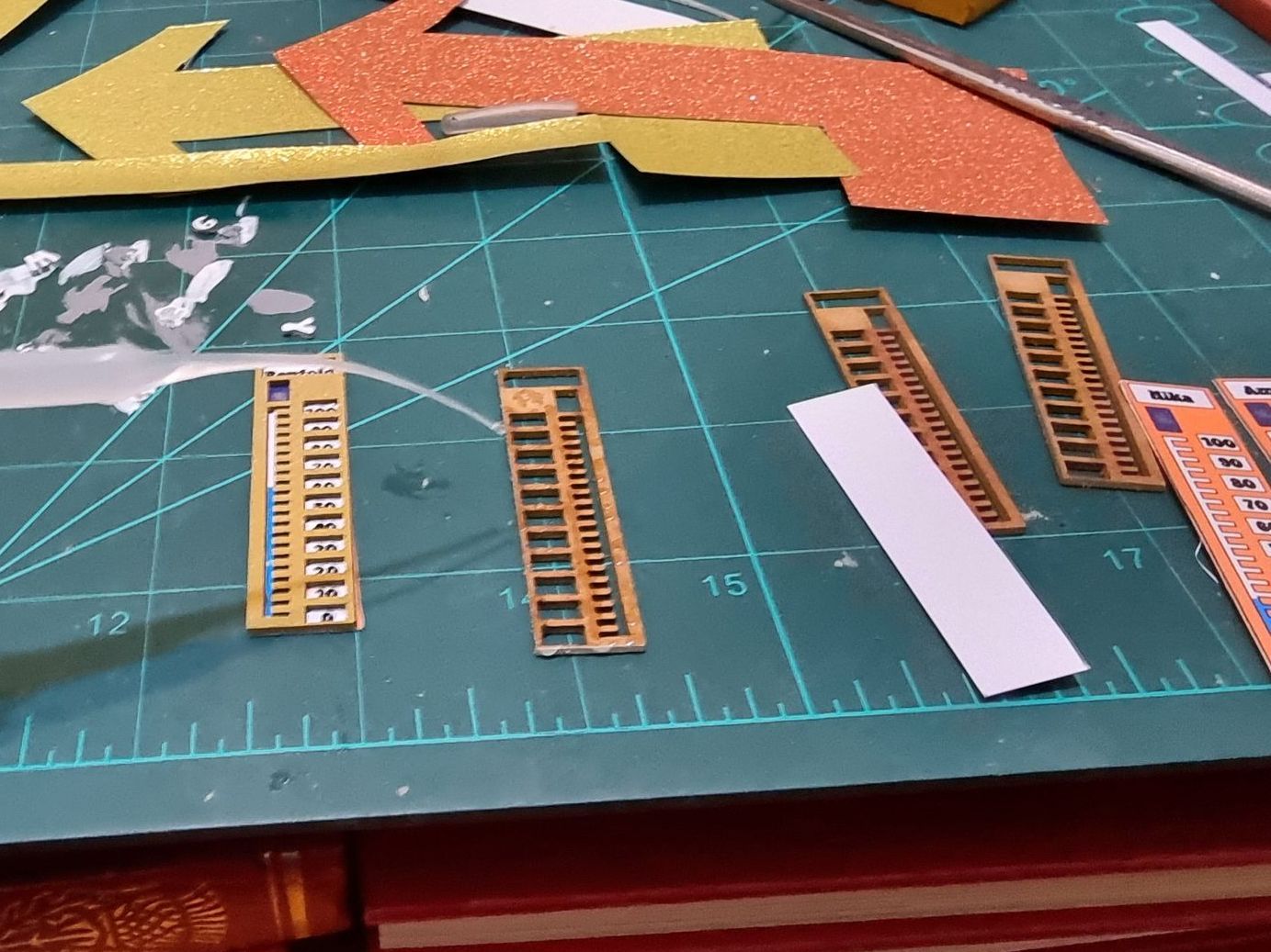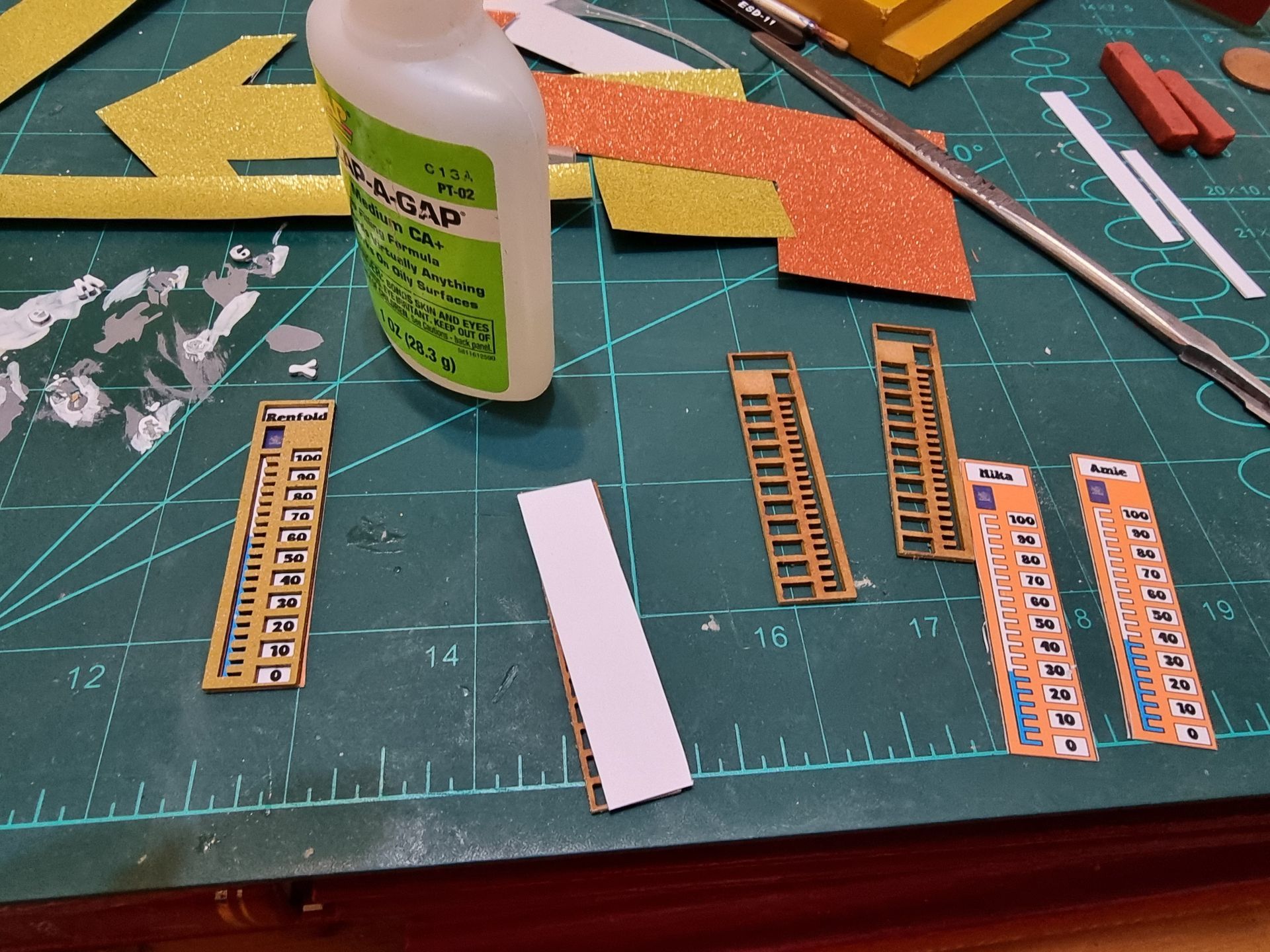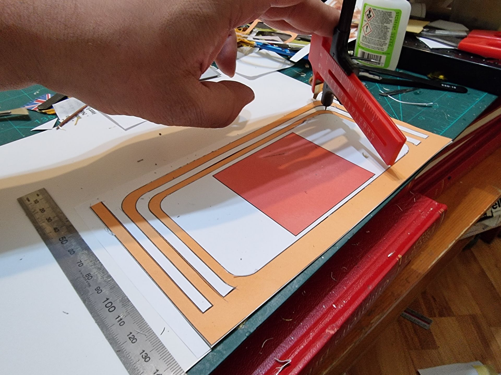 - These I decided to build in a laminated manner with white card or plastic at the back, the scale and name photo print out then the laser printed frame on top.
