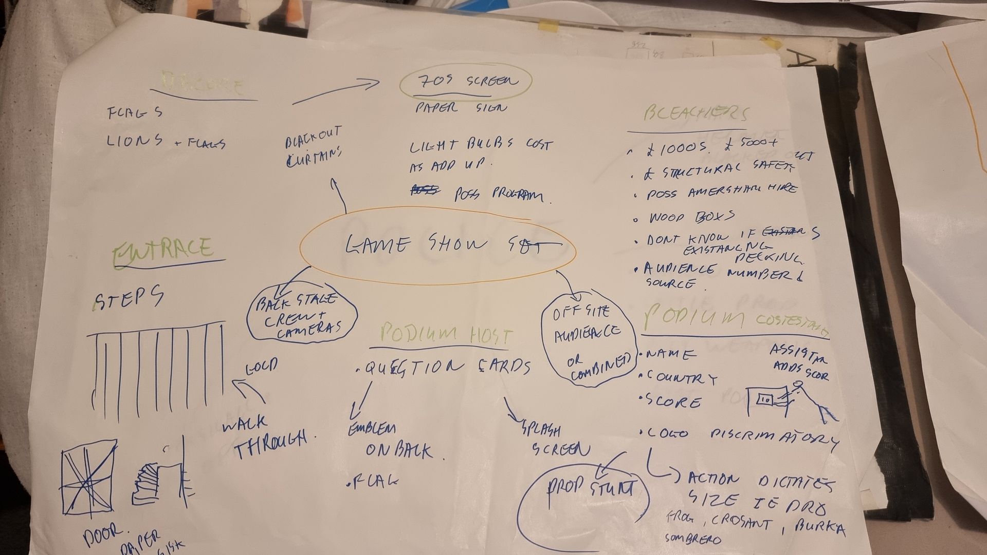 This was my bid for a competition to judge by the director’s course students, to decide which to progress to being the full-size gameshow set used in the end of year production Domiciles.