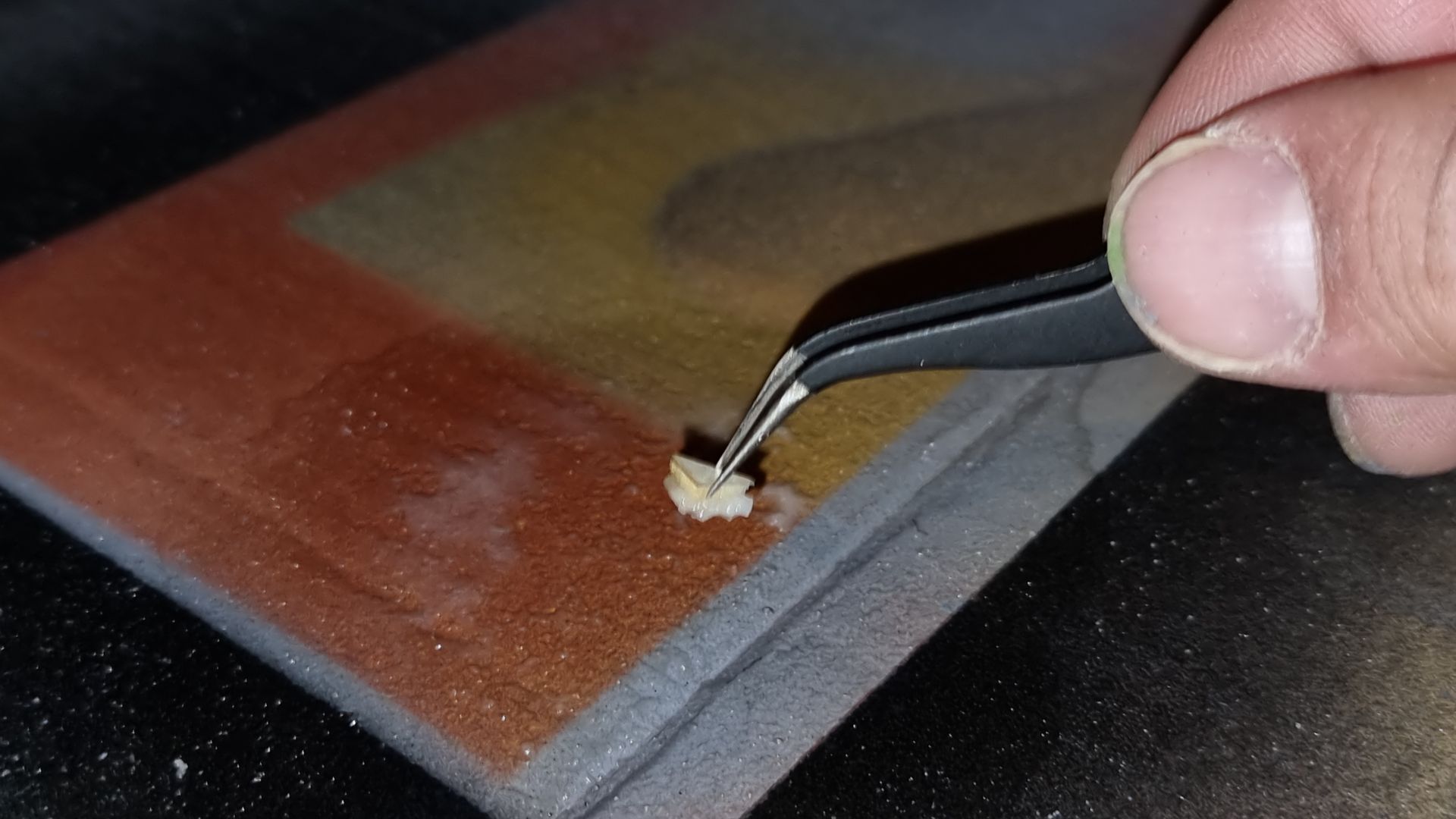 Spatulas where stuck to the underside of the rock extending back. These were glued using epoxy to the underside of the A frames stuck to the inside of the ship box, thus they acted as brackets.