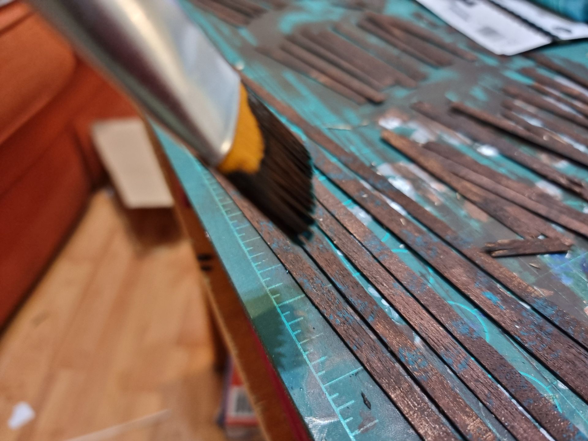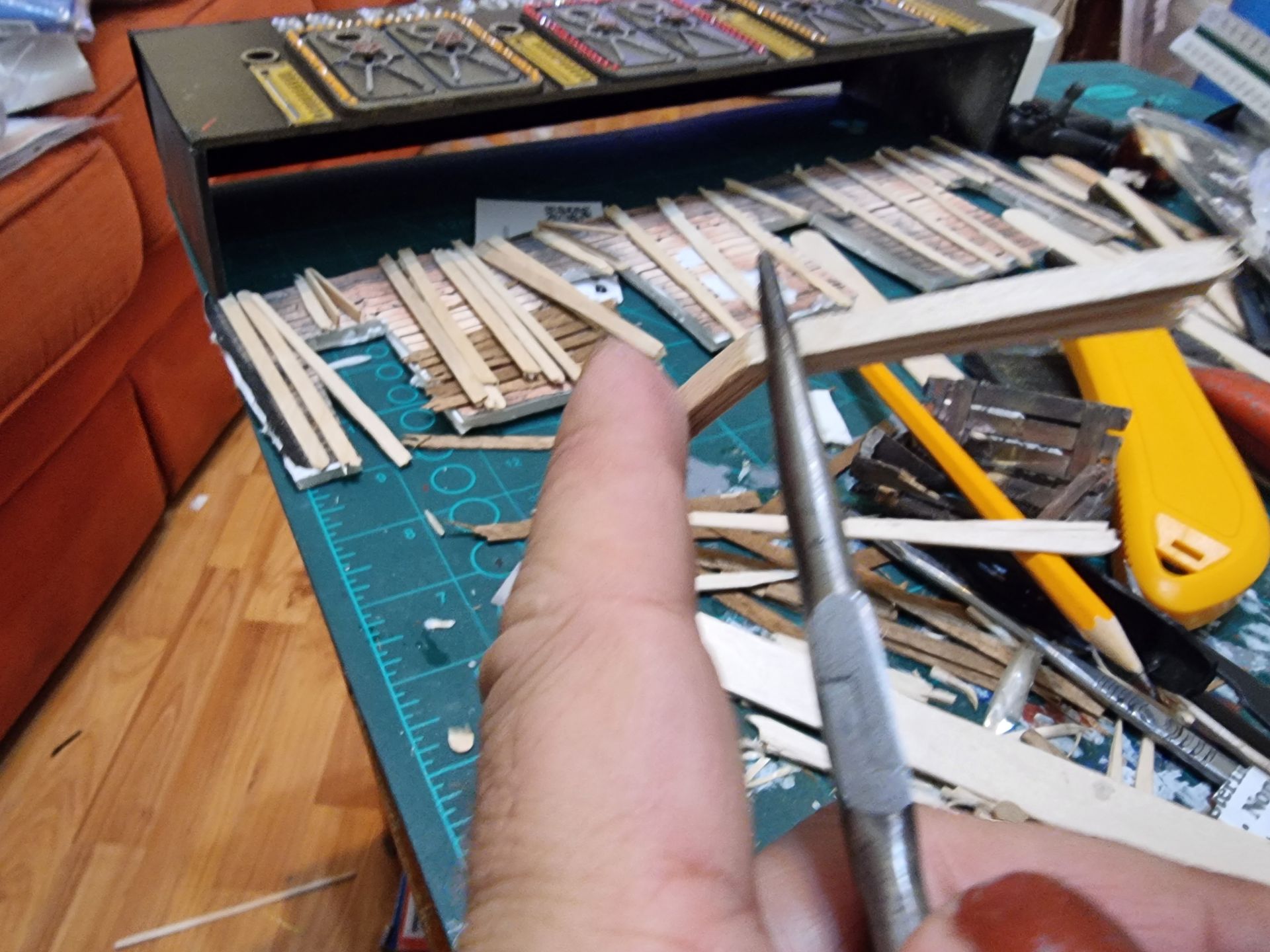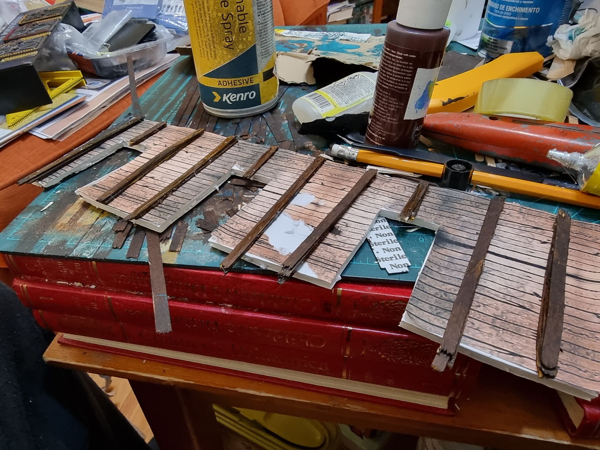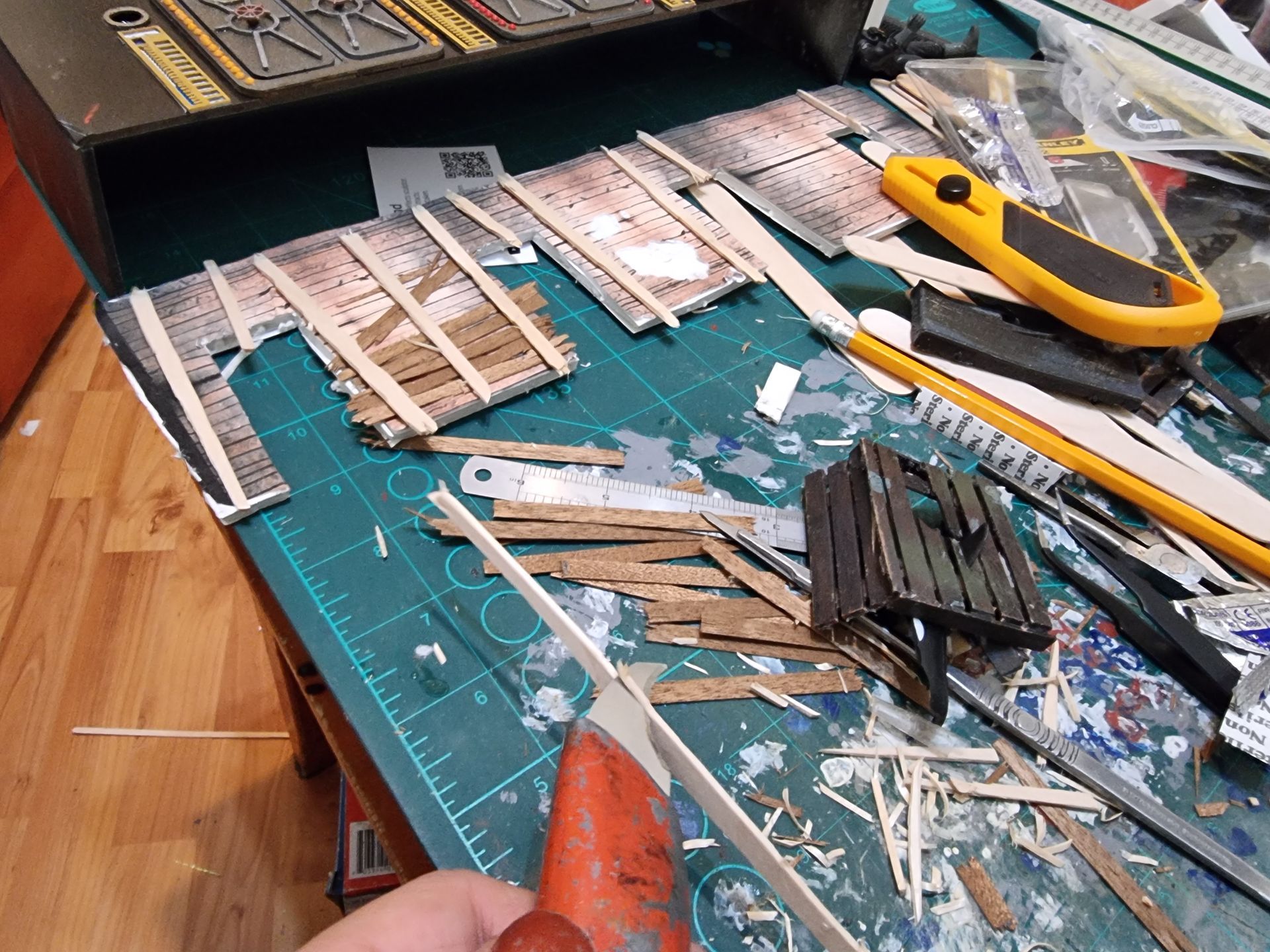 I used the original foam board with texture printout dock as a reference base to start laying out the strip planks to act like roof rafters and is the base for the new dock.