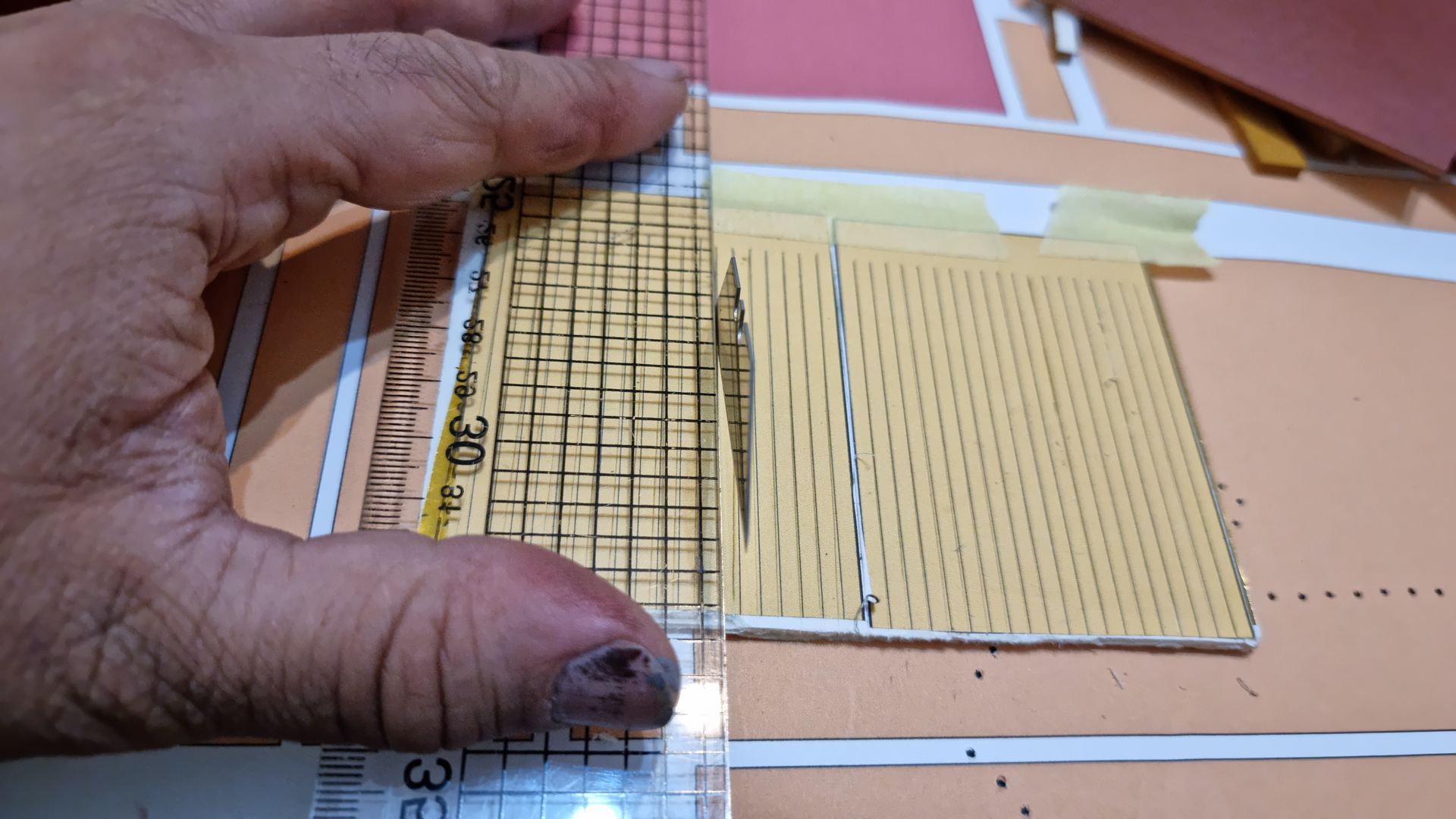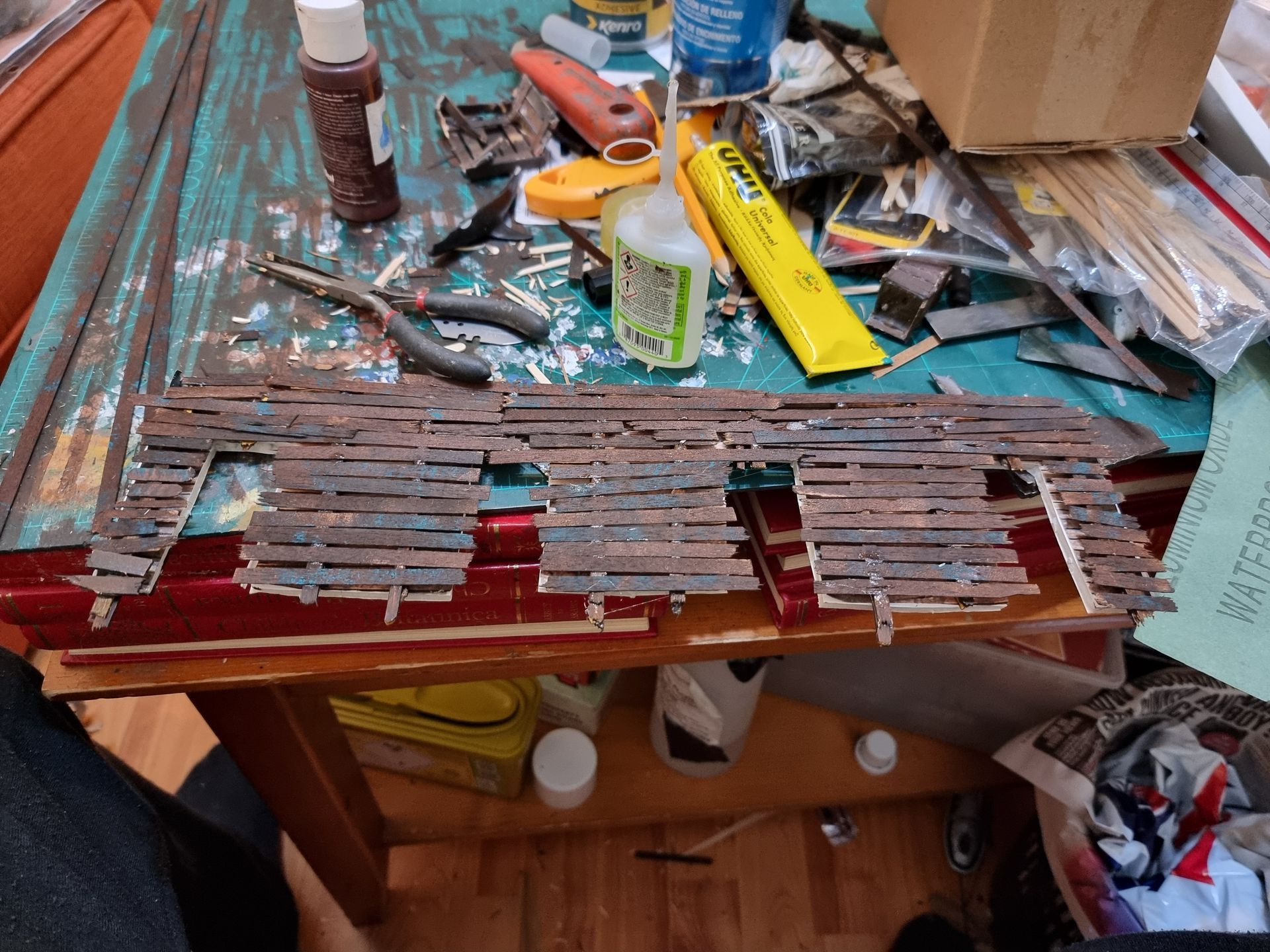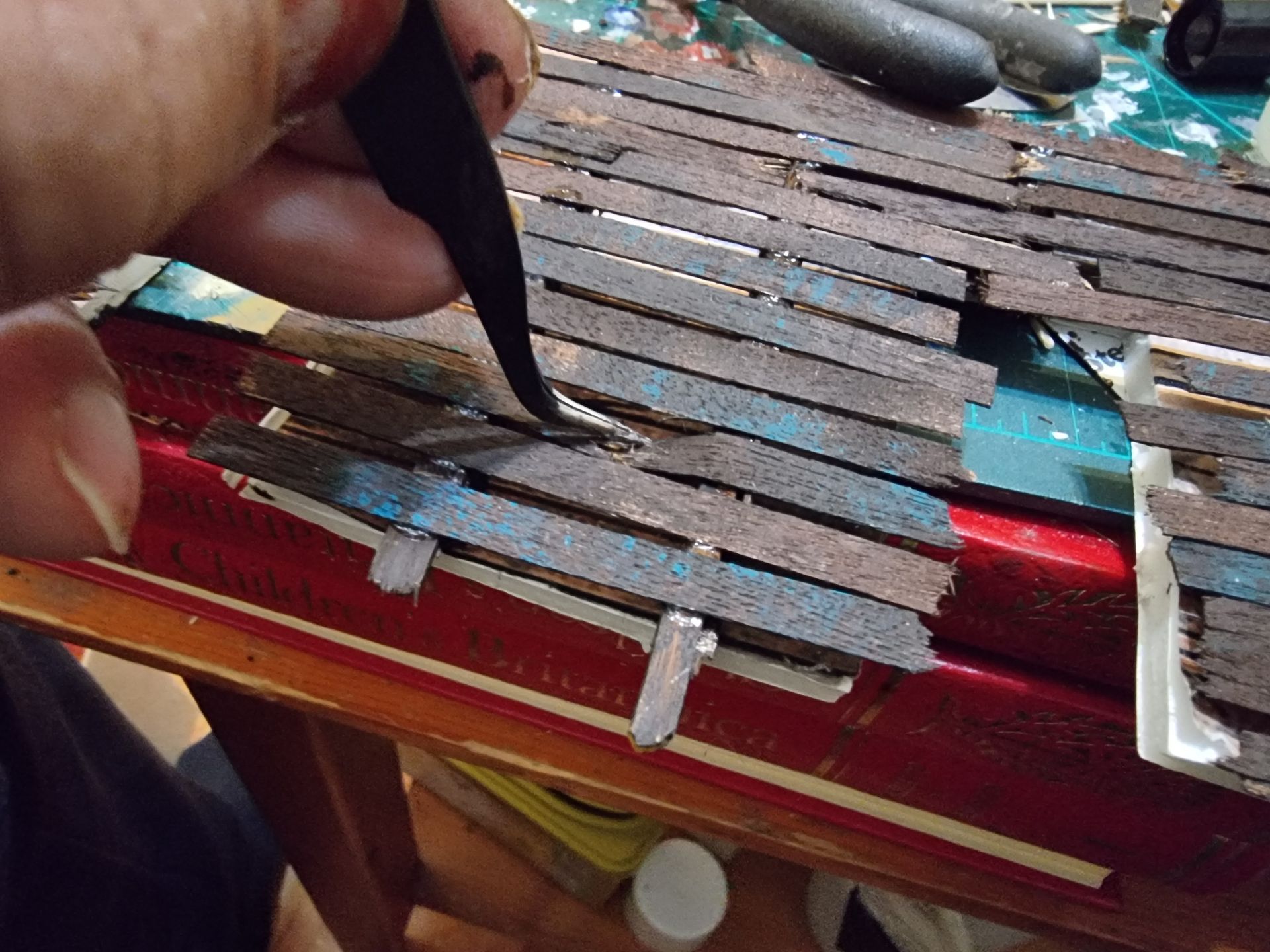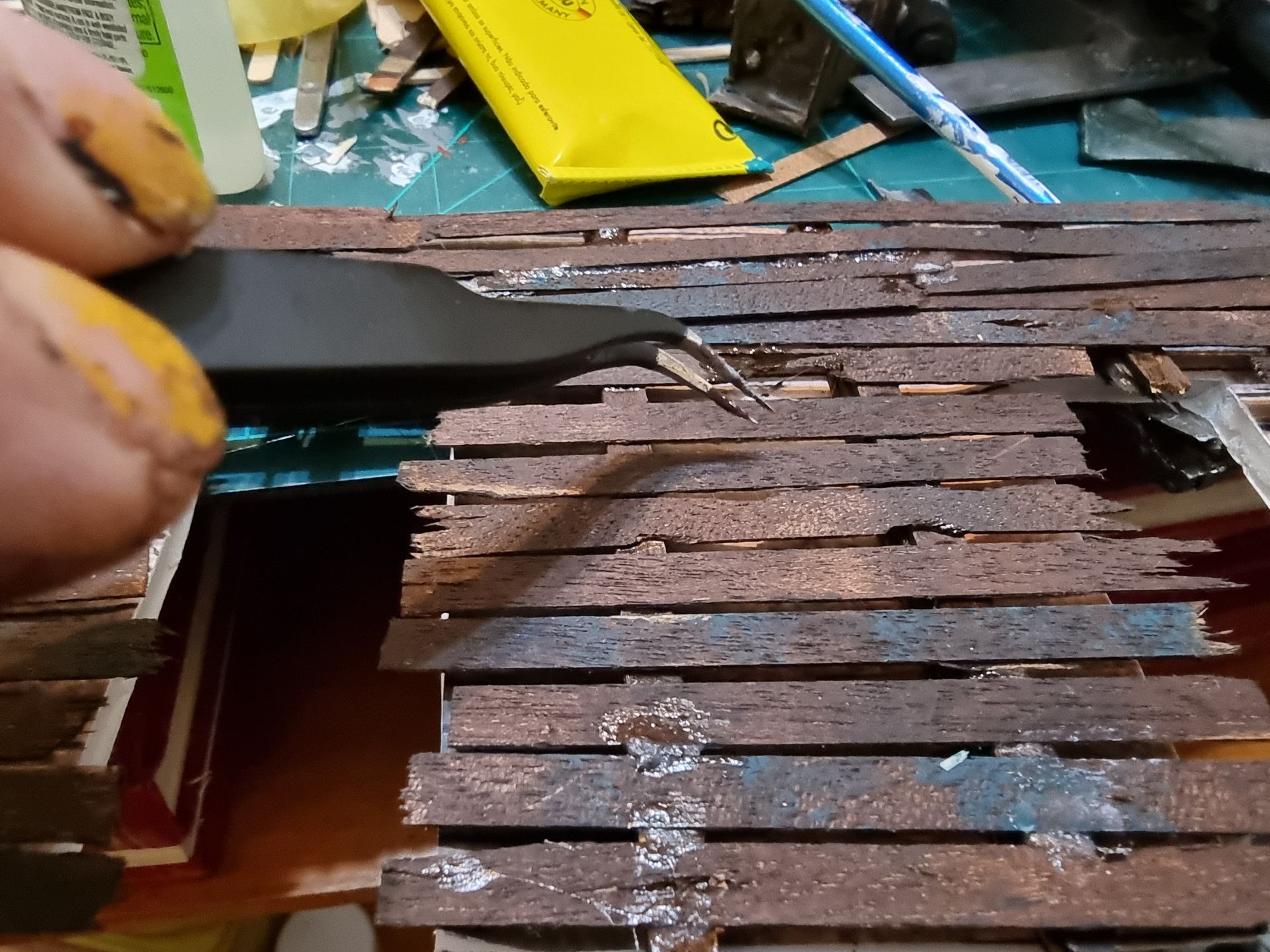 I used the original foam board with texture printout dock as a reference base to start laying out the strip planks to act like roof rafters and is the base for the new dock.