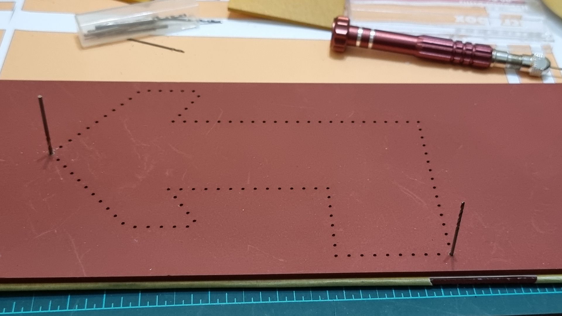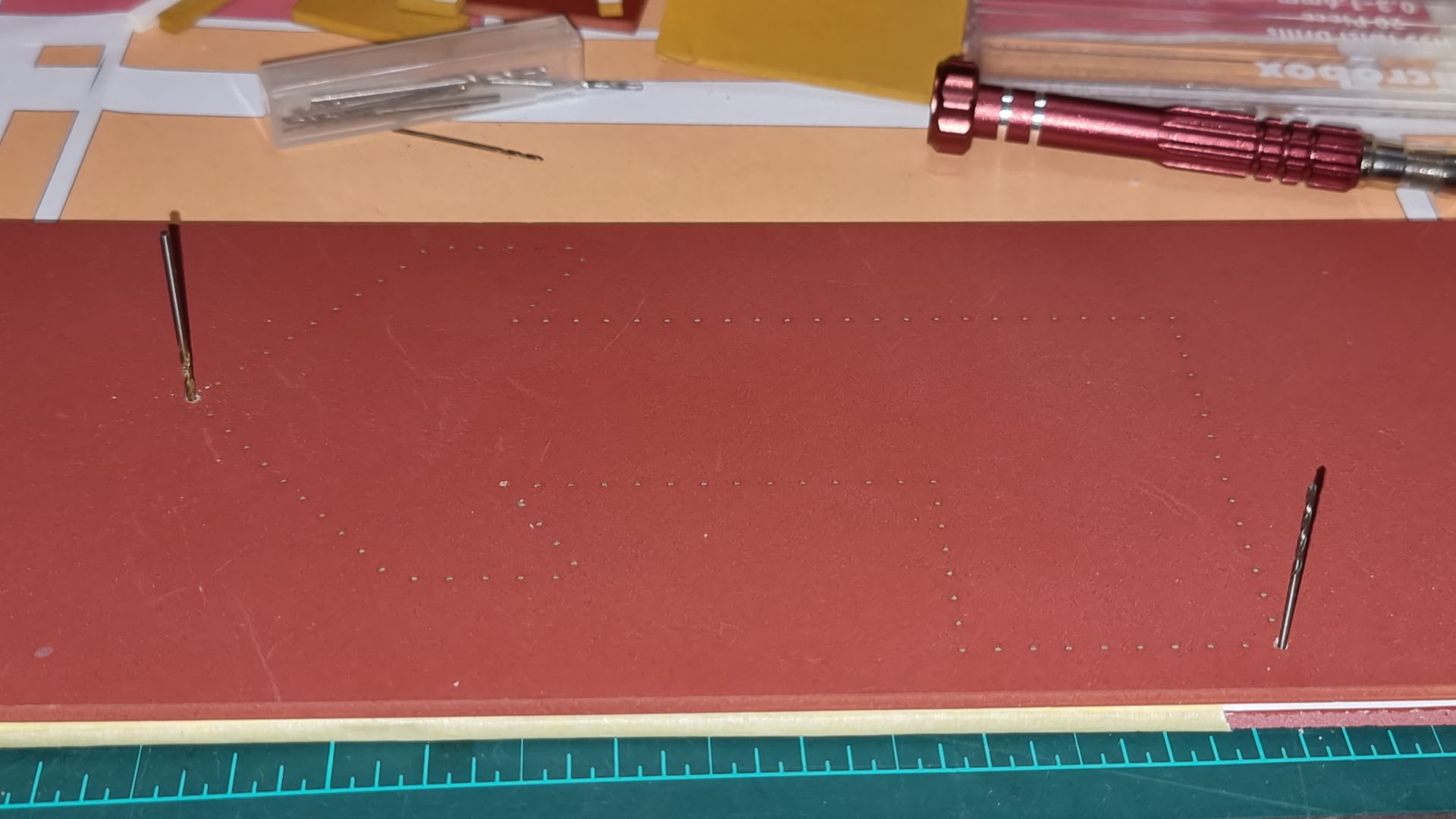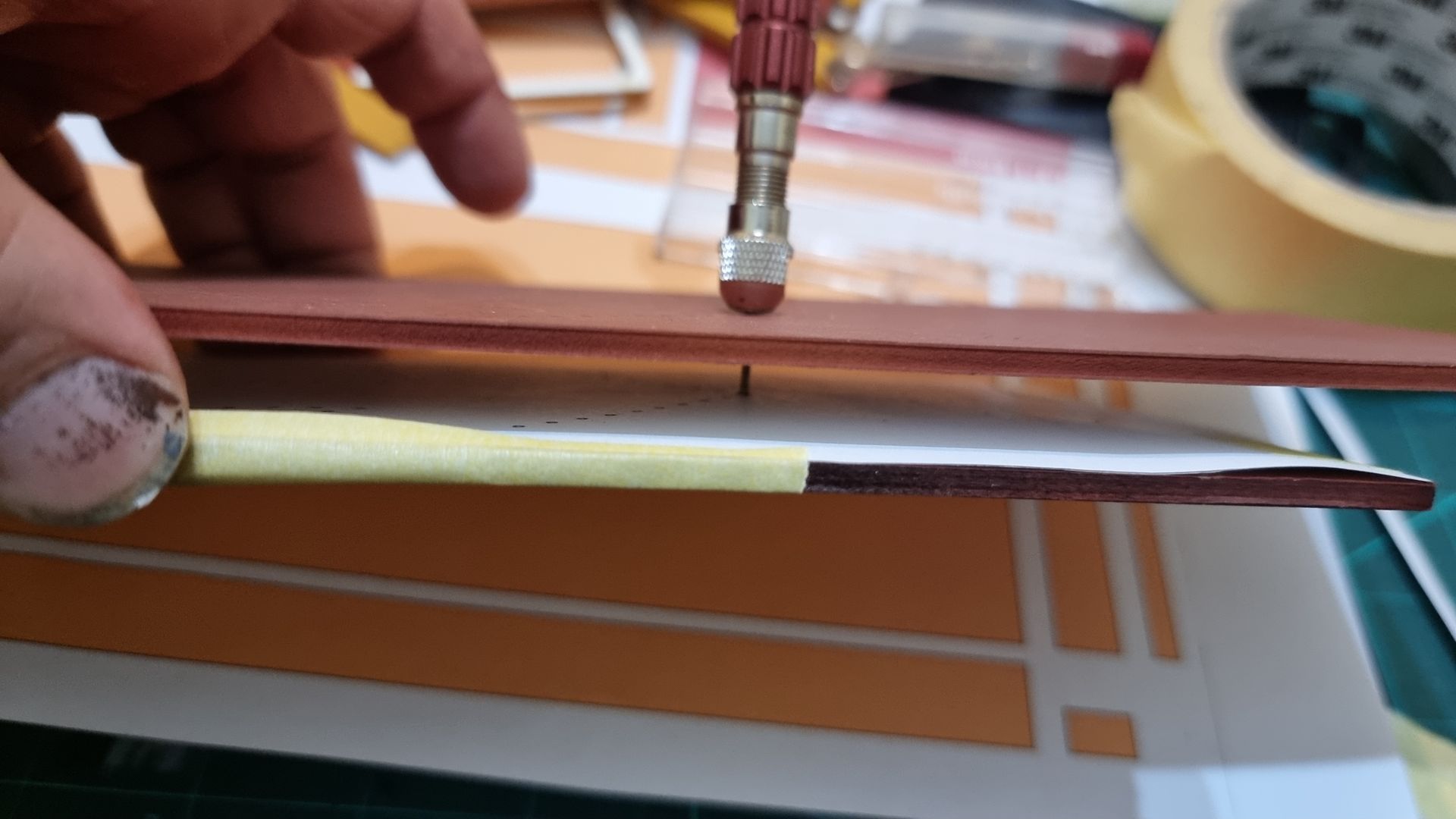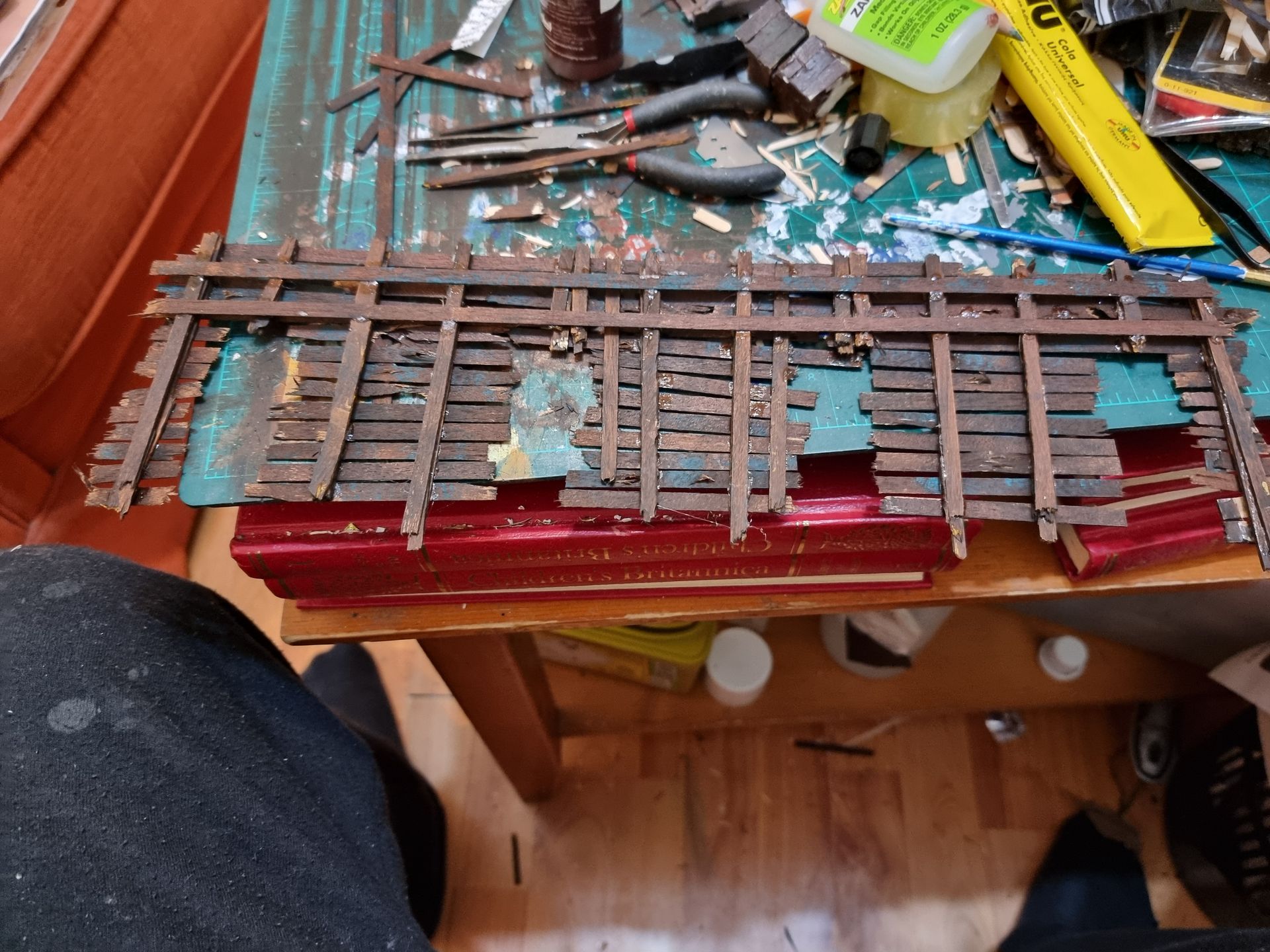 I used the original foam board with texture printout dock as a reference base to start laying out the strip planks to act like roof rafters and is the base for the new dock.