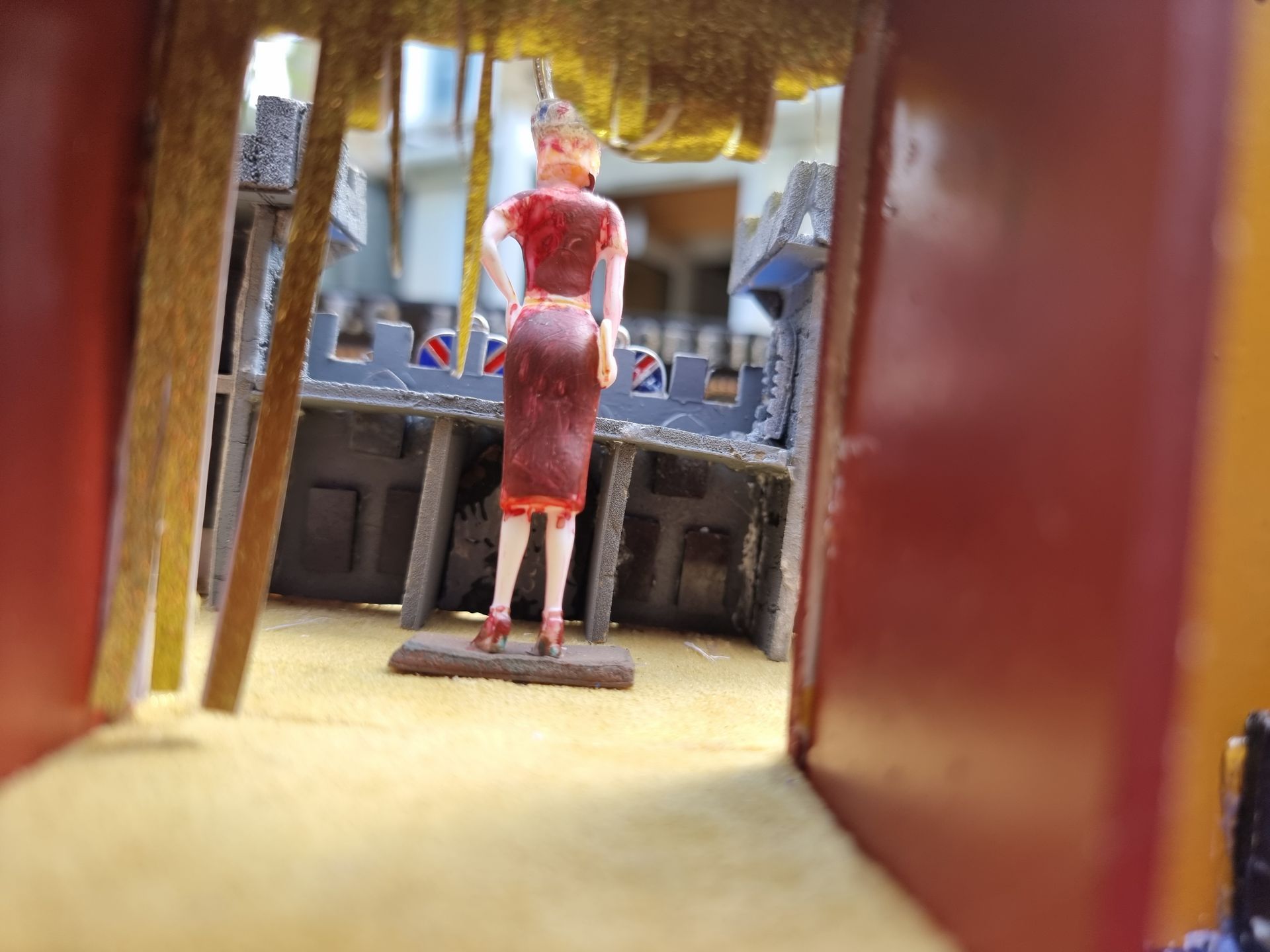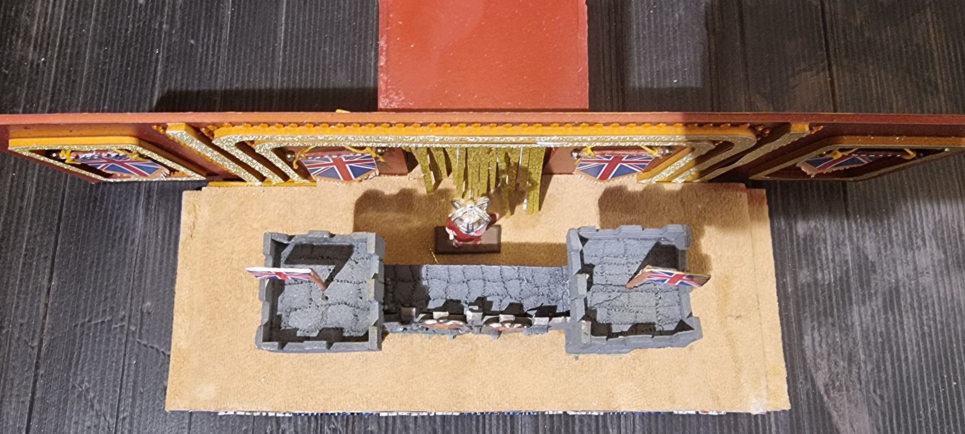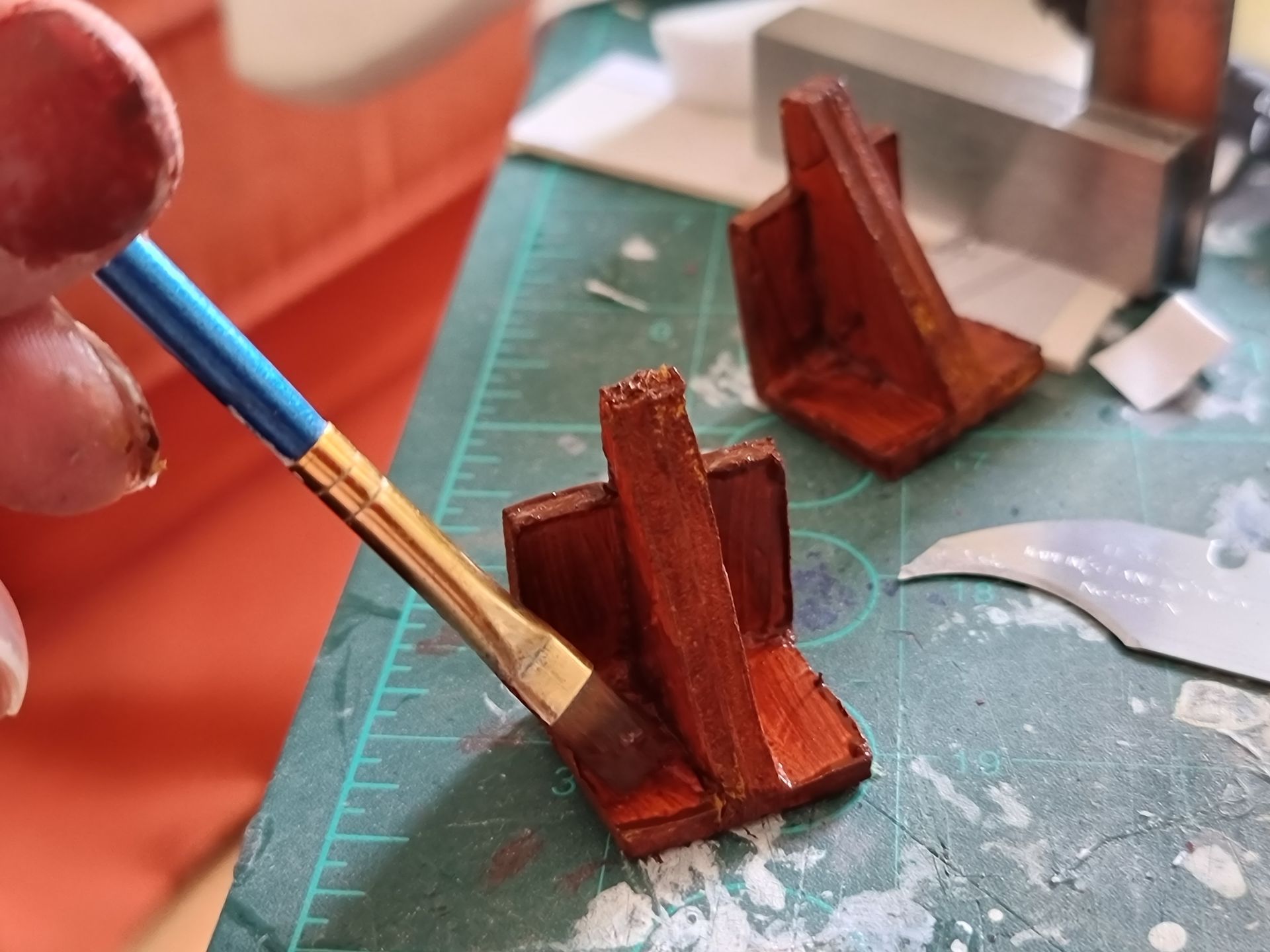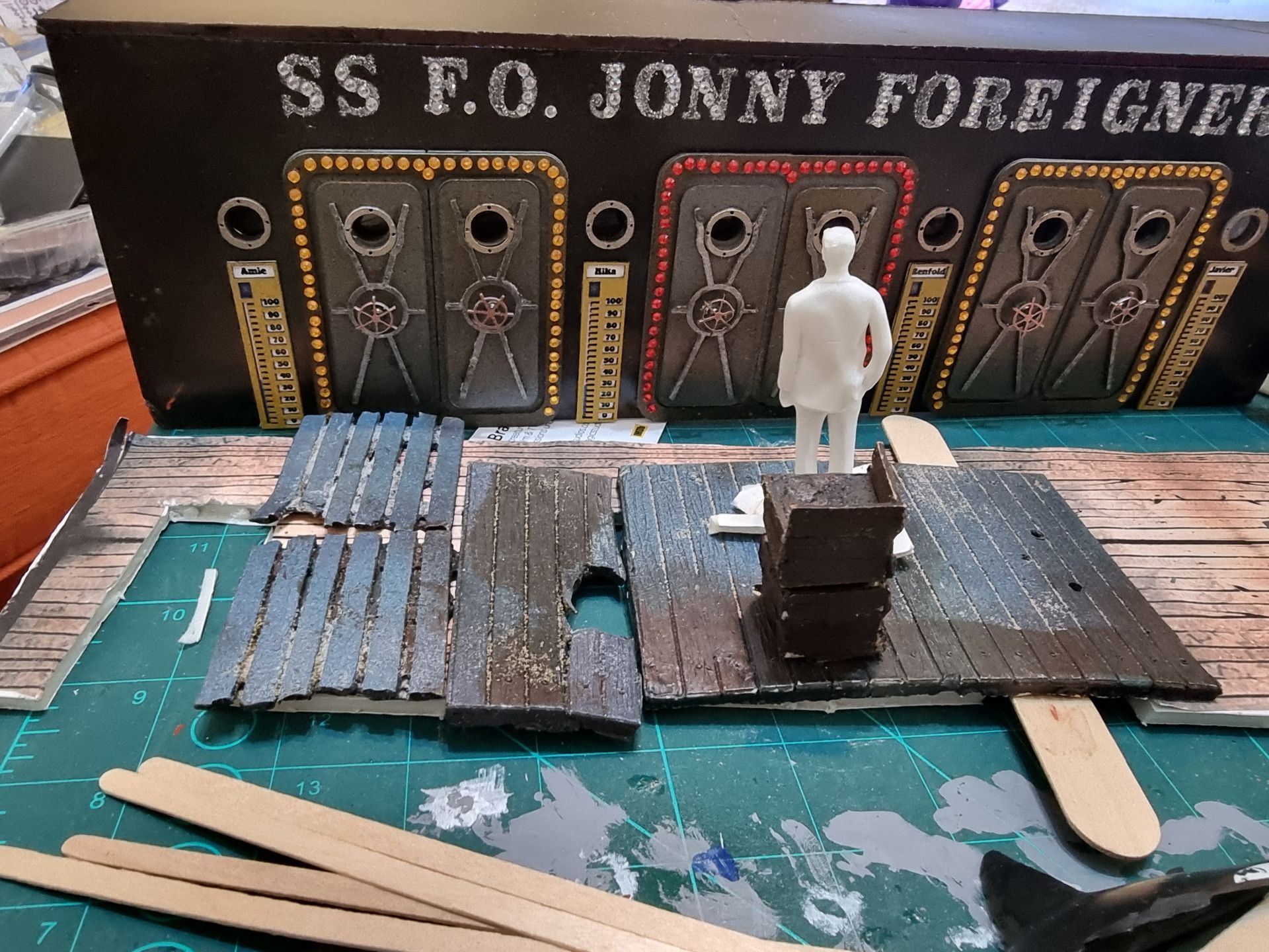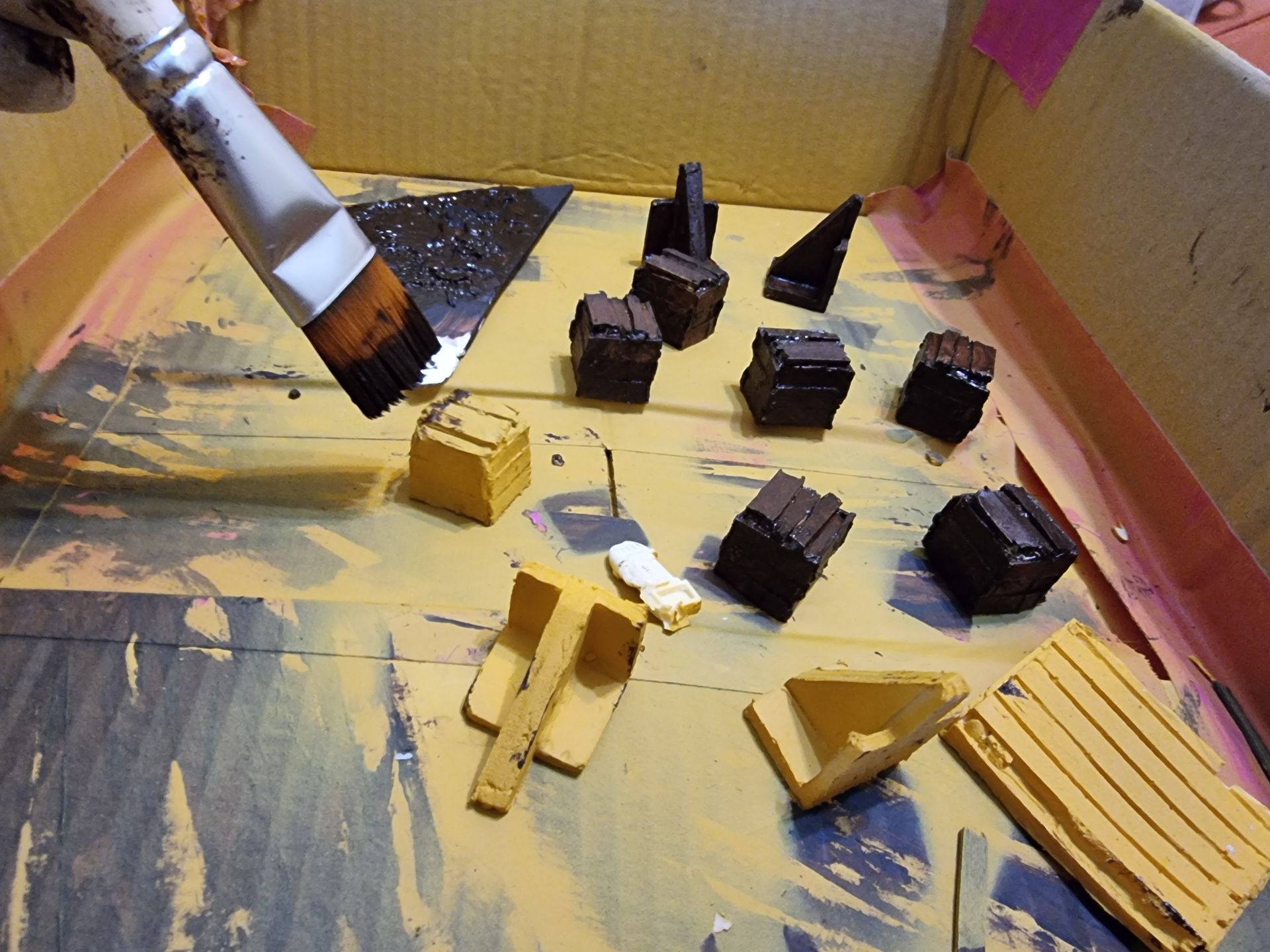 I used my silicon mould from my CMS 2017 Miniature Model Making course in 2017 to making box crates to build the podiums and paint them like the strip planks. First dab painted to get into all cracks, nooks and crannied then dry brushing burnt umber and mocha brown paint over the planks that form the box crates to give a wood appearance.