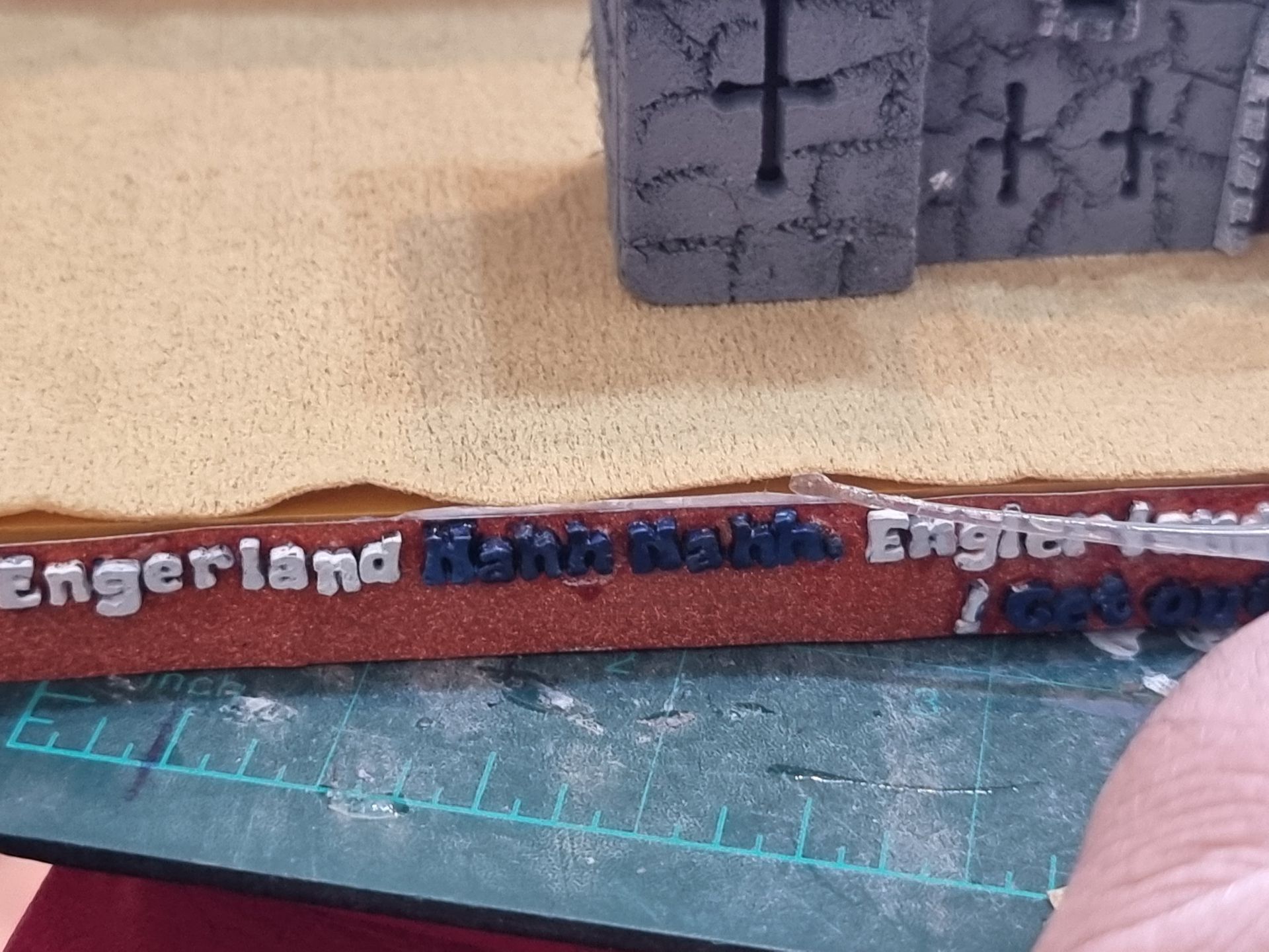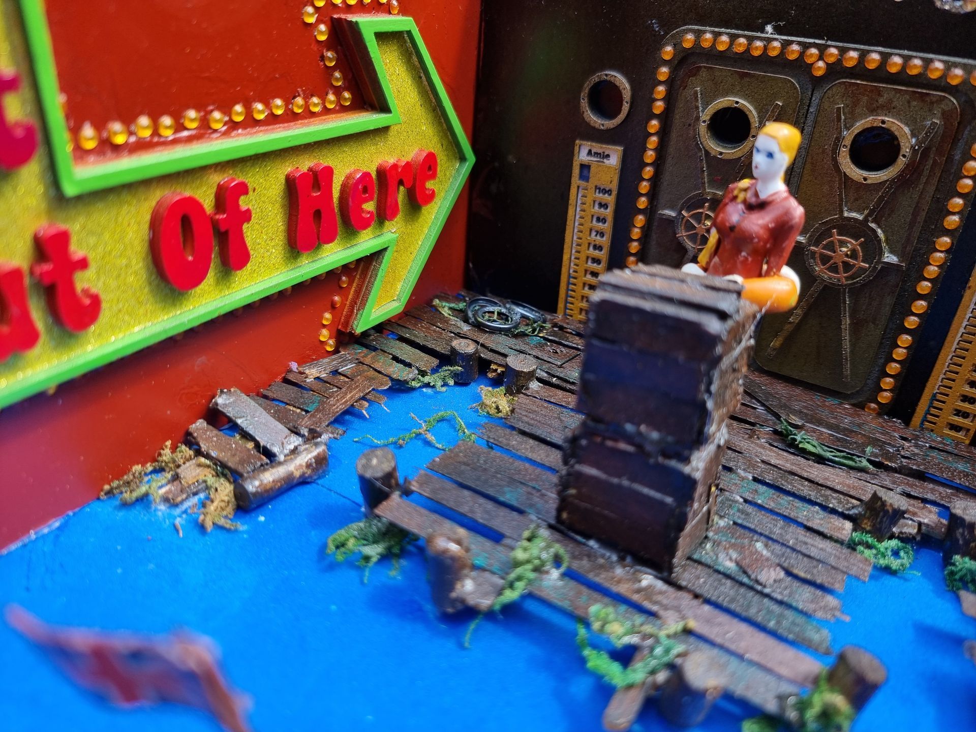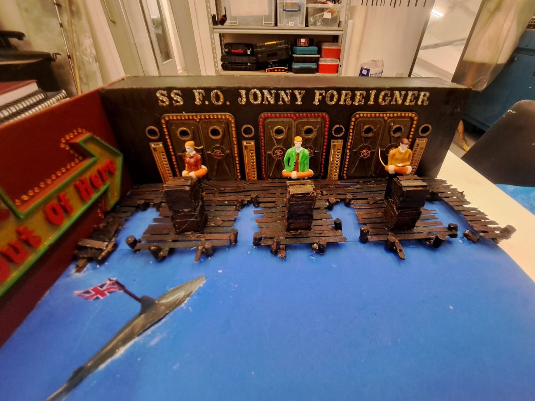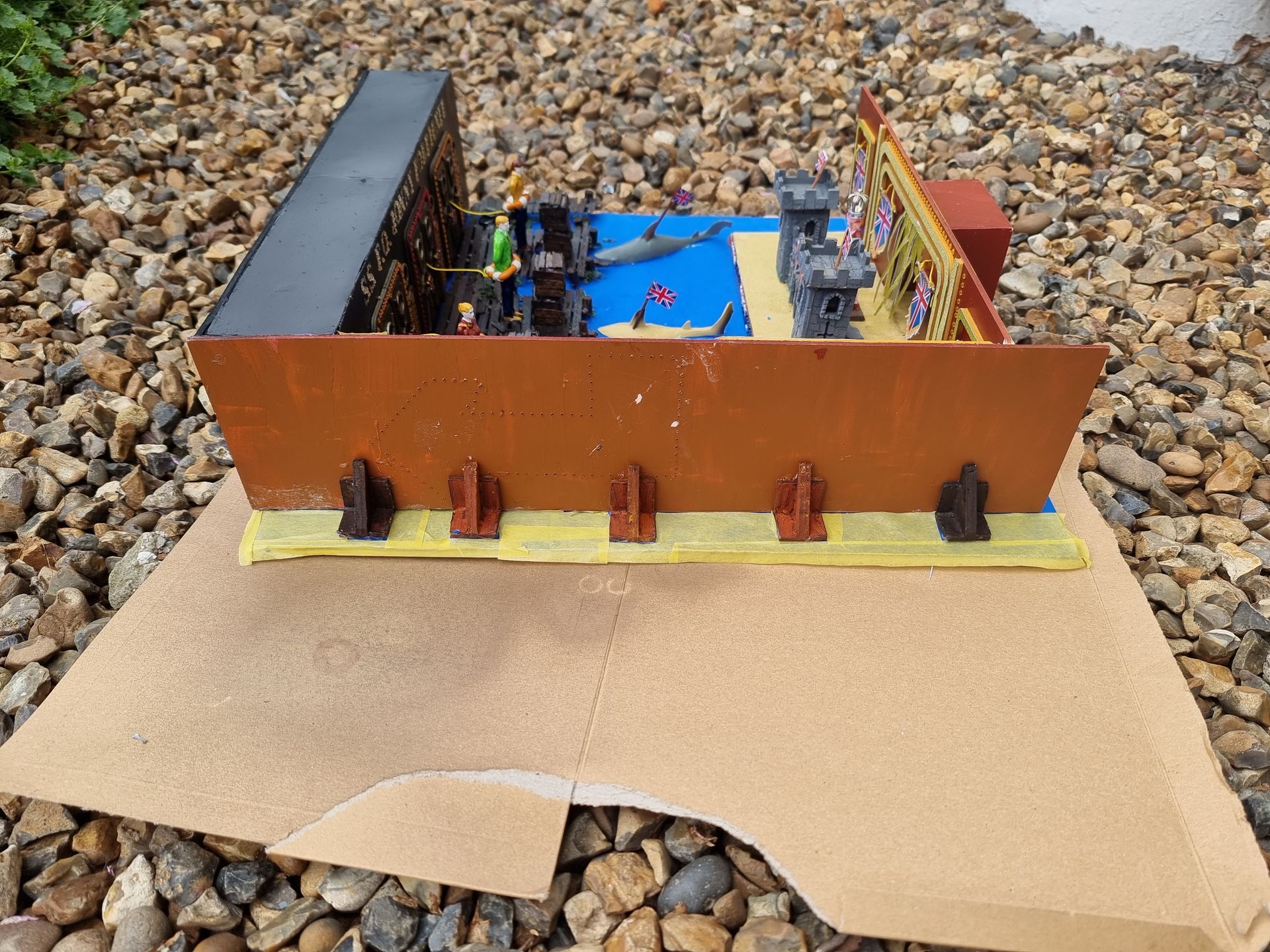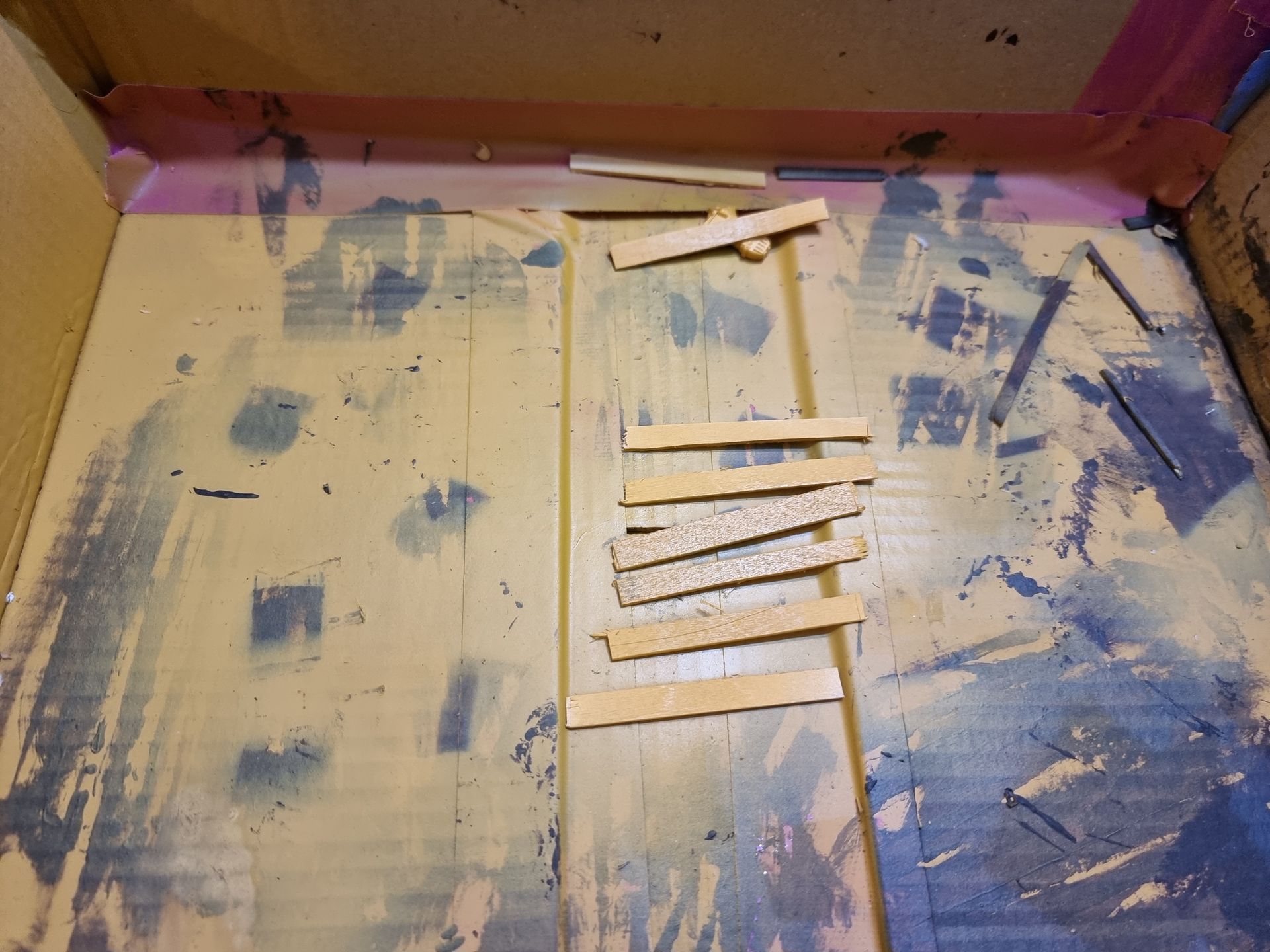 I used my silicon mould from my CMS 2017 Miniature Model Making course in 2017 to making box crates to build the podiums and paint them like the strip planks. First dab painted to get into all cracks, nooks and crannied then dry brushing burnt umber and mocha brown paint over the planks that form the box crates to give a wood appearance.