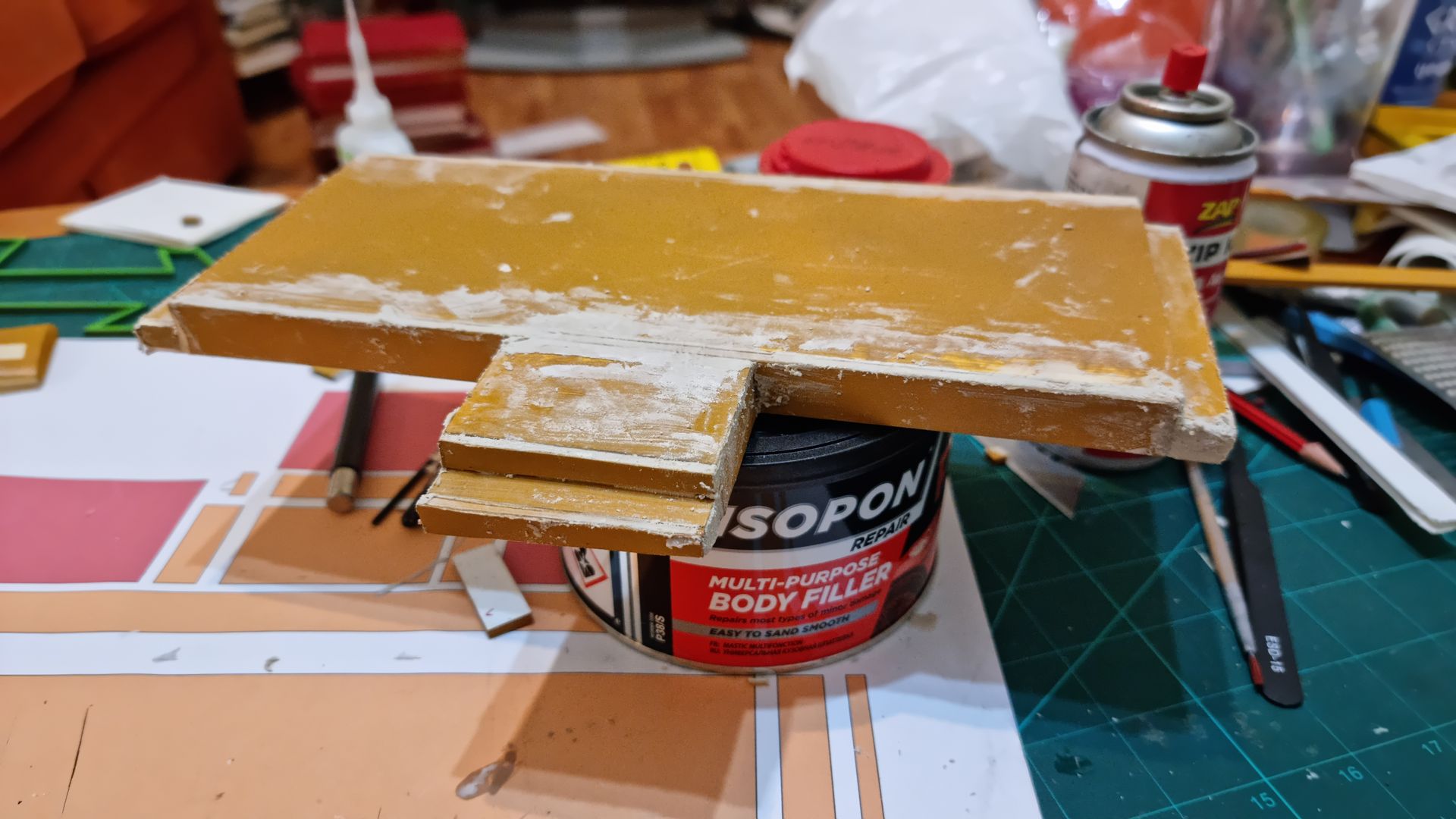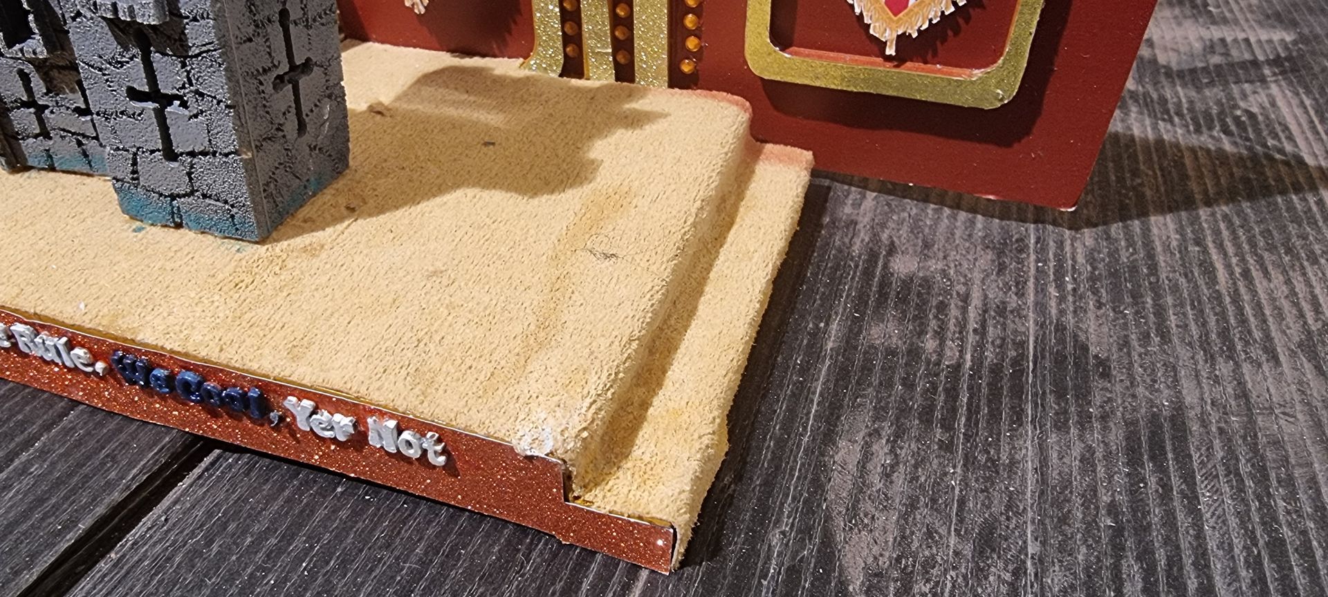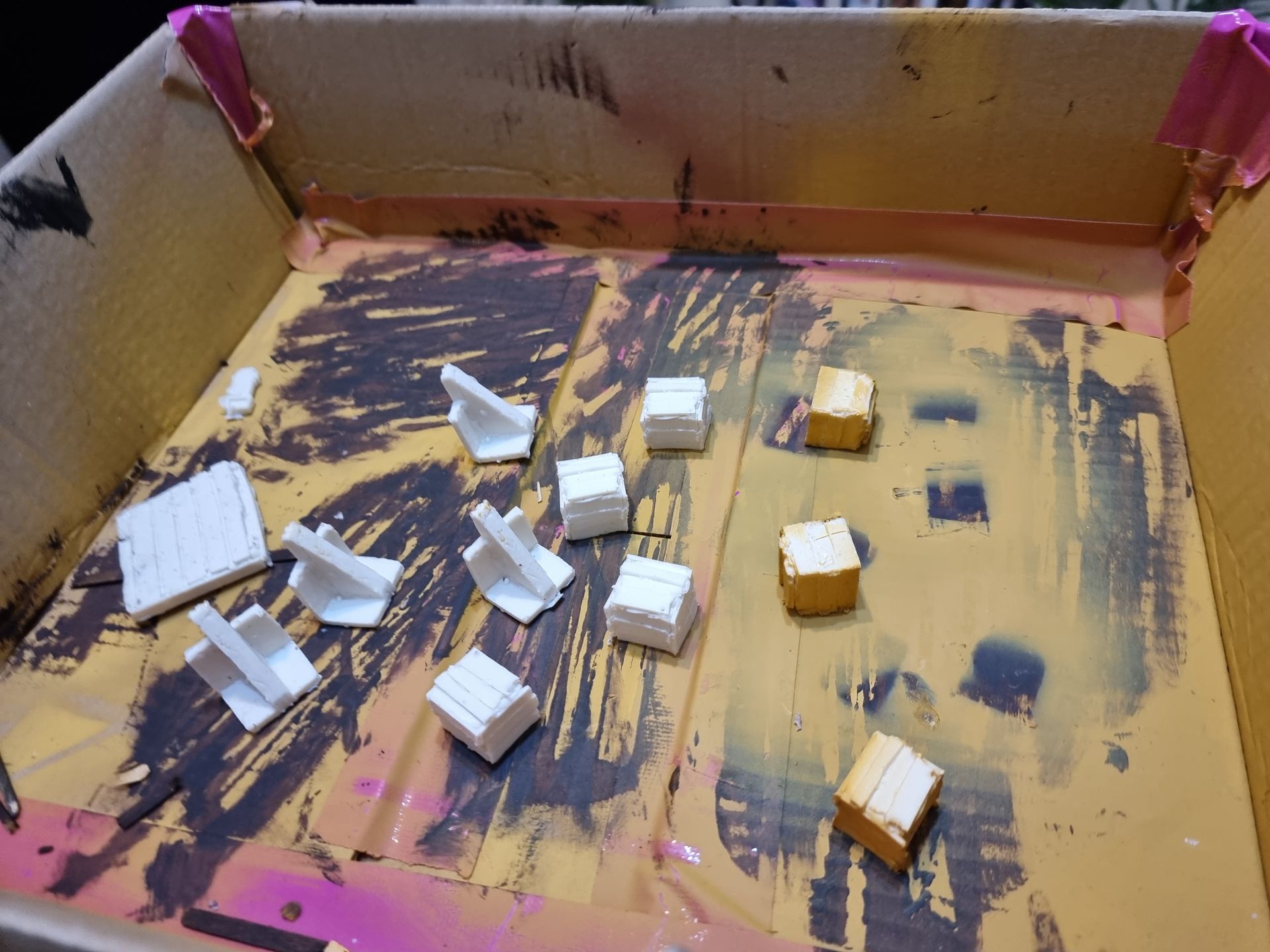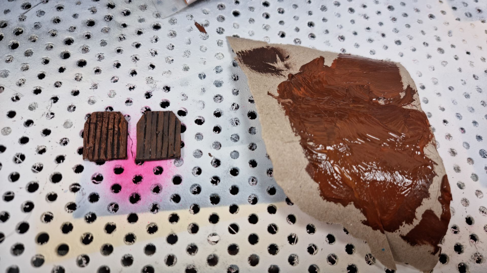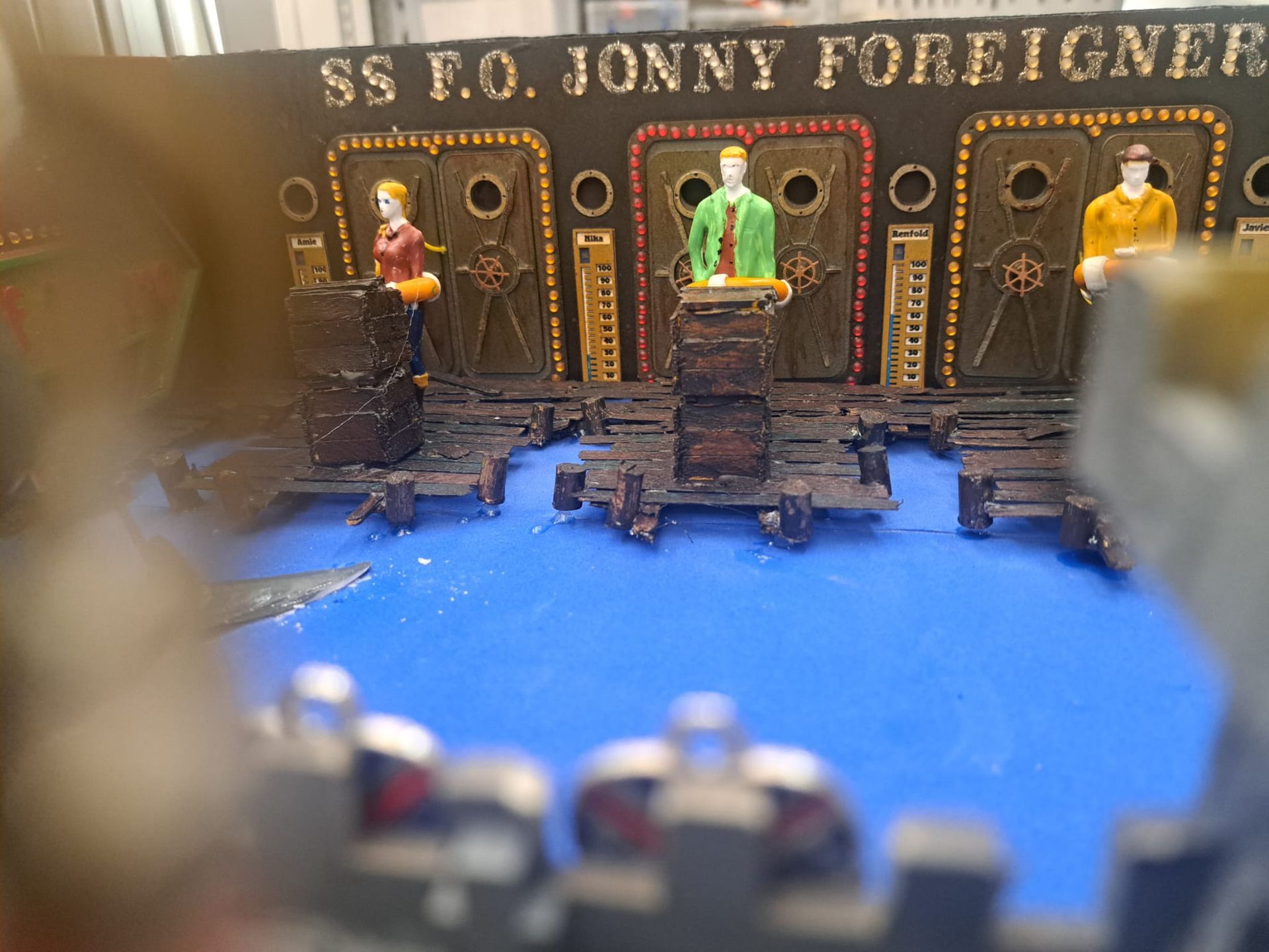 I used my silicon mould from my CMS 2017 Miniature Model Making course in 2017 to making box crates to build the podiums and paint them like the strip planks. First dab painted to get into all cracks, nooks and crannied then dry brushing burnt umber and mocha brown paint over the planks that form the box crates to give a wood appearance.