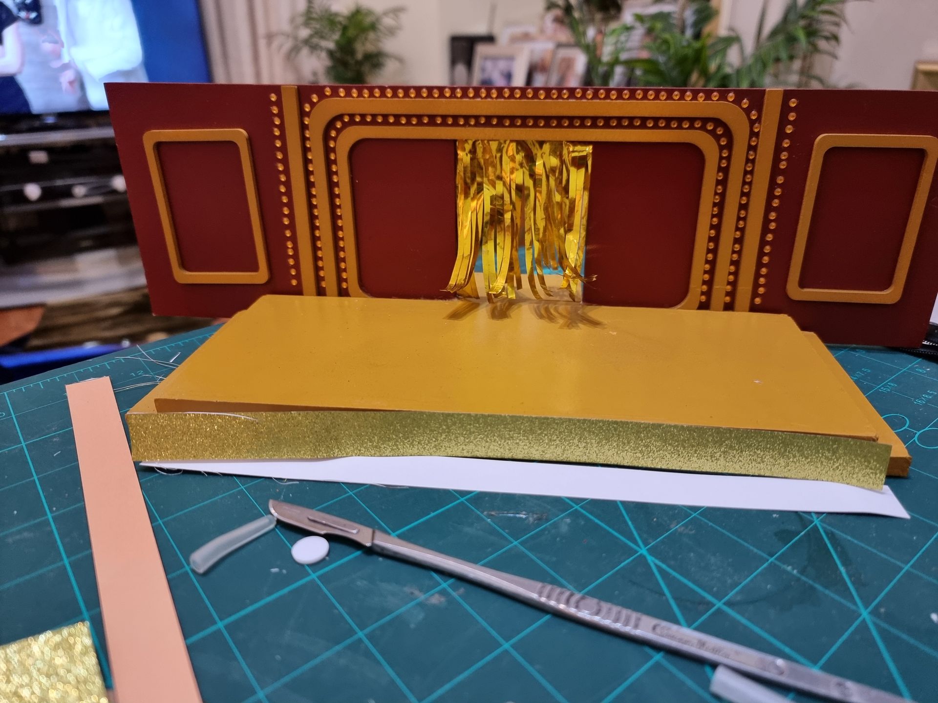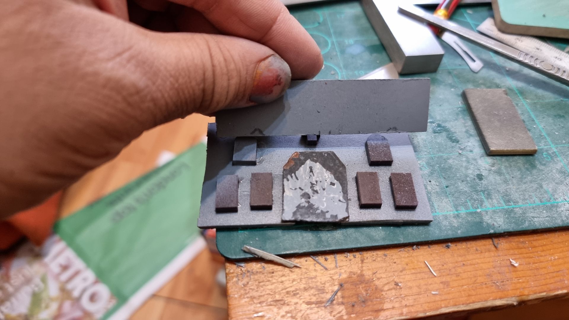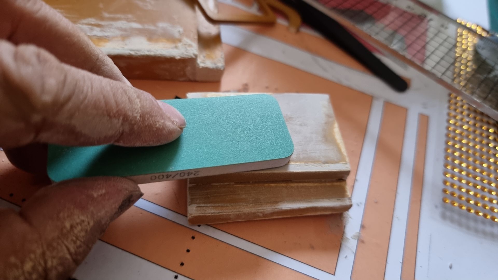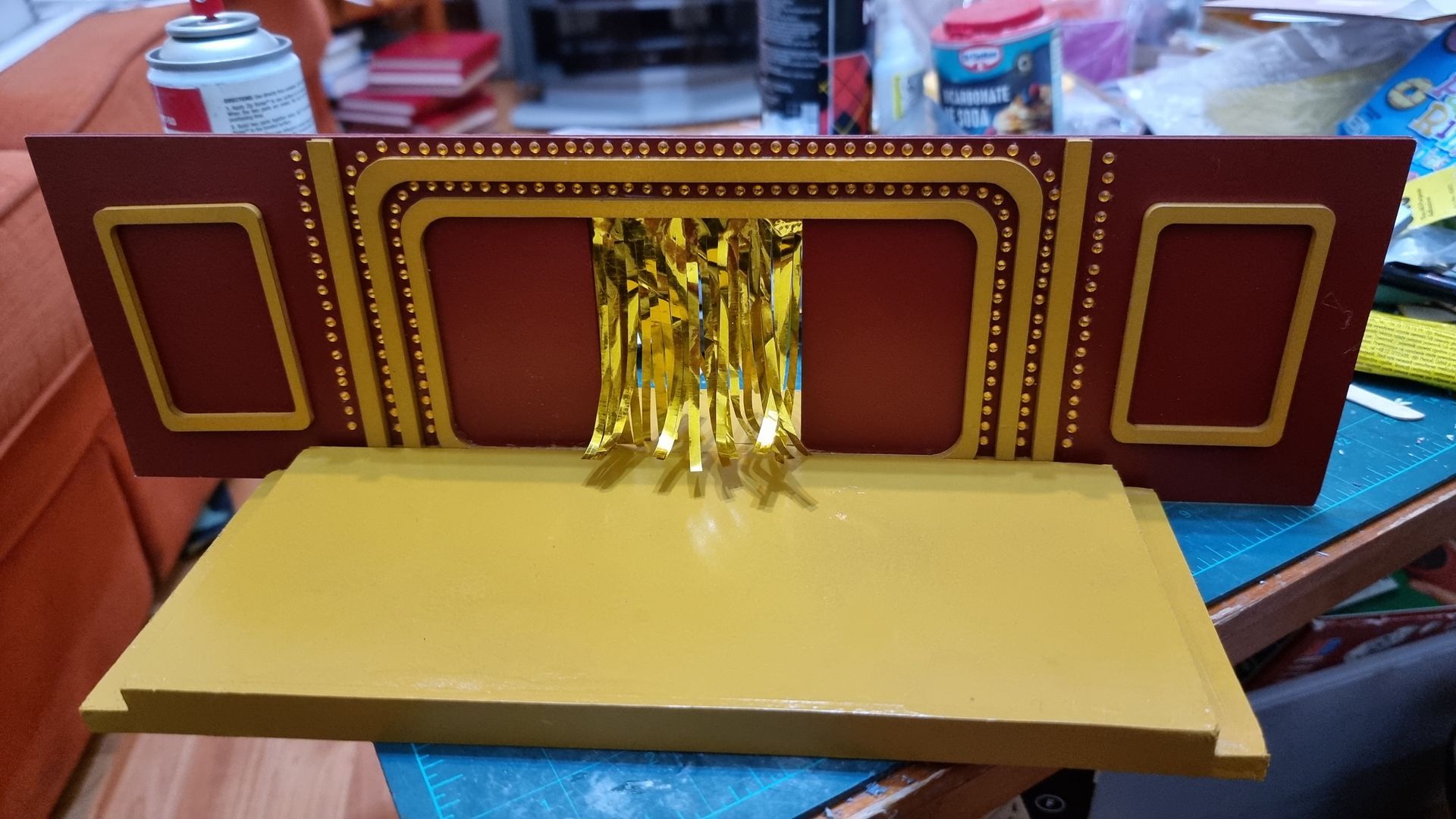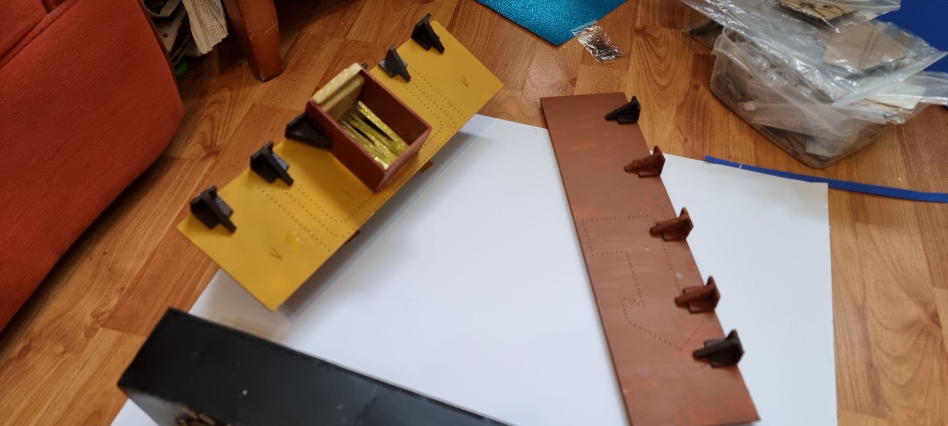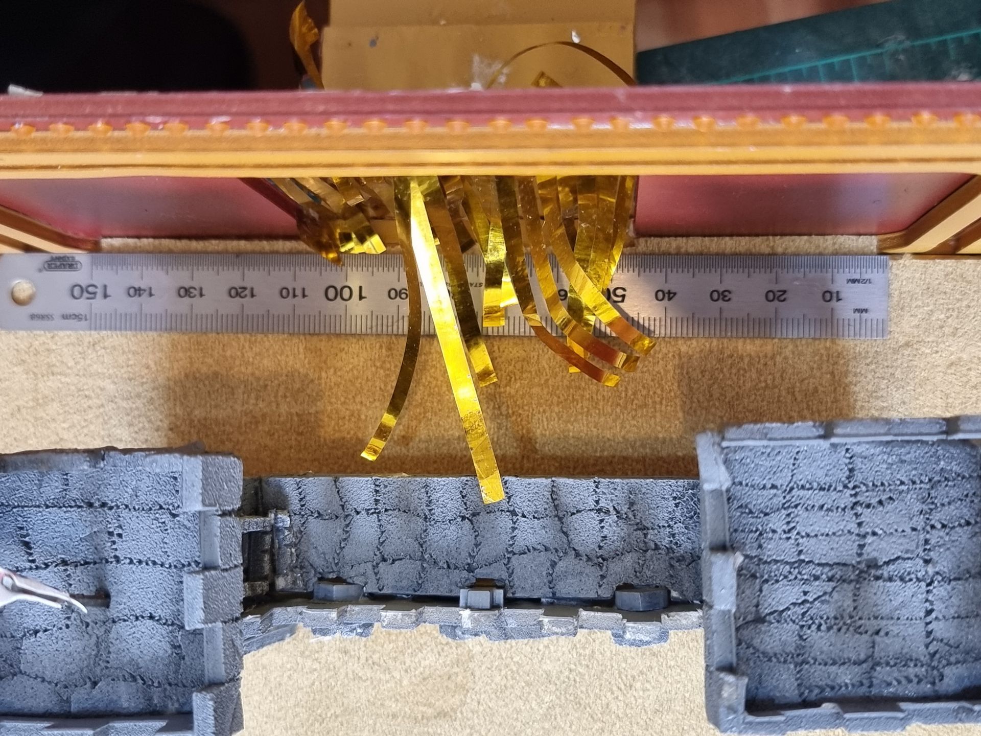 I used my silicon mould from my CMS 2017 Miniature Model Making course in 2017 to making box crates to build the podiums and paint them like the strip planks. First dab painted to get into all cracks, nooks and crannied then dry brushing burnt umber and mocha brown paint over the planks that form the box crates to give a wood appearance.