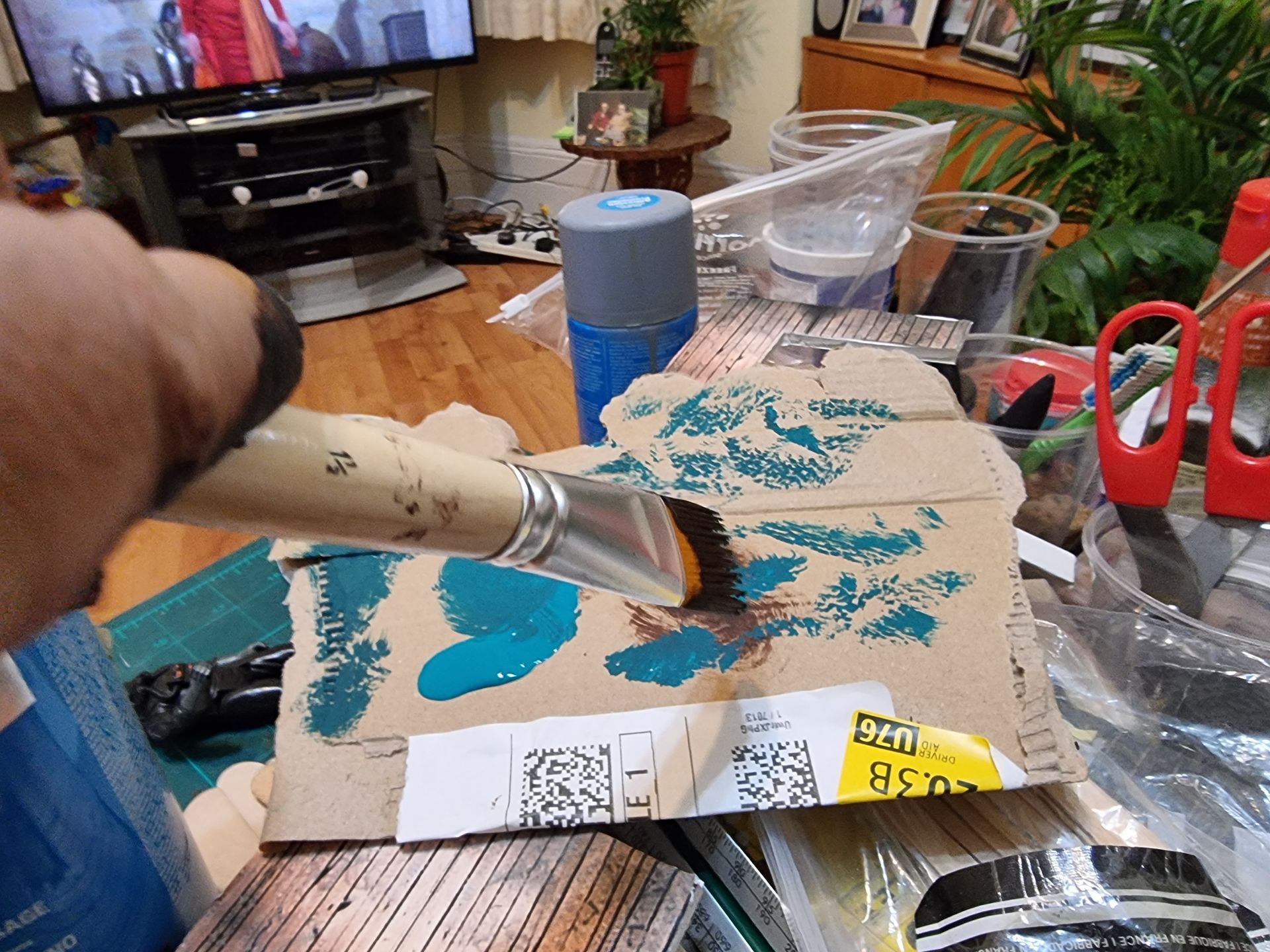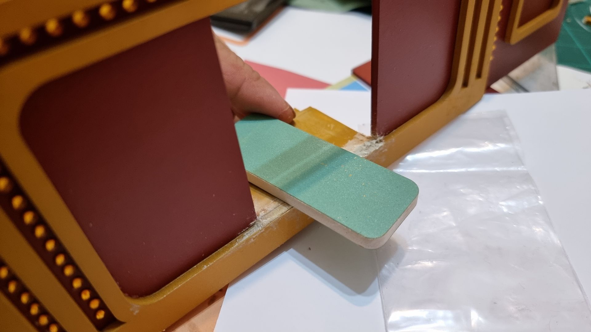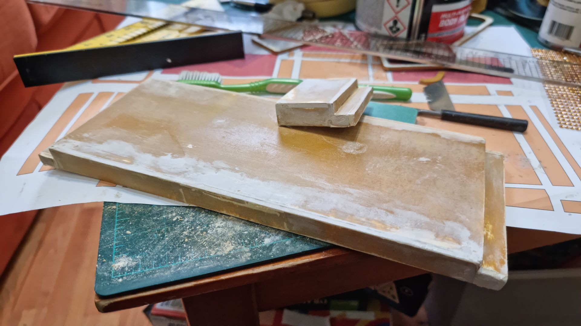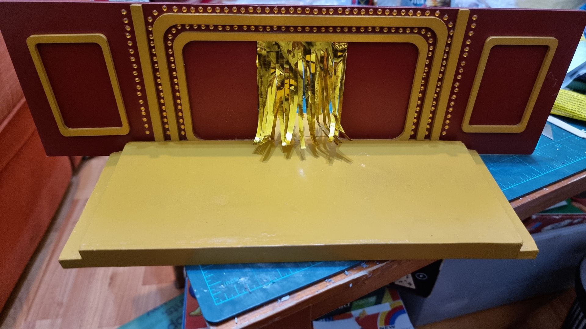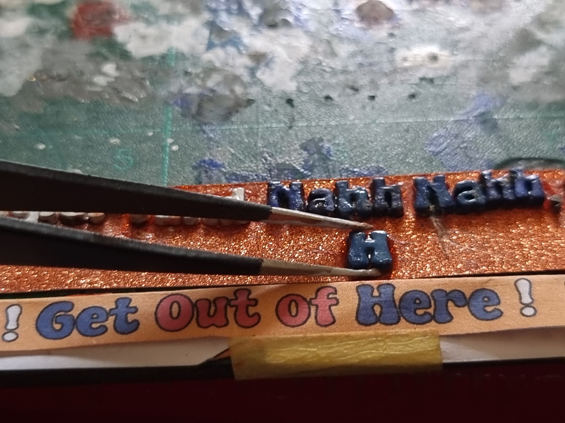 I used my silicon mould from my CMS 2017 Miniature Model Making course in 2017 to making box crates to build the podiums and paint them like the strip planks. First dab painted to get into all cracks, nooks and crannied then dry brushing burnt umber and mocha brown paint over the planks that form the box crates to give a wood appearance.