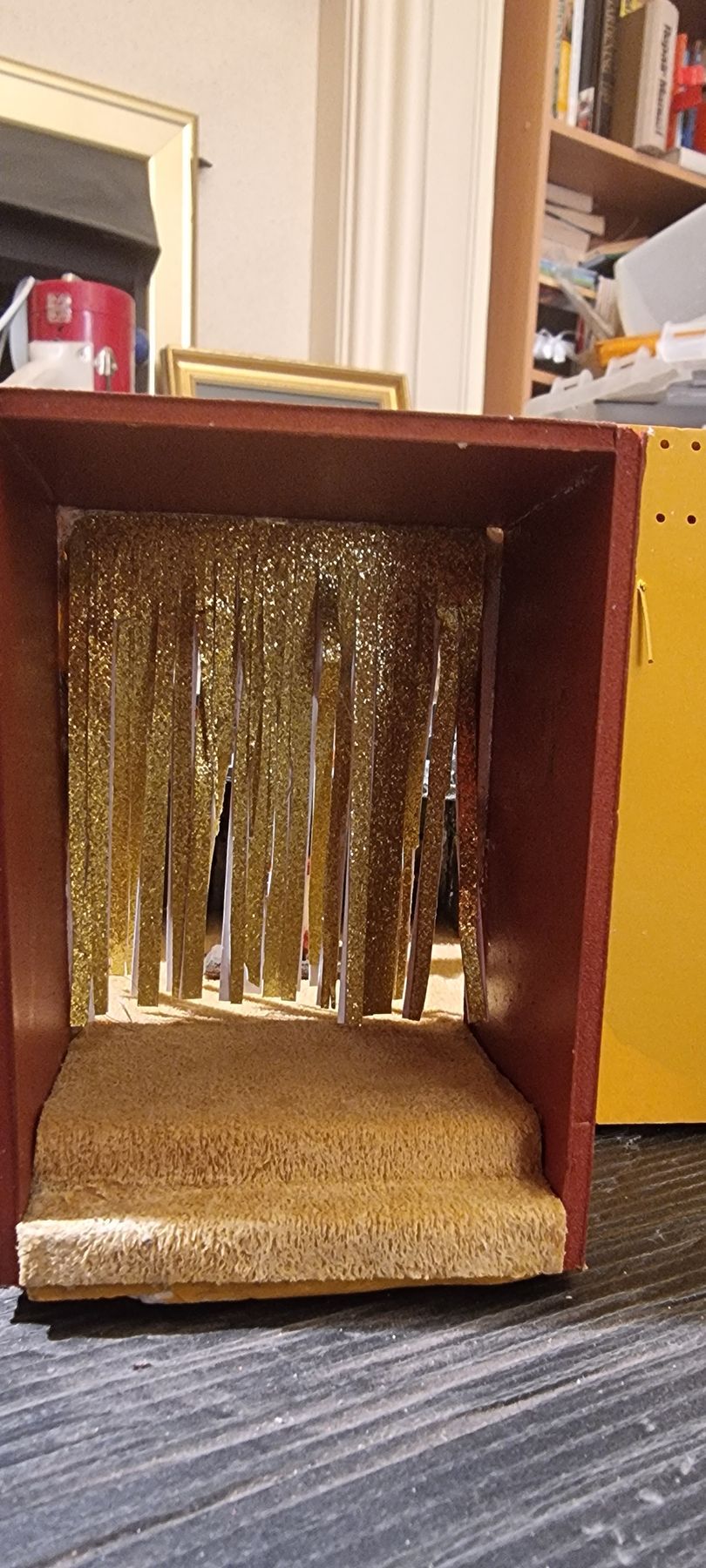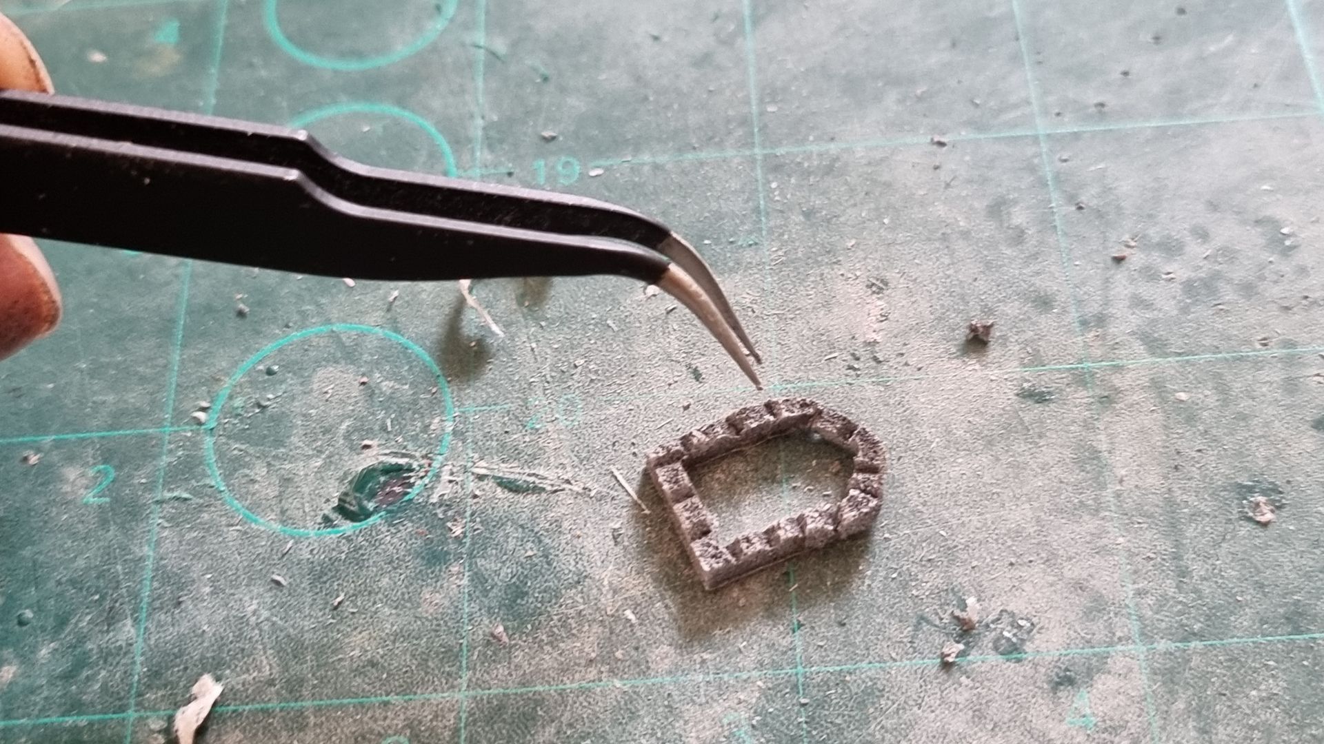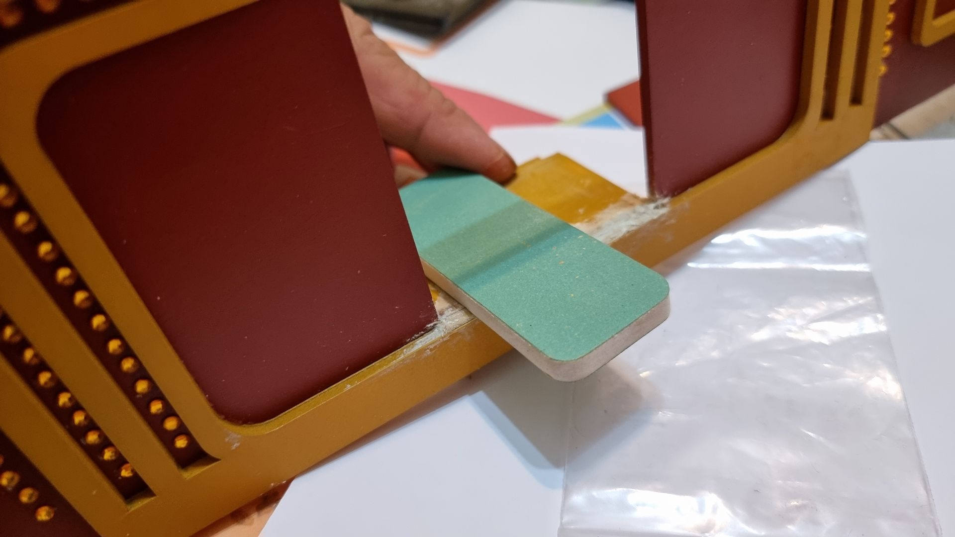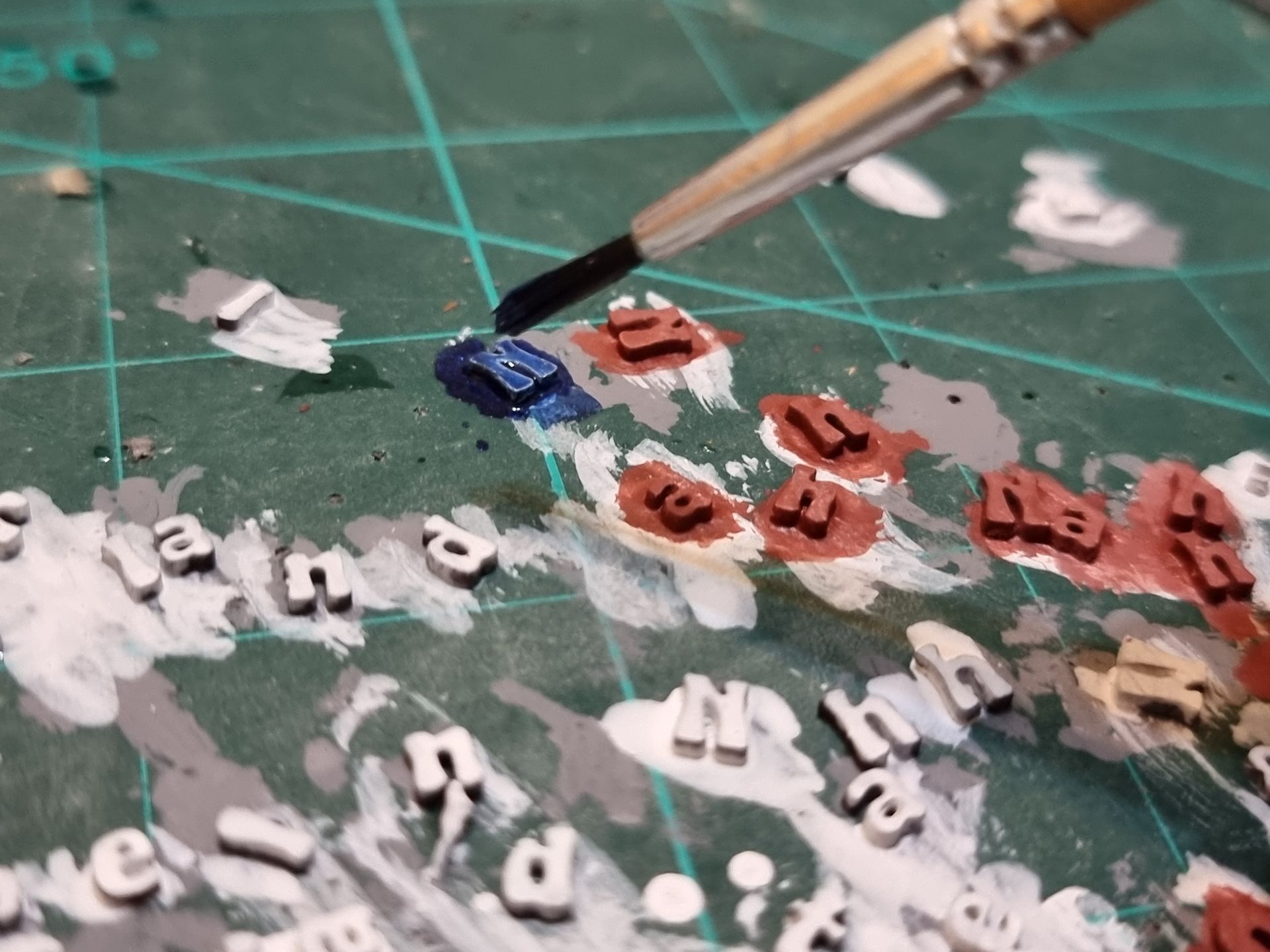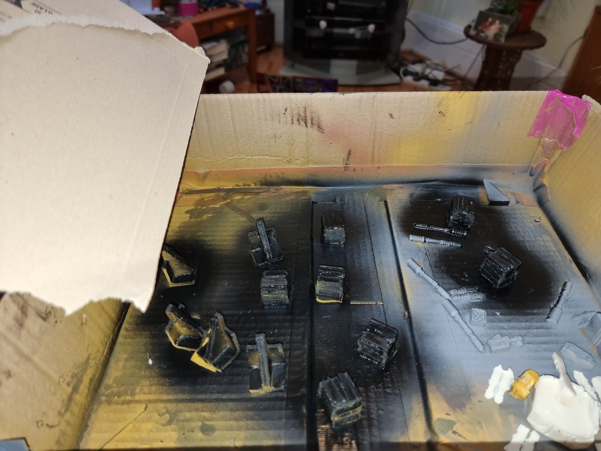 I used my silicon mould from my CMS 2017 Miniature Model Making course in 2017 to making box crates to build the podiums and paint them like the strip planks. First dab painted to get into all cracks, nooks and crannied then dry brushing burnt umber and mocha brown paint over the planks that form the box crates to give a wood appearance.