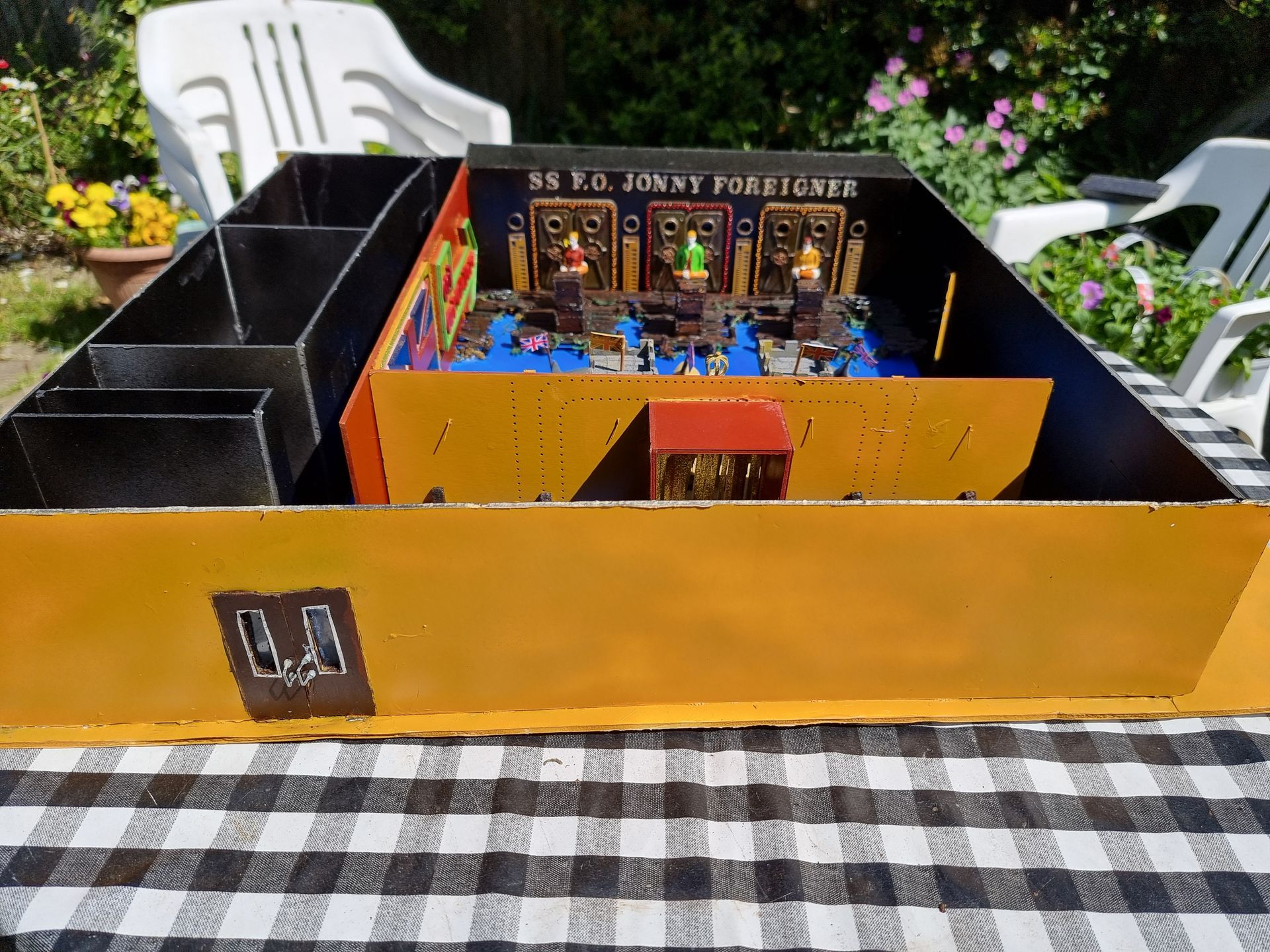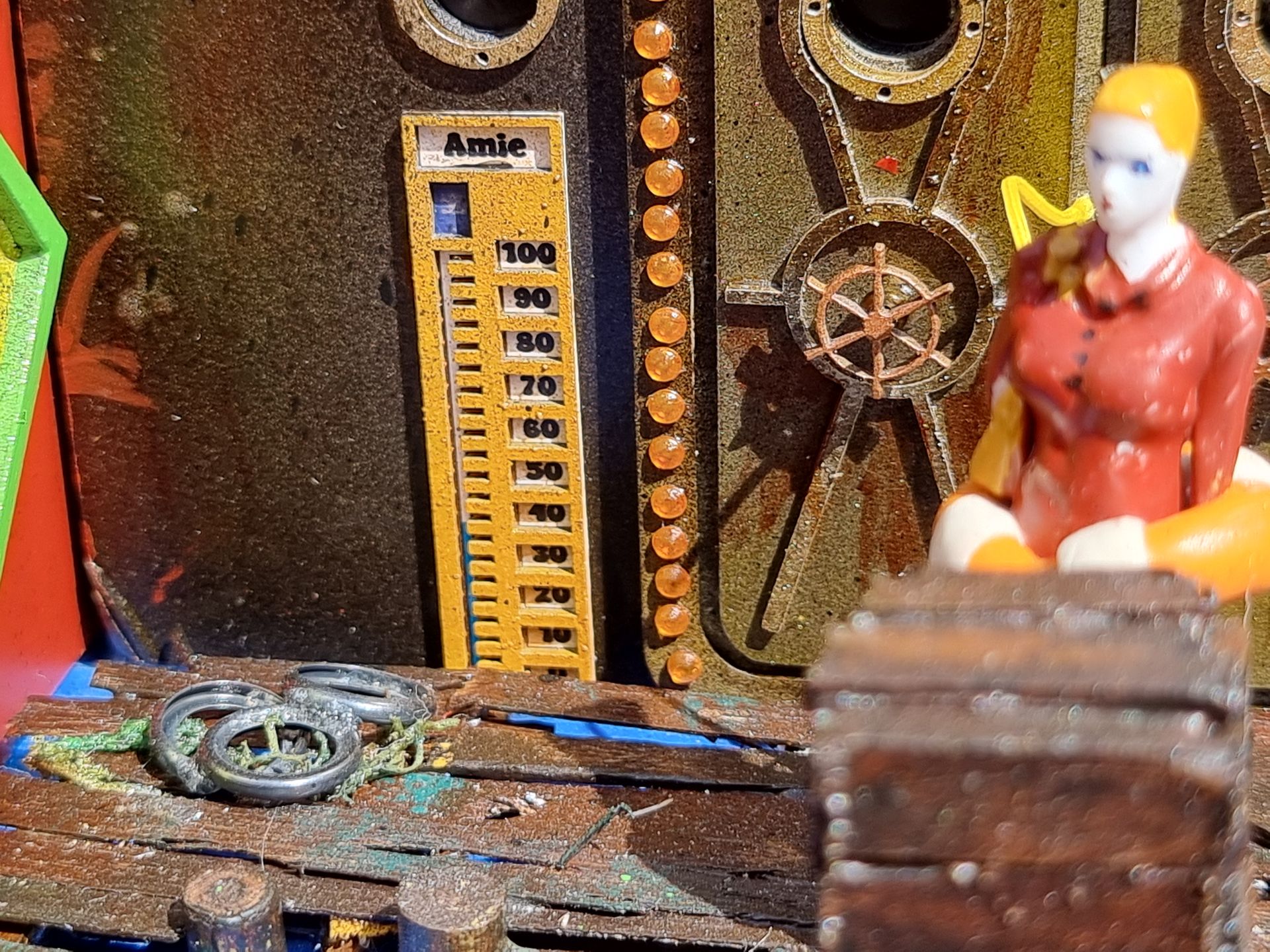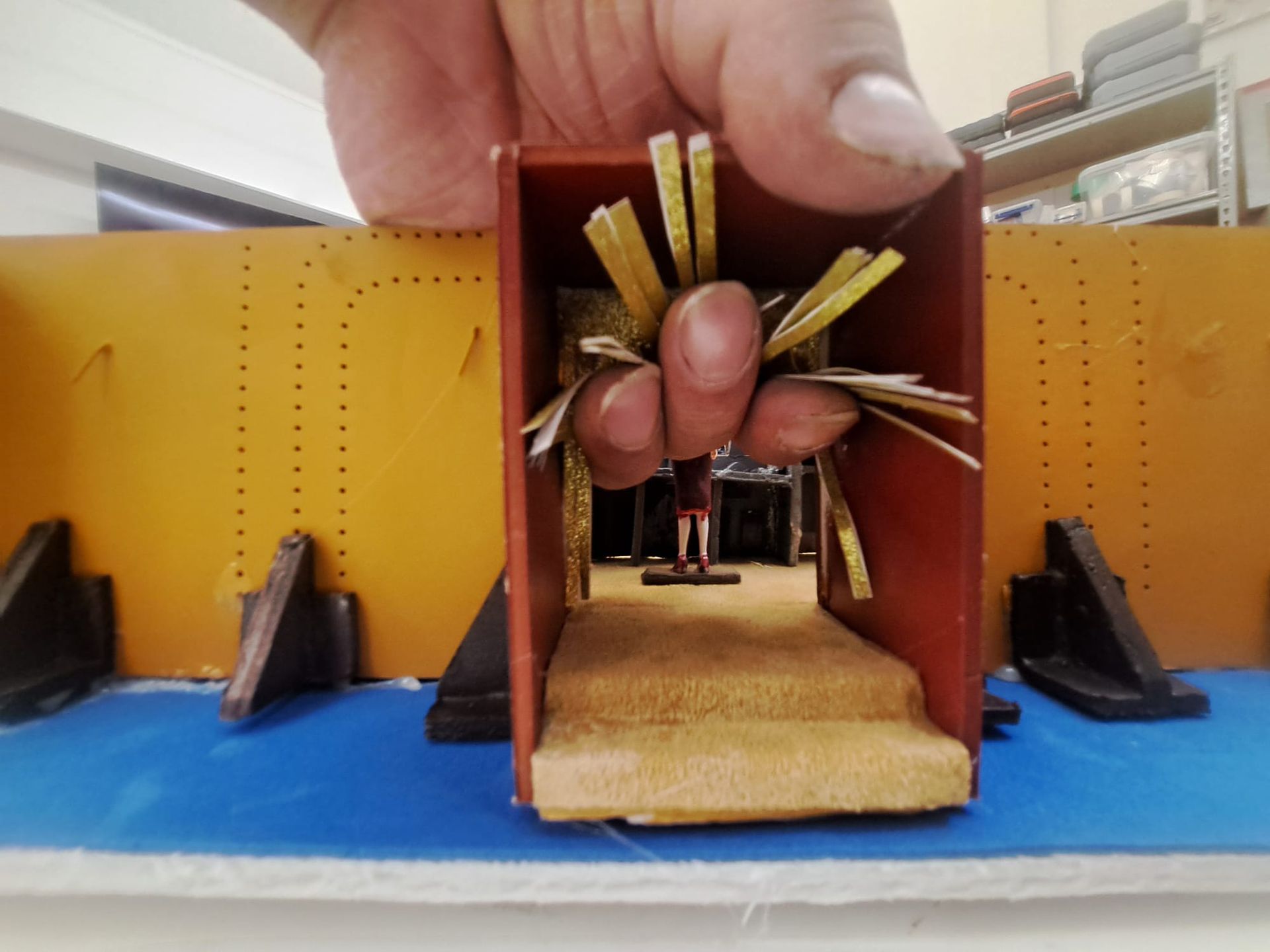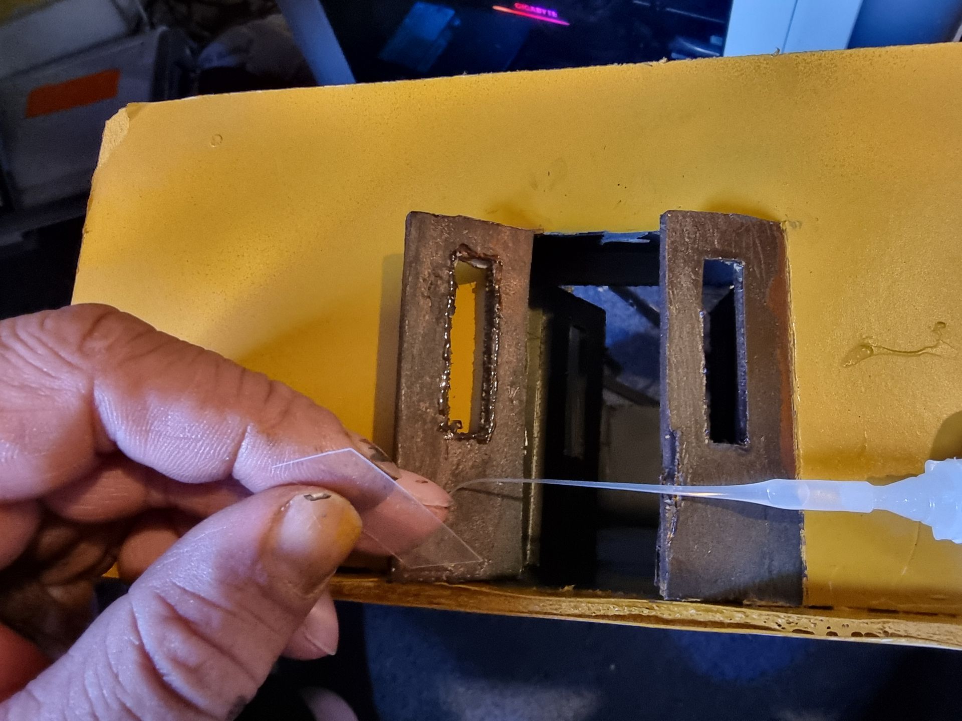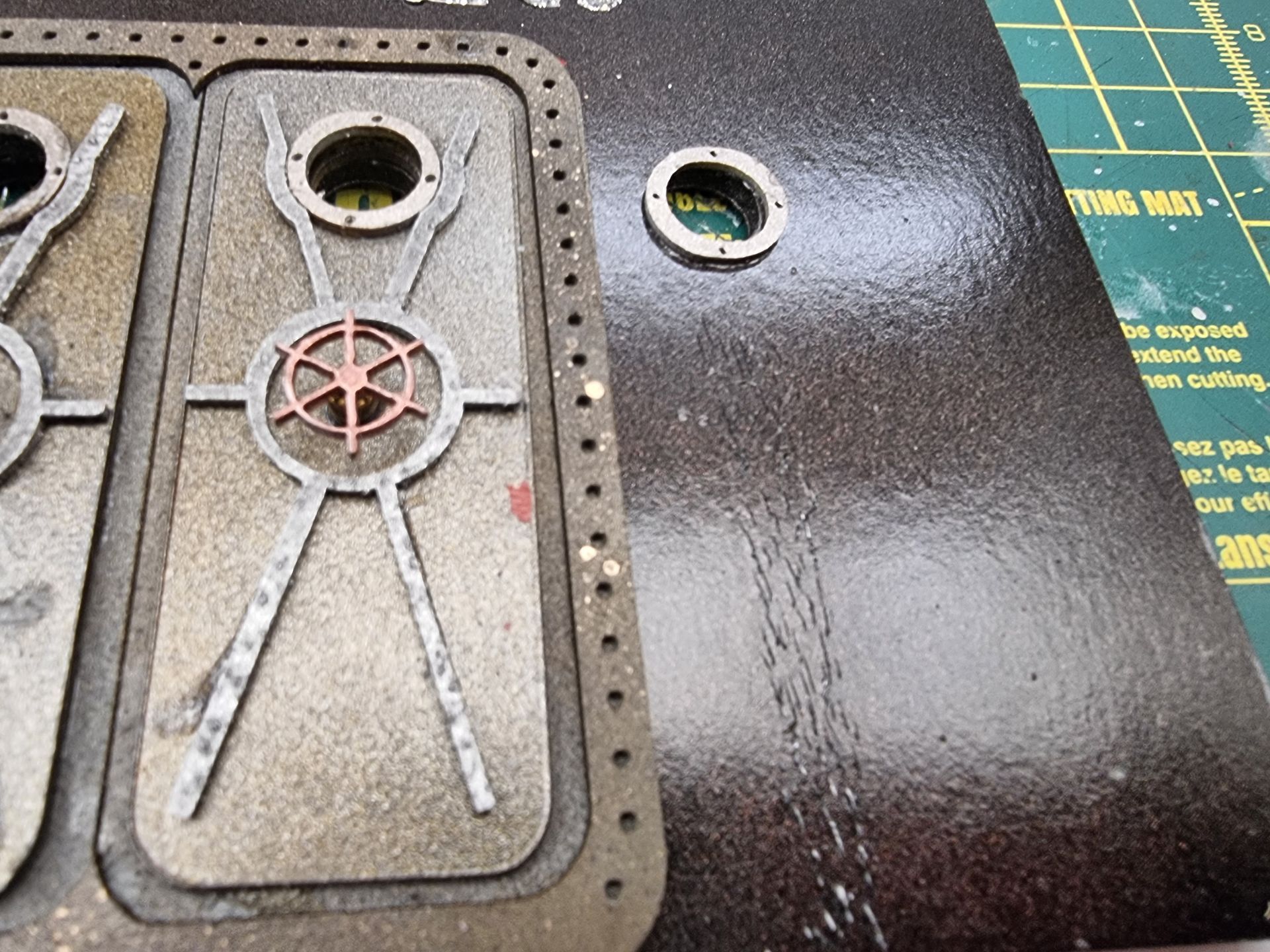 Laser cut dark acrylic disc were added to inside of the portholes. The inside of the shop box had lots of A Frame glued into place using a mix of accelerated superglue and rapid epoxy glue.