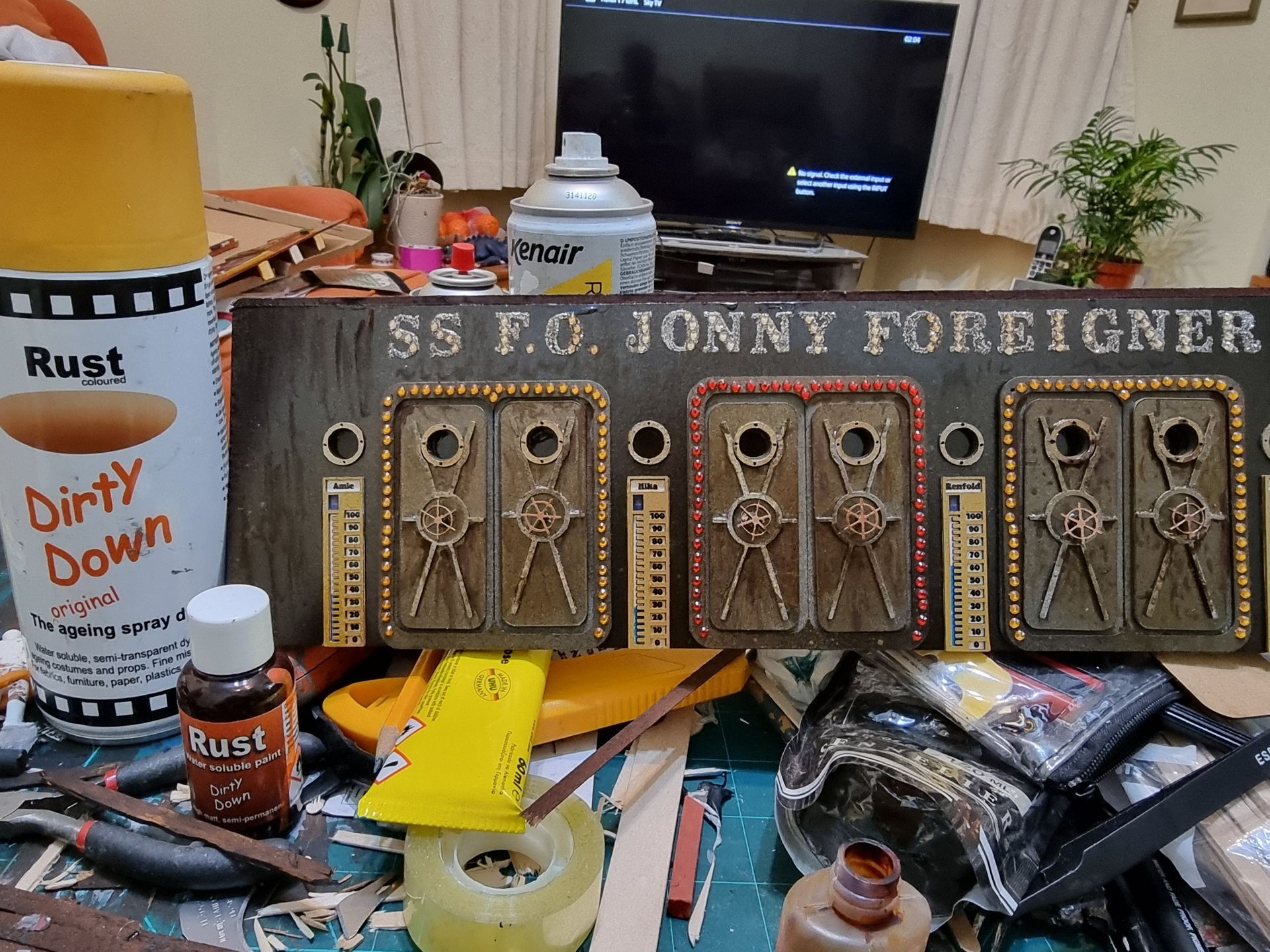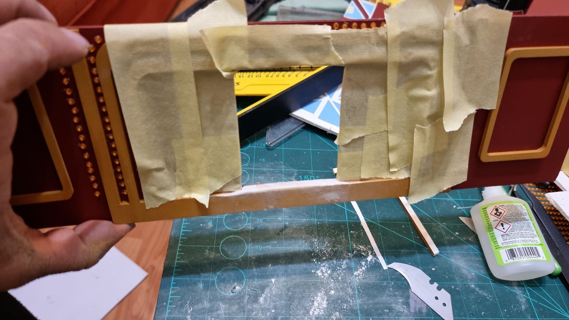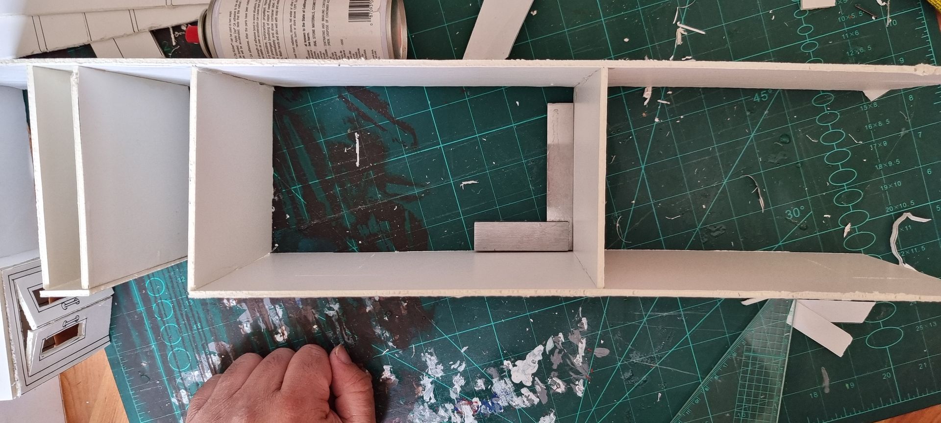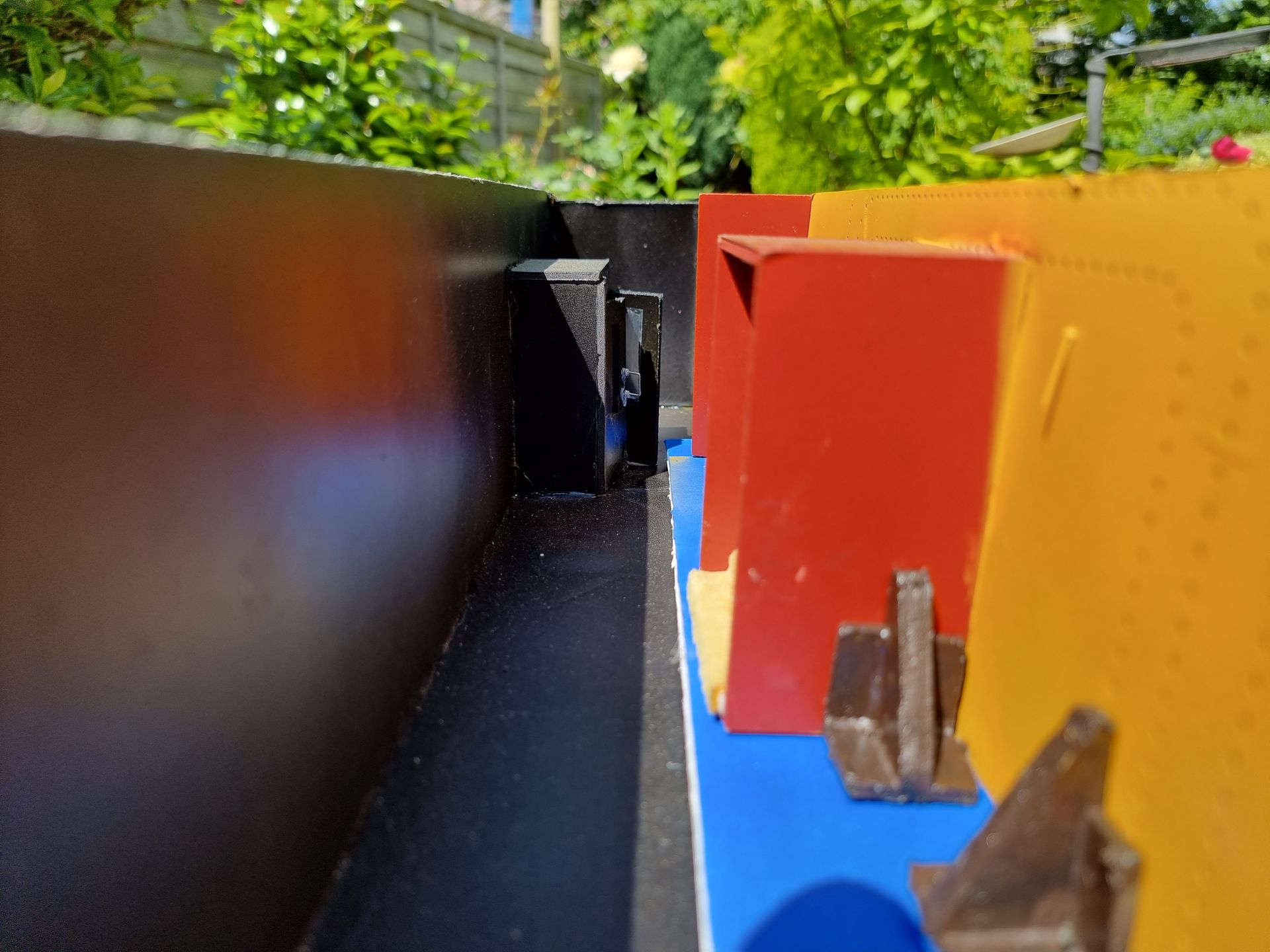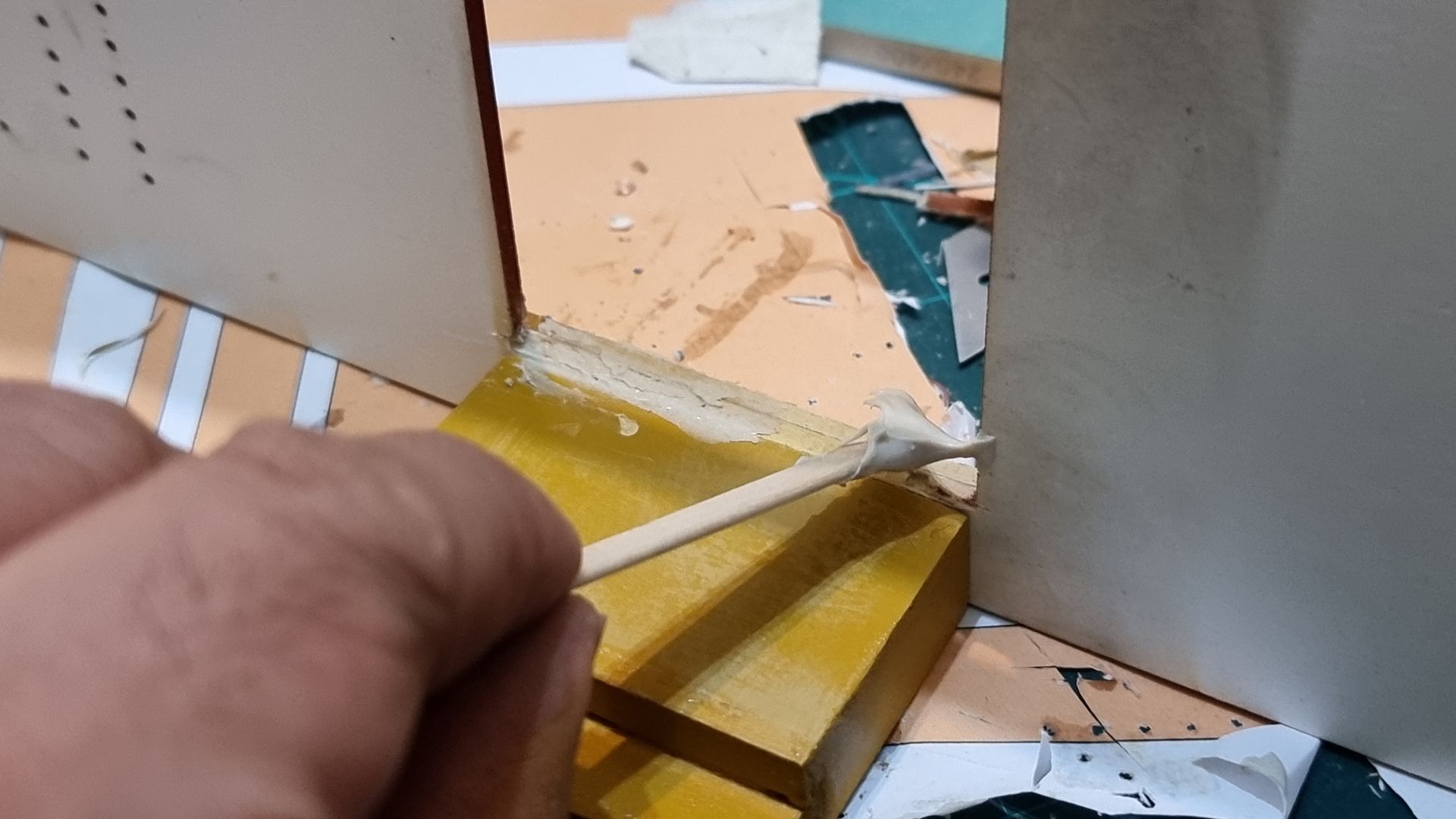 Laser cut dark acrylic disc were added to inside of the portholes. The inside of the shop box had lots of A Frame glued into place using a mix of accelerated superglue and rapid epoxy glue.