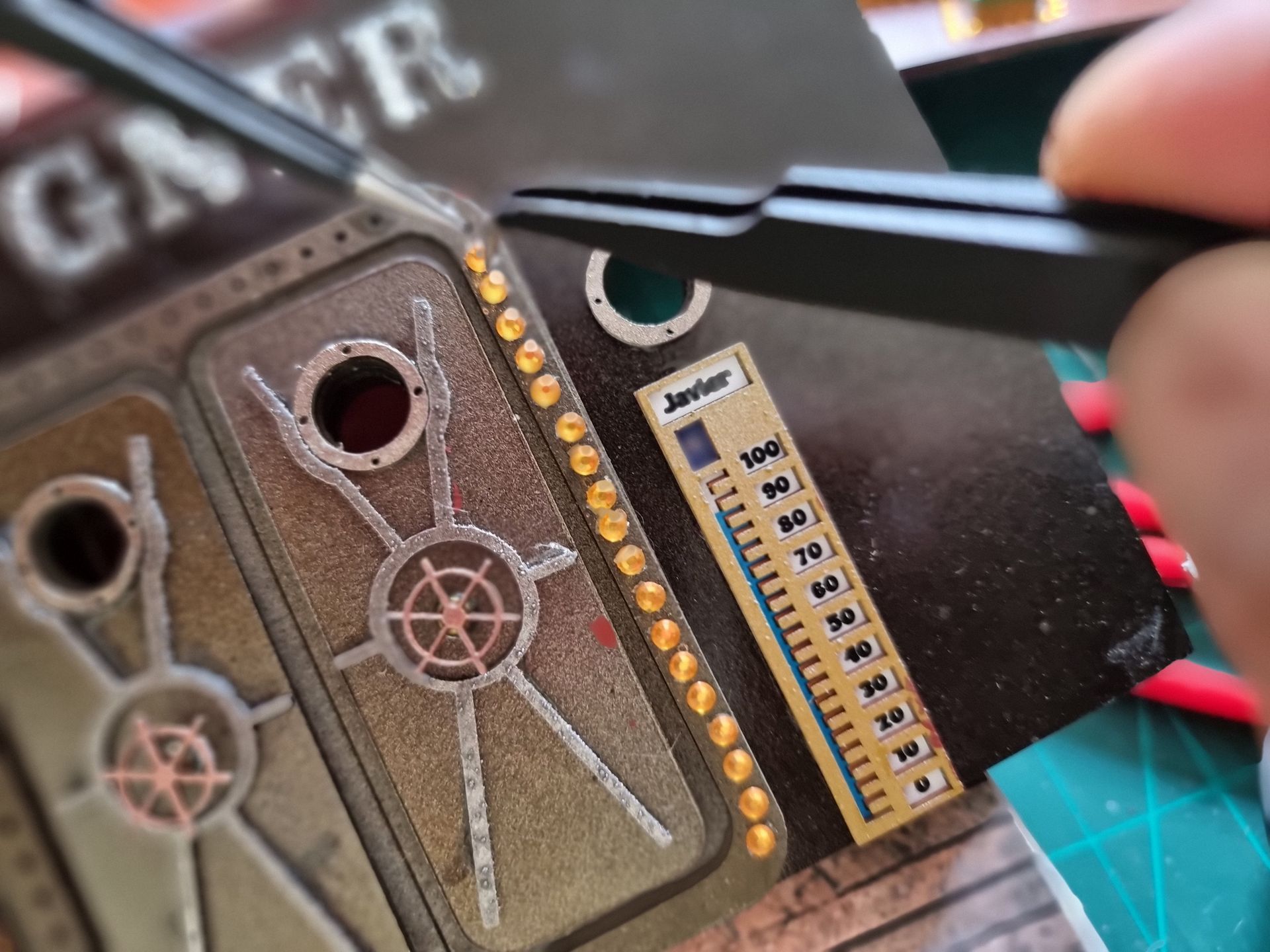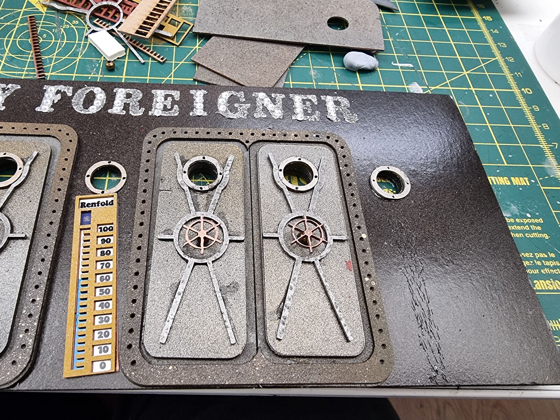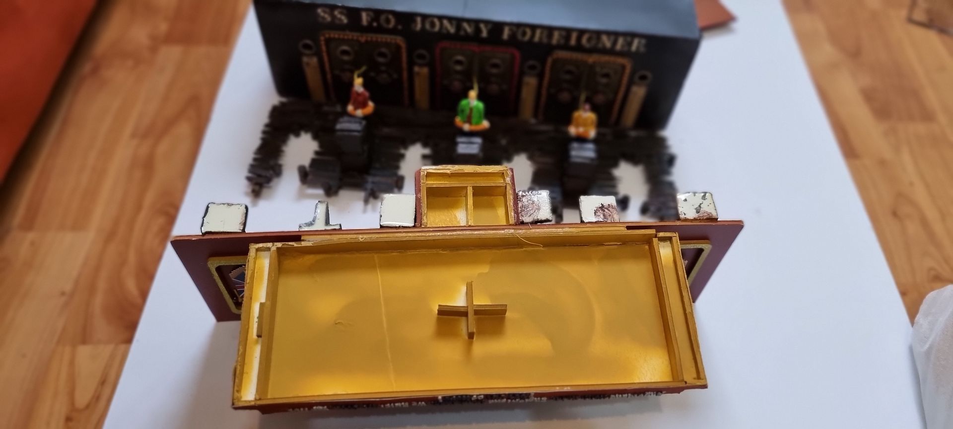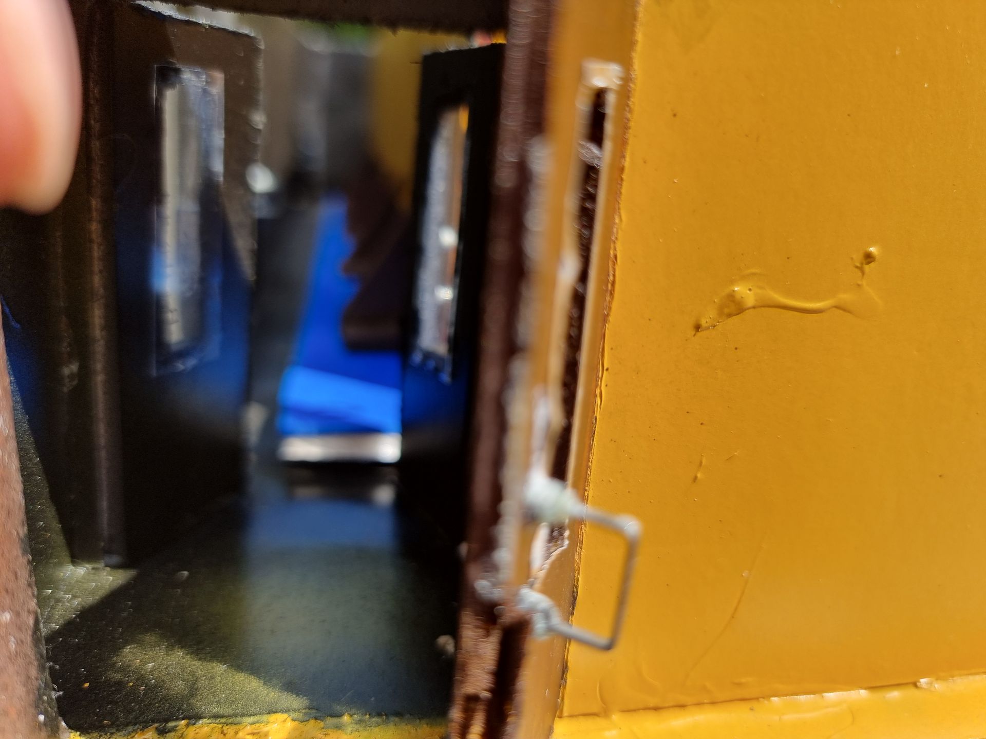 Laser cut dark acrylic disc were added to inside of the portholes. The inside of the shop box had lots of A Frame glued into place using a mix of accelerated superglue and rapid epoxy glue.