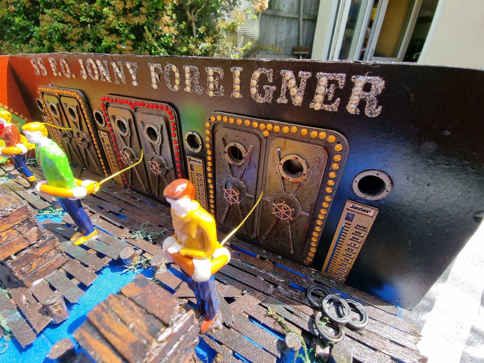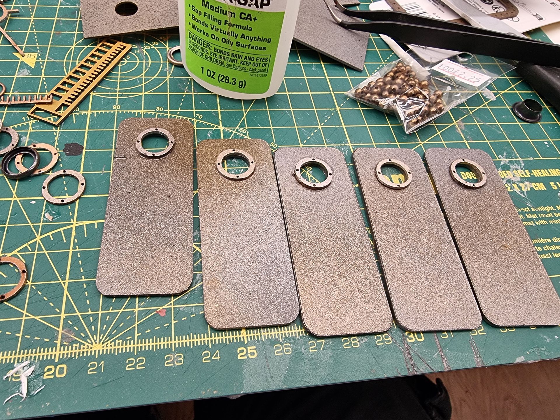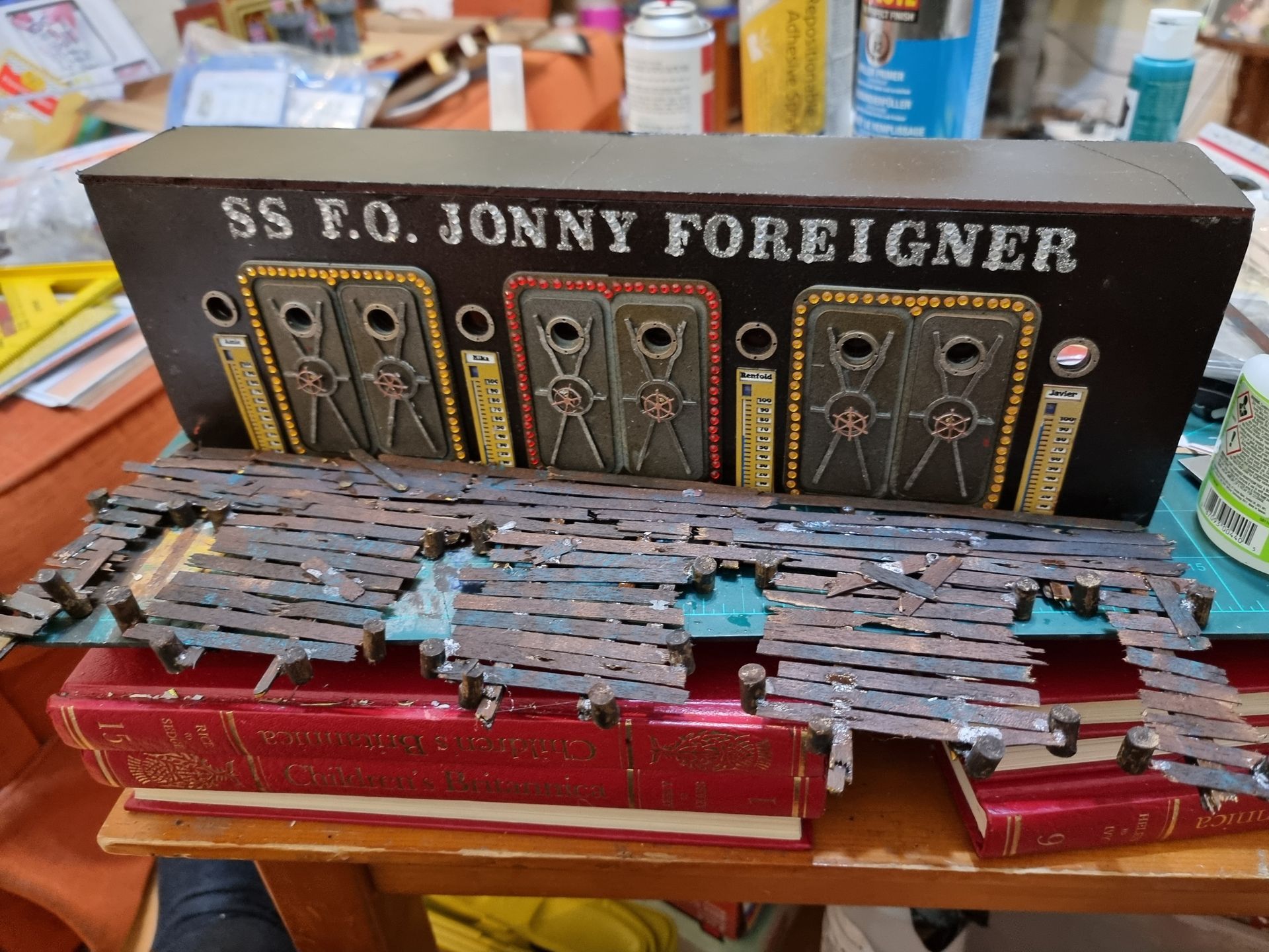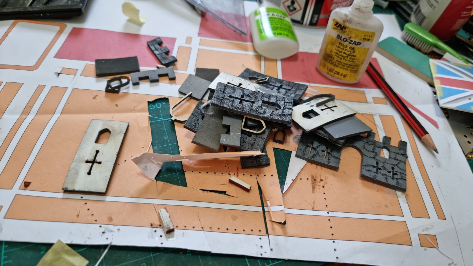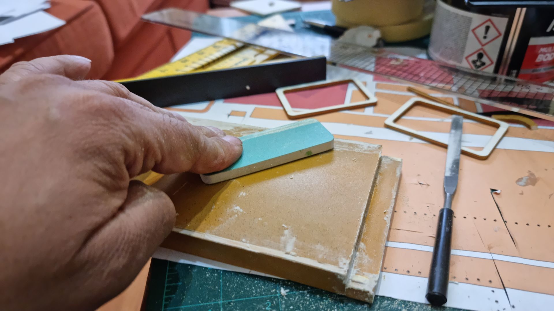 Laser cut dark acrylic disc were added to inside of the portholes. The inside of the shop box had lots of A Frame glued into place using a mix of accelerated superglue and rapid epoxy glue.