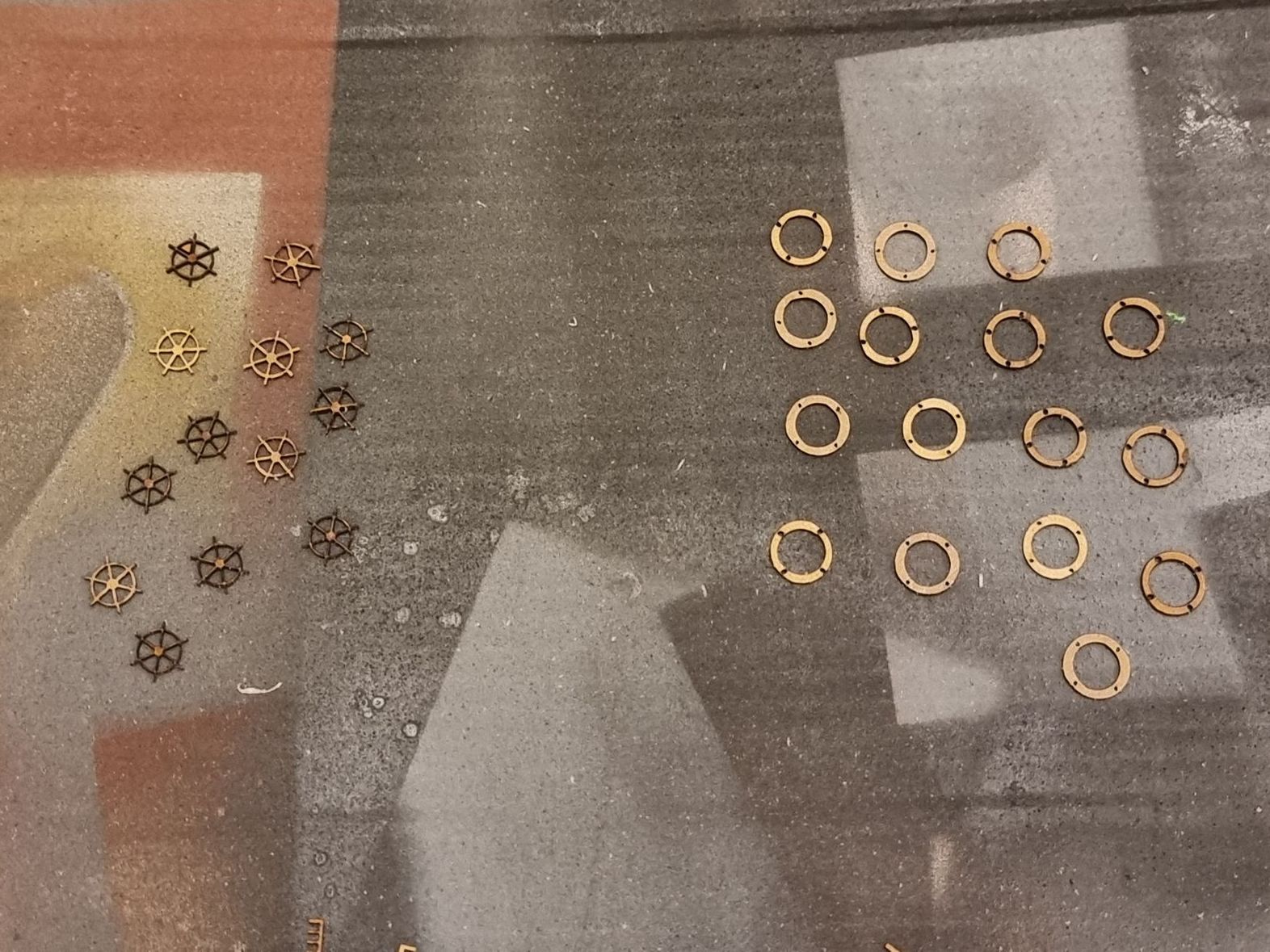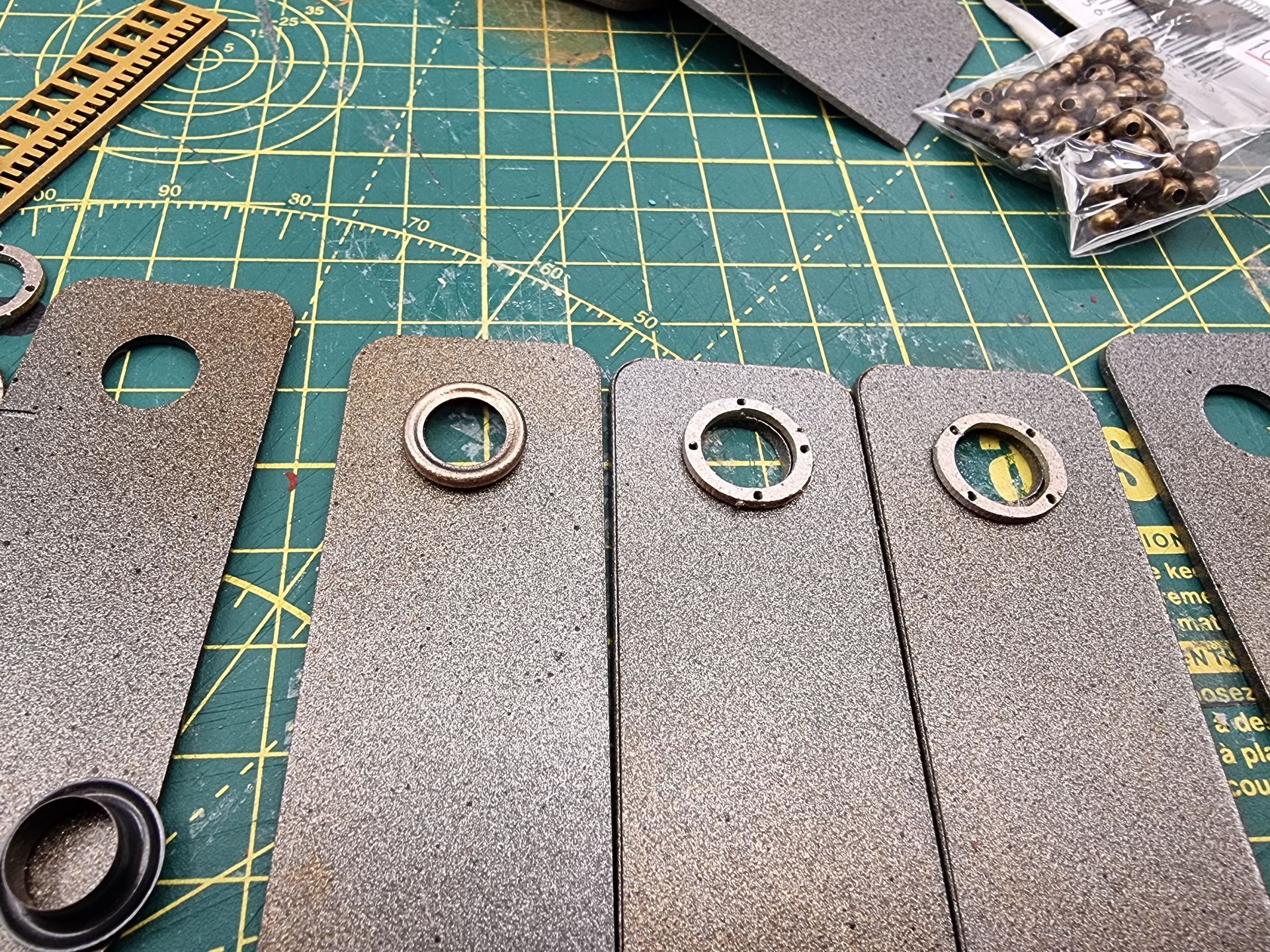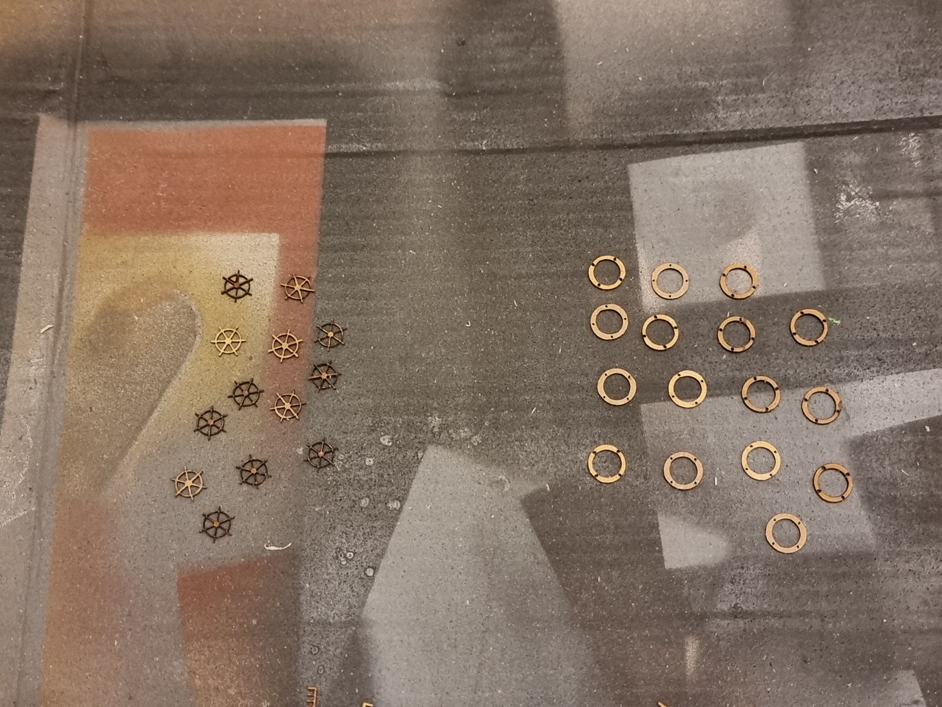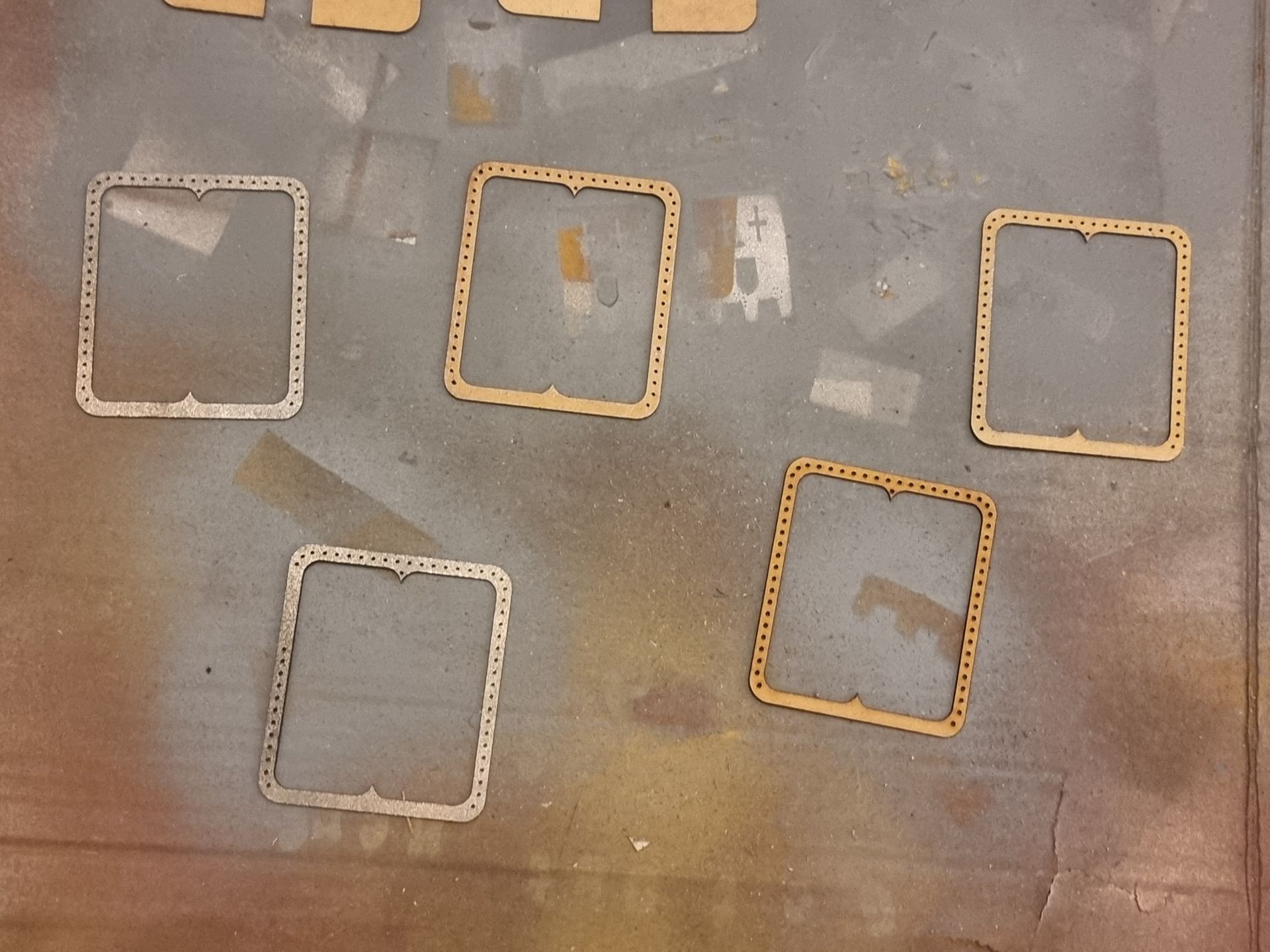 The portholes were also MDF as previous plastic attempts had warped. I also look into making portholes with 10 cm ringlets intended for clothes, flags and connecting strong points in materialsm but then would have not bolt holes on them.