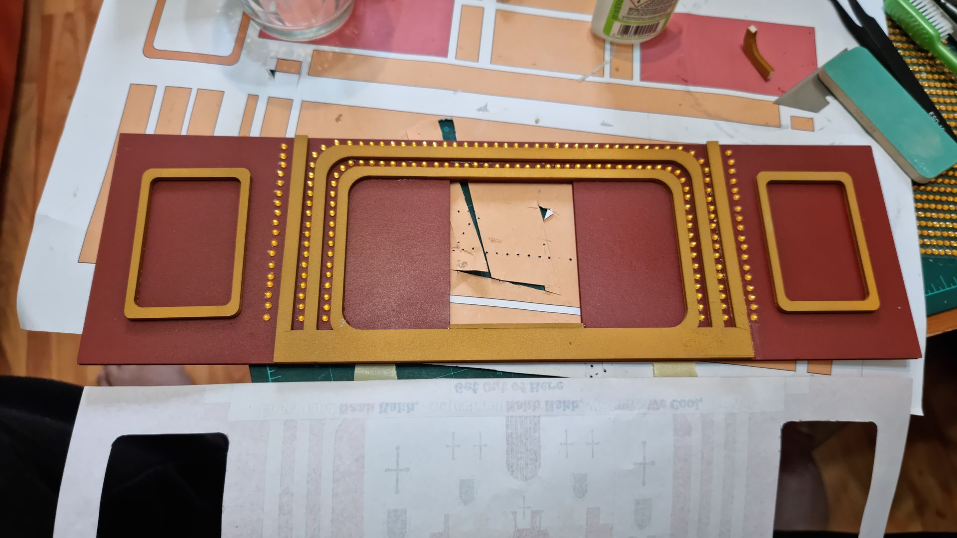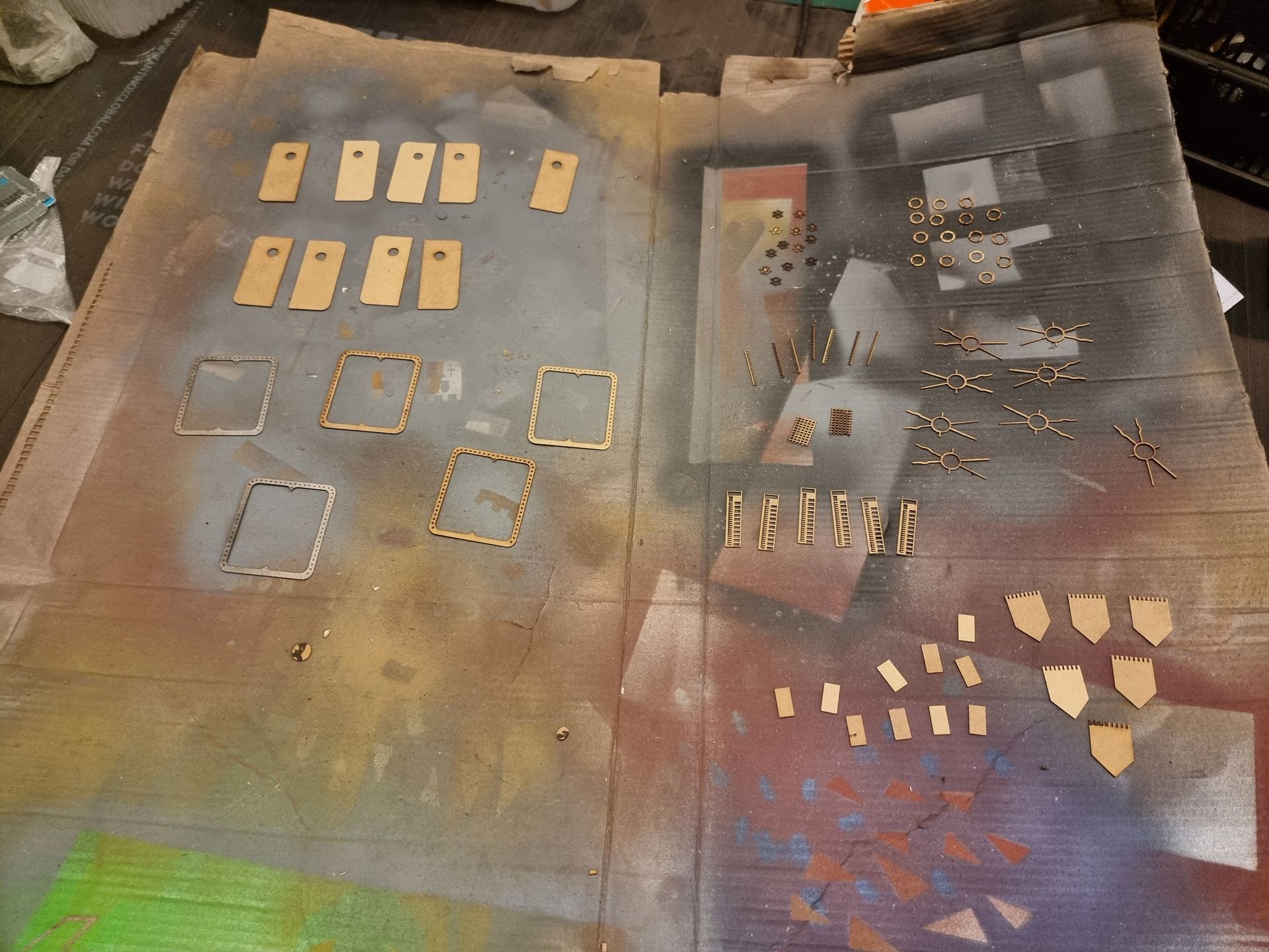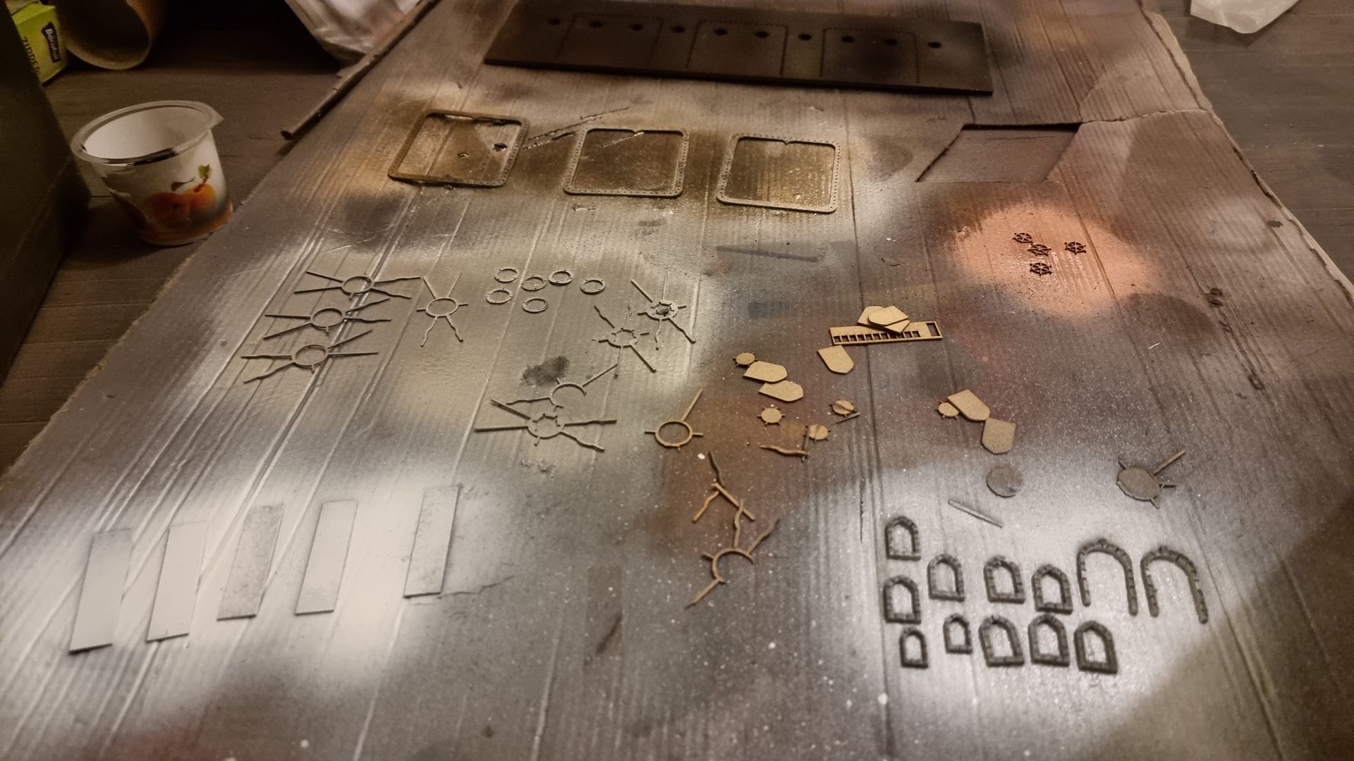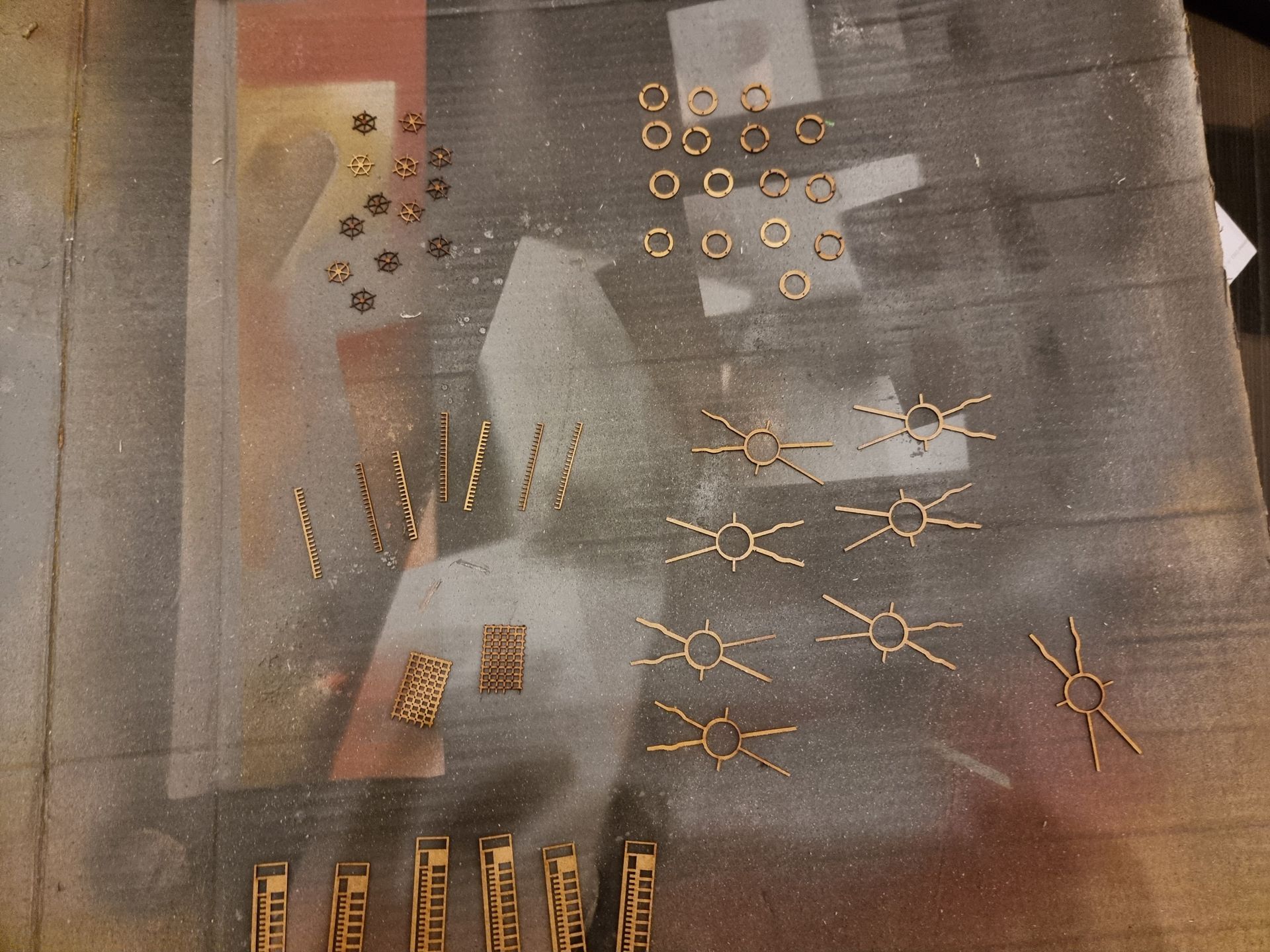 The portholes were also MDF as previous plastic attempts had warped. I also look into making portholes with 10 cm ringlets intended for clothes, flags and connecting strong points in materialsm but then would have not bolt holes on them.