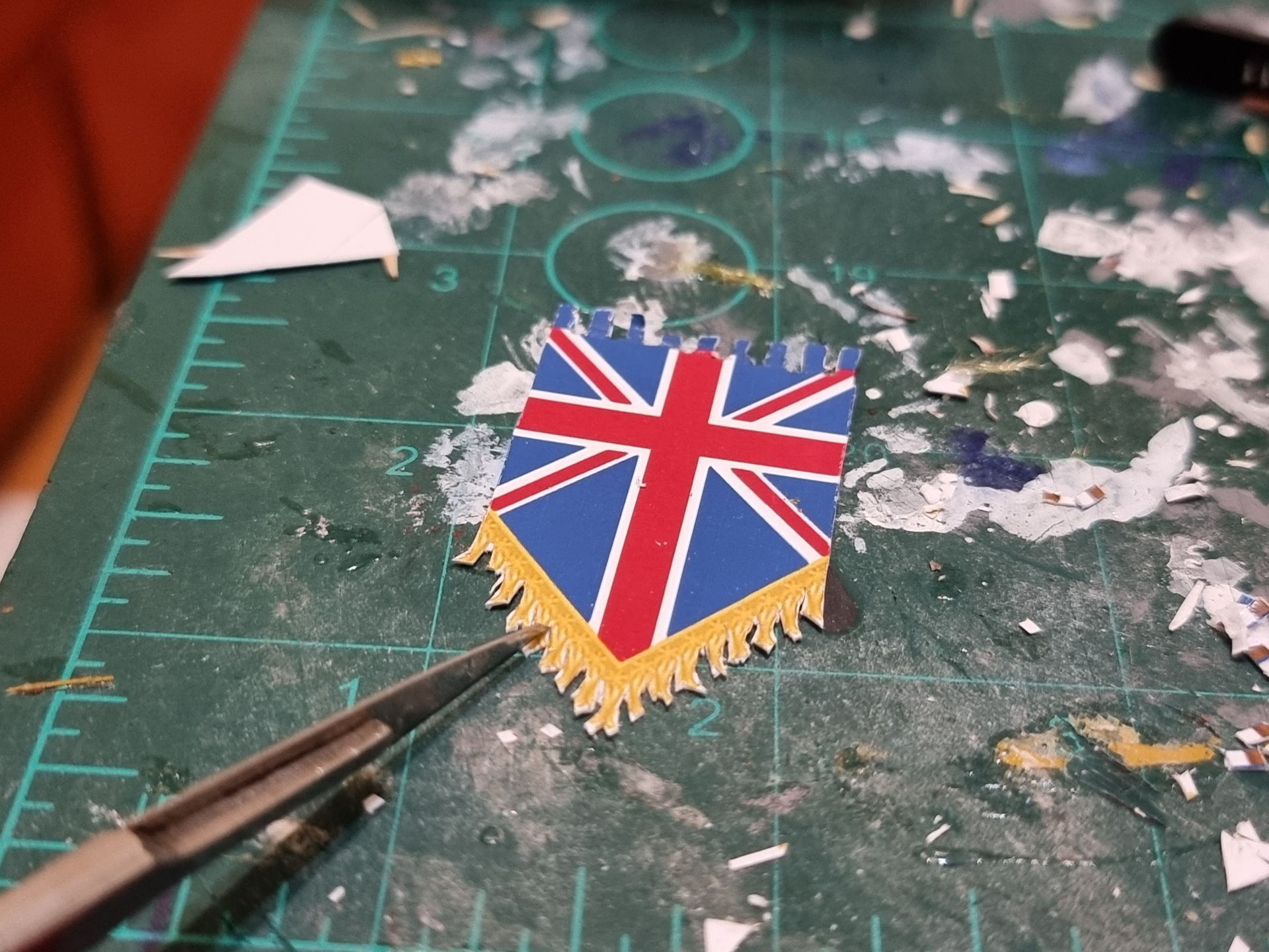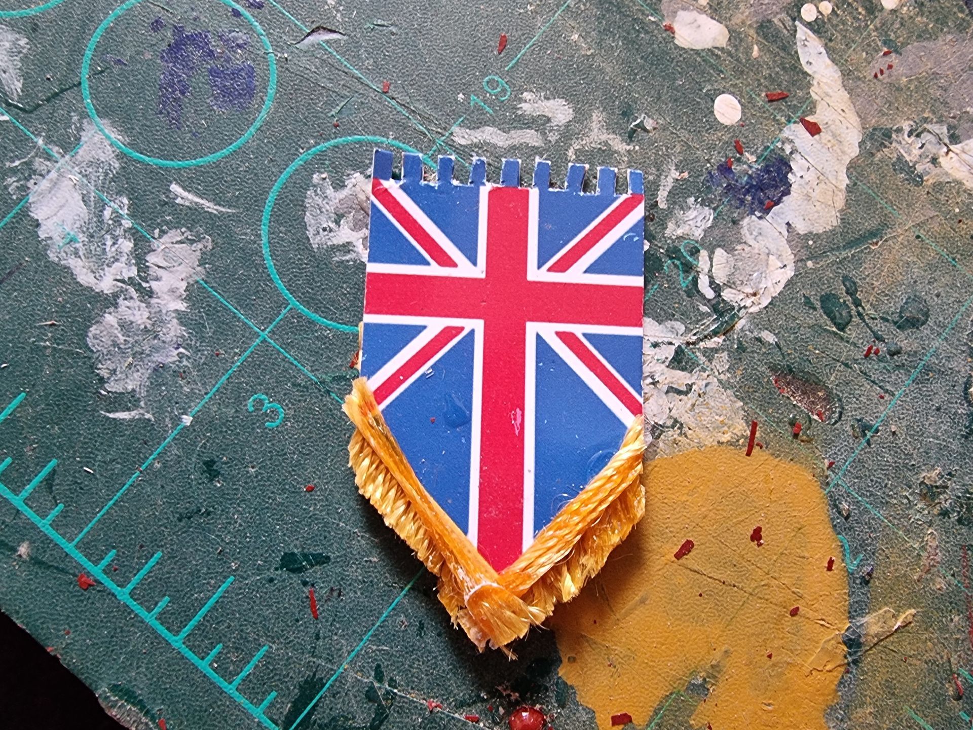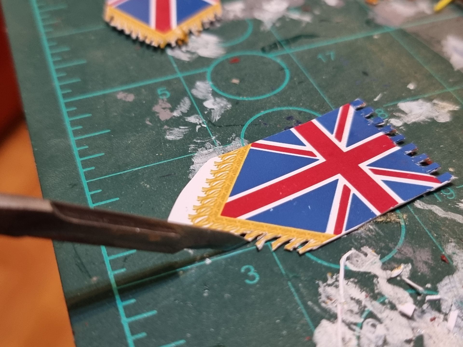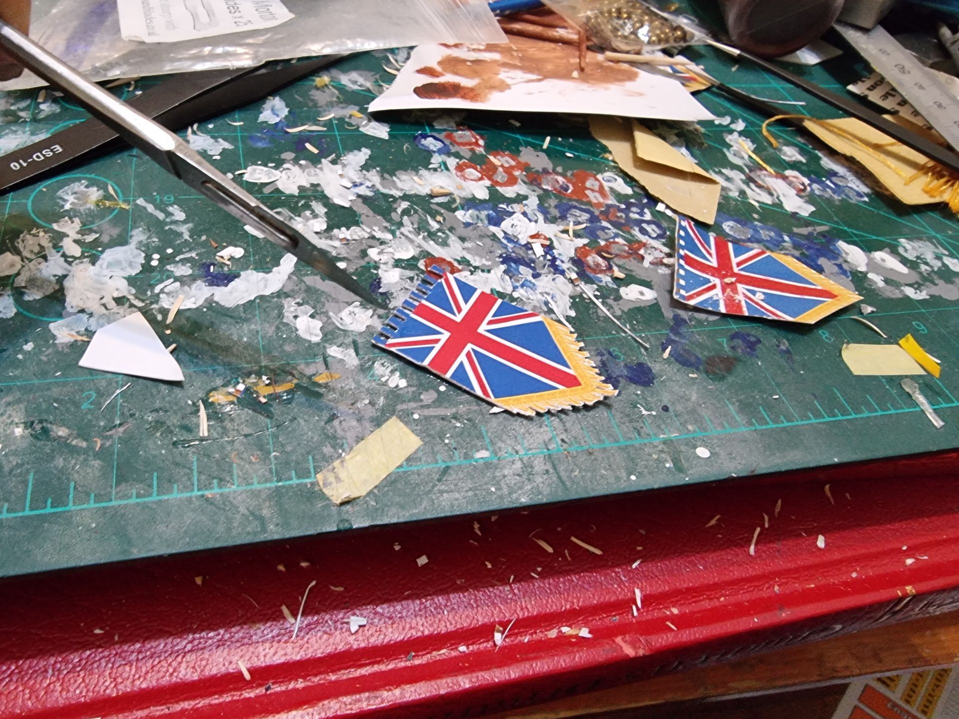 At a model level I just went to my local toy shop and purchased a £2.00 packet of rubber hollow sharks. used Stanley and scalpel blades to splice them and glue on the flags.