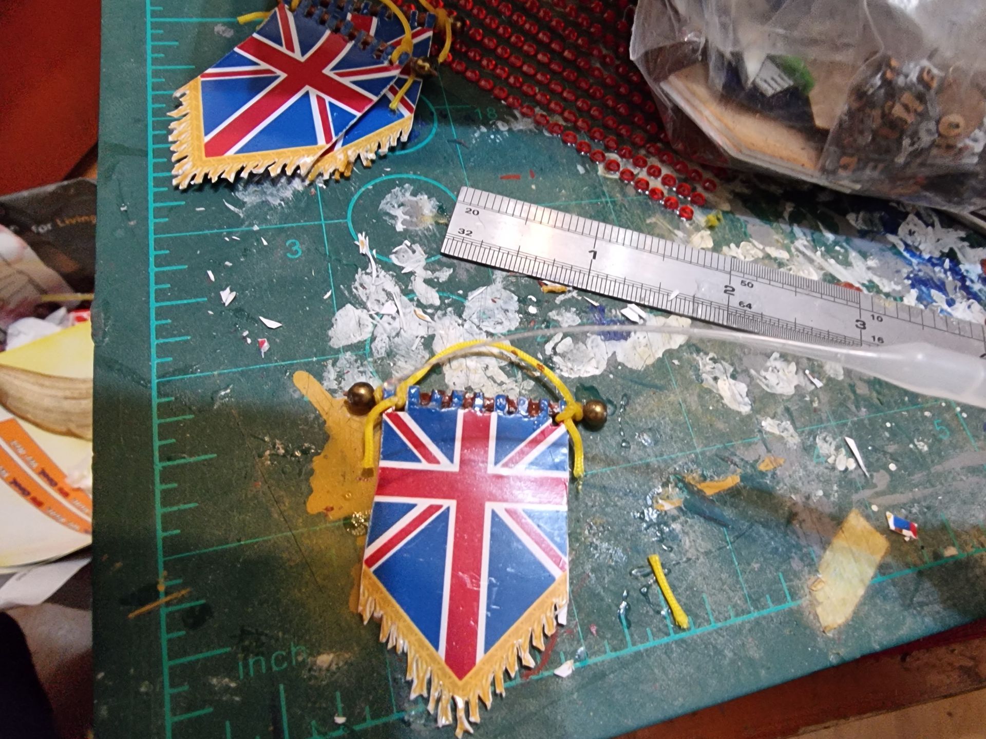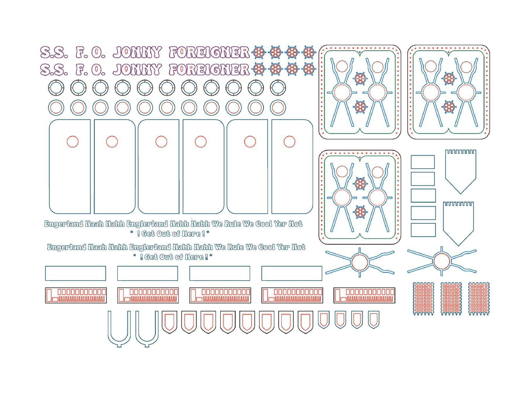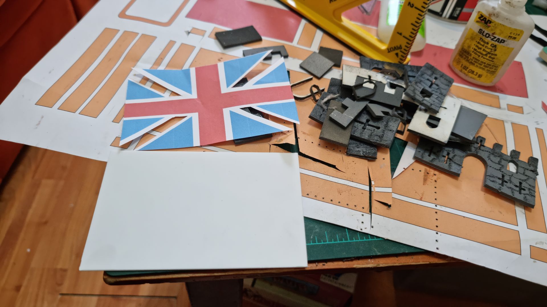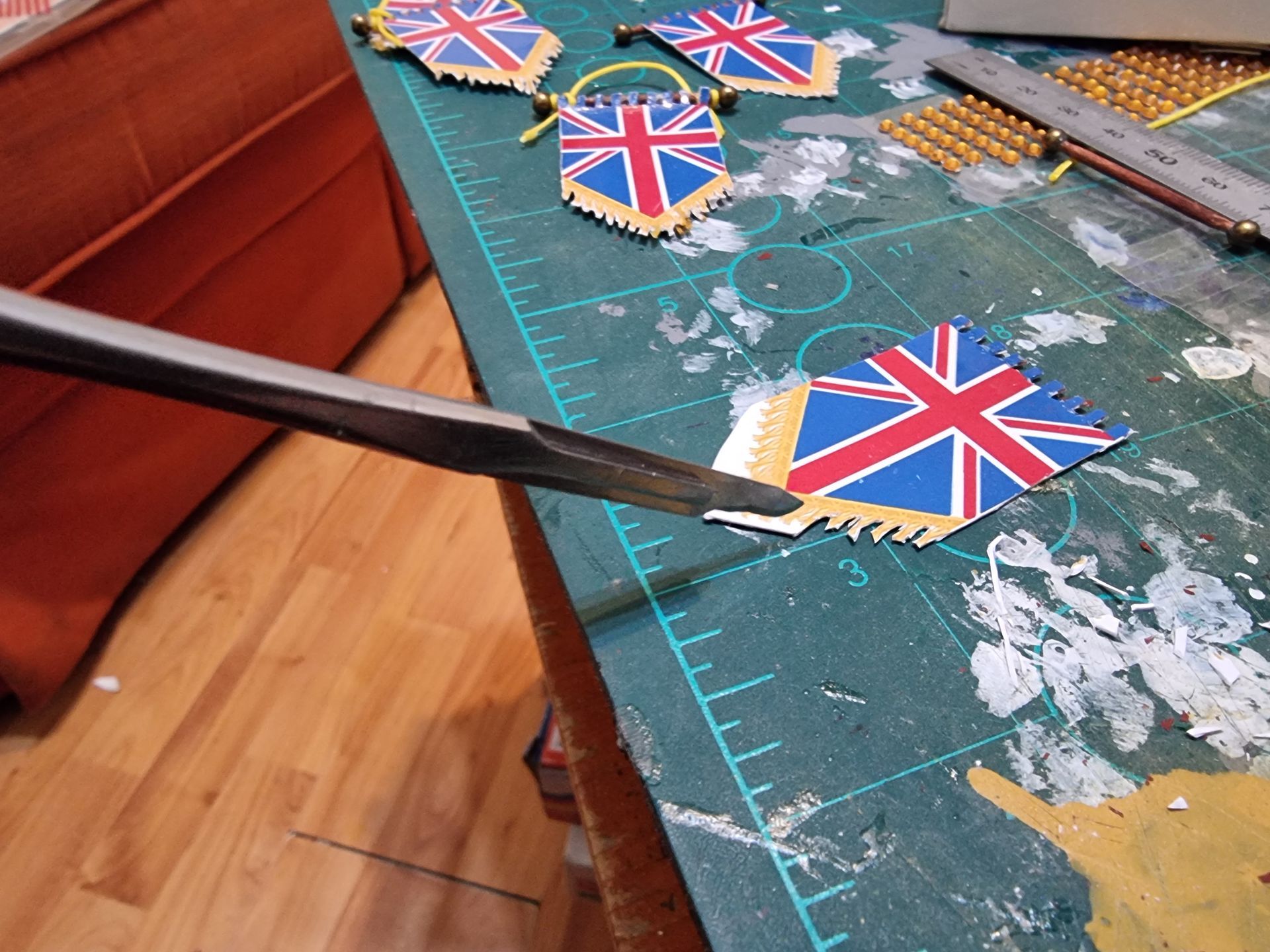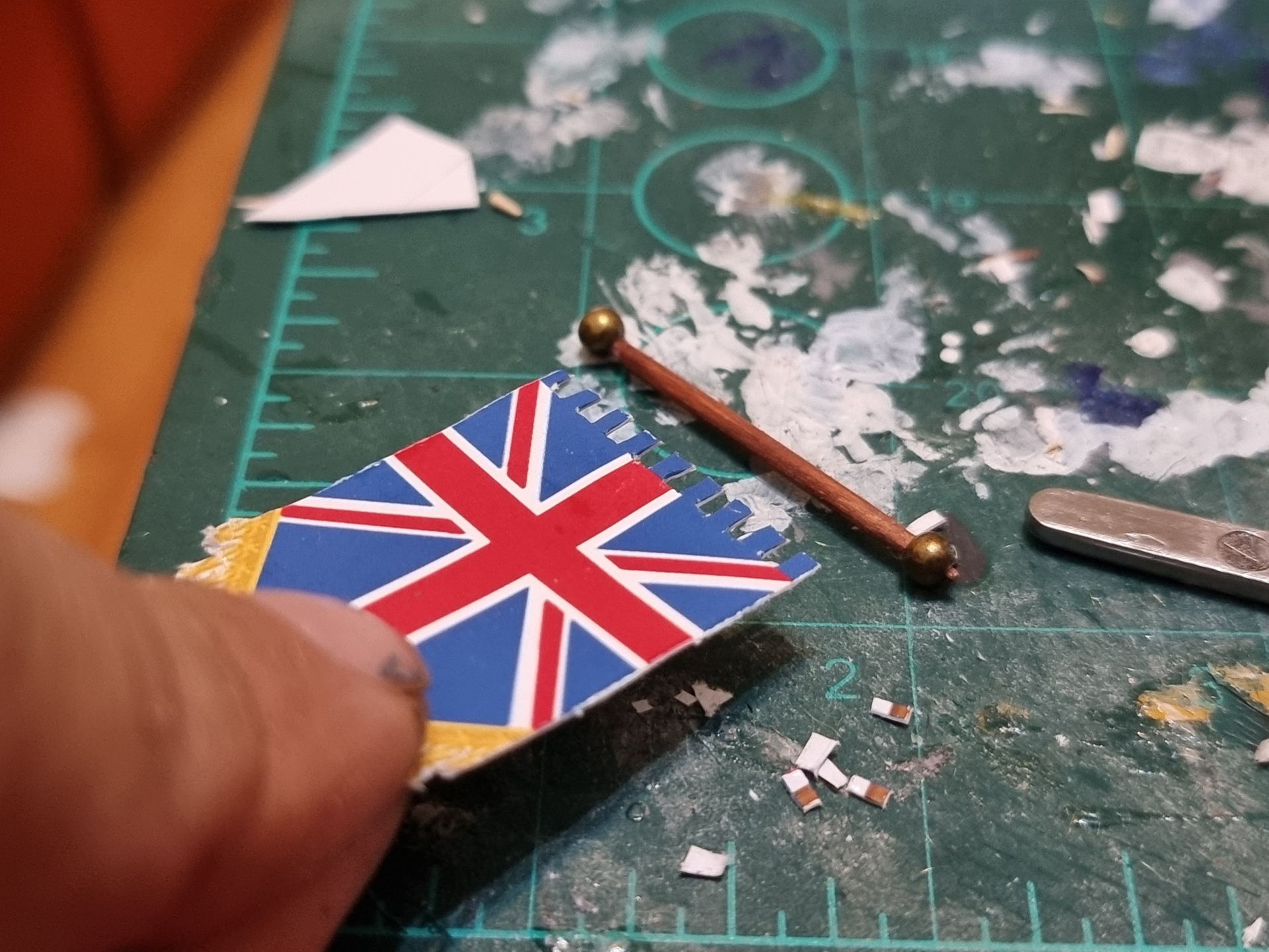 At a model level I just went to my local toy shop and purchased a £2.00 packet of rubber hollow sharks. used Stanley and scalpel blades to splice them and glue on the flags.