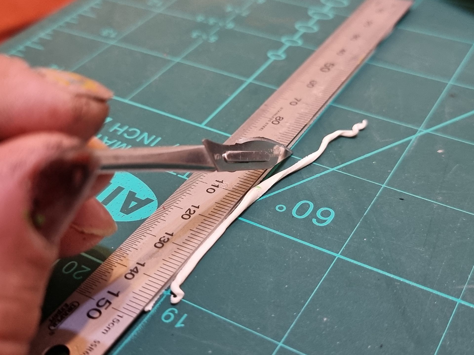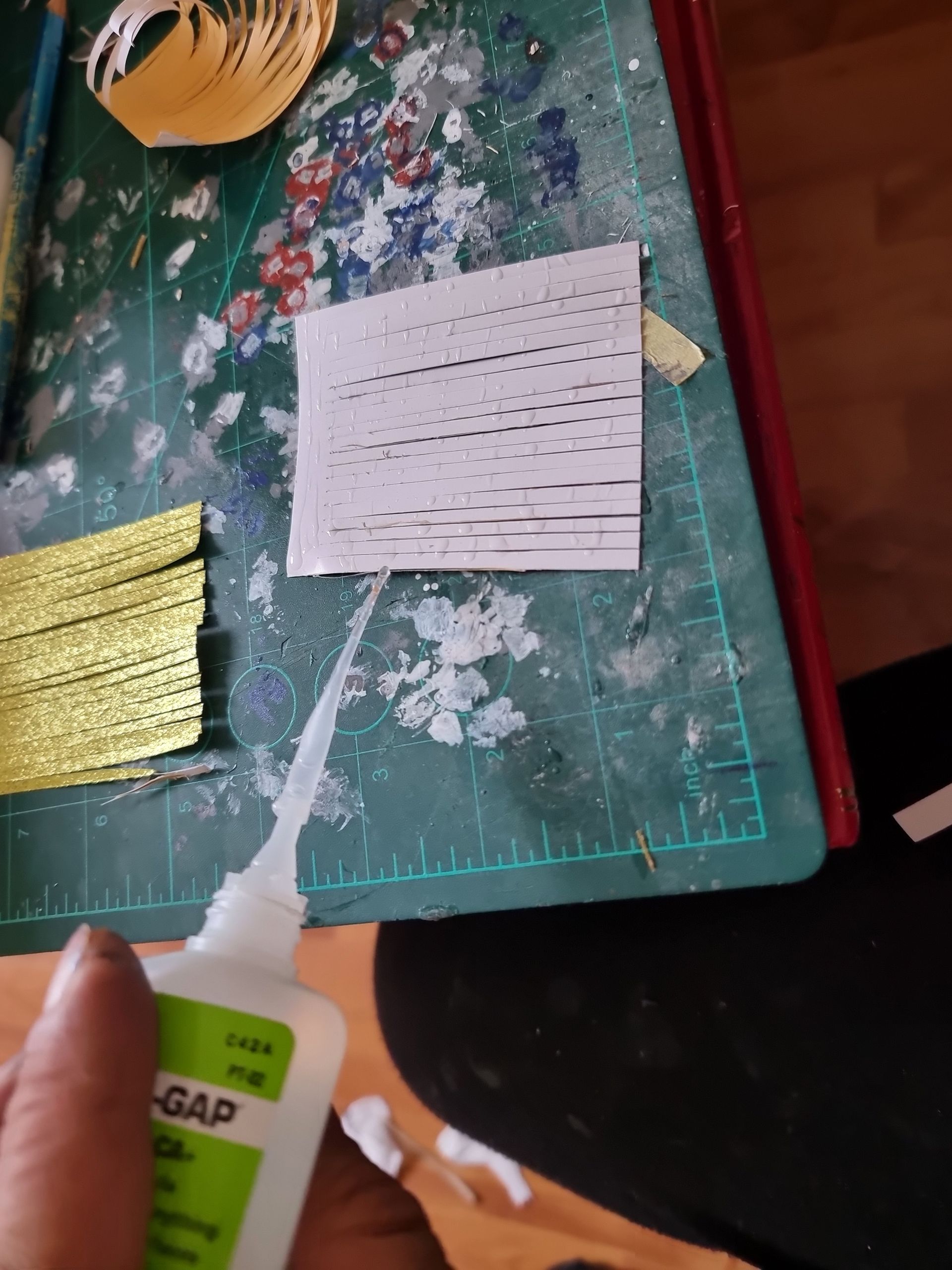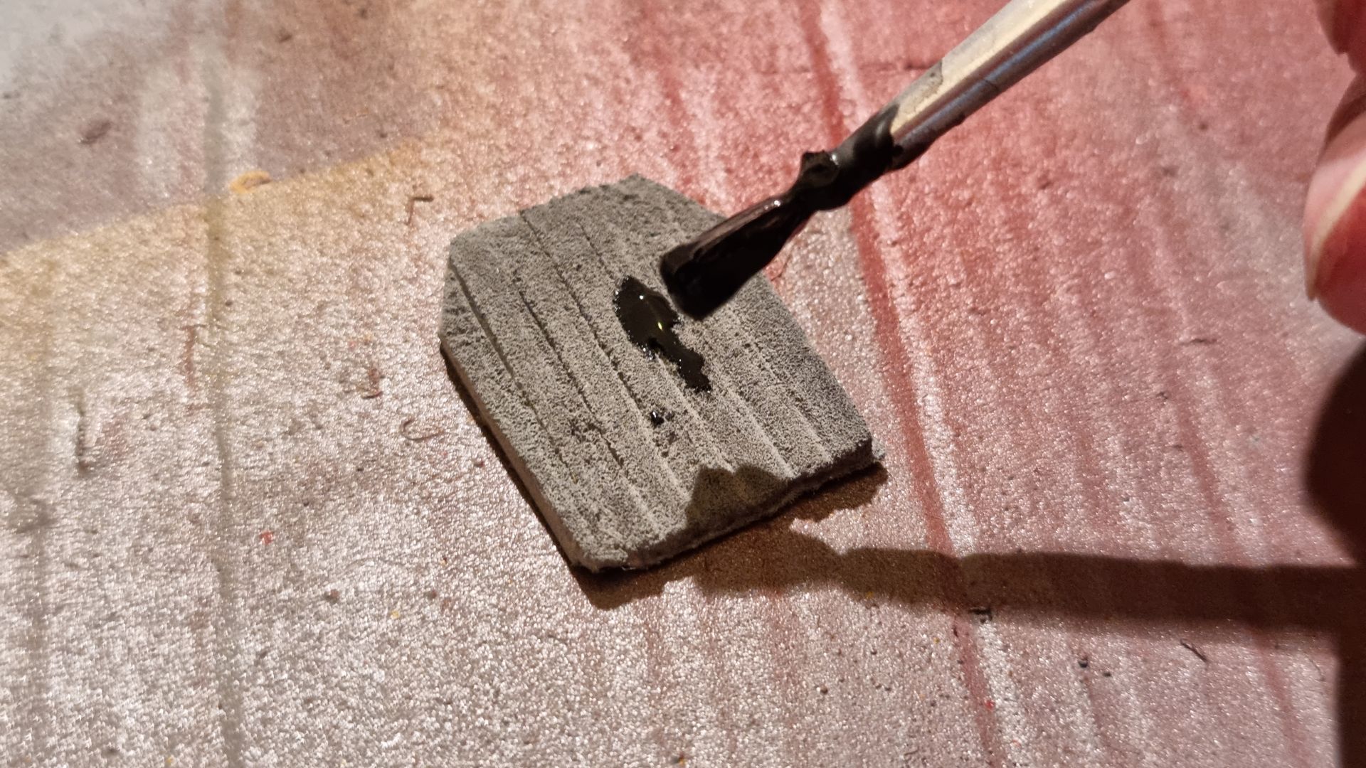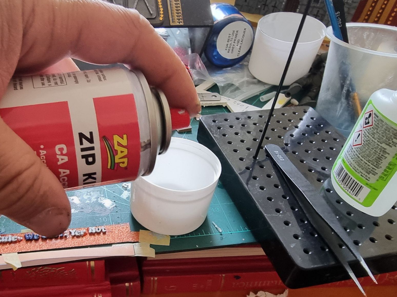 When using superglue and accelerator I saw it left white stain steals of hardened glue. Instead of this messing things up I noticed they could be used as wakes and movement streaks so I painted the streaks with the glue.