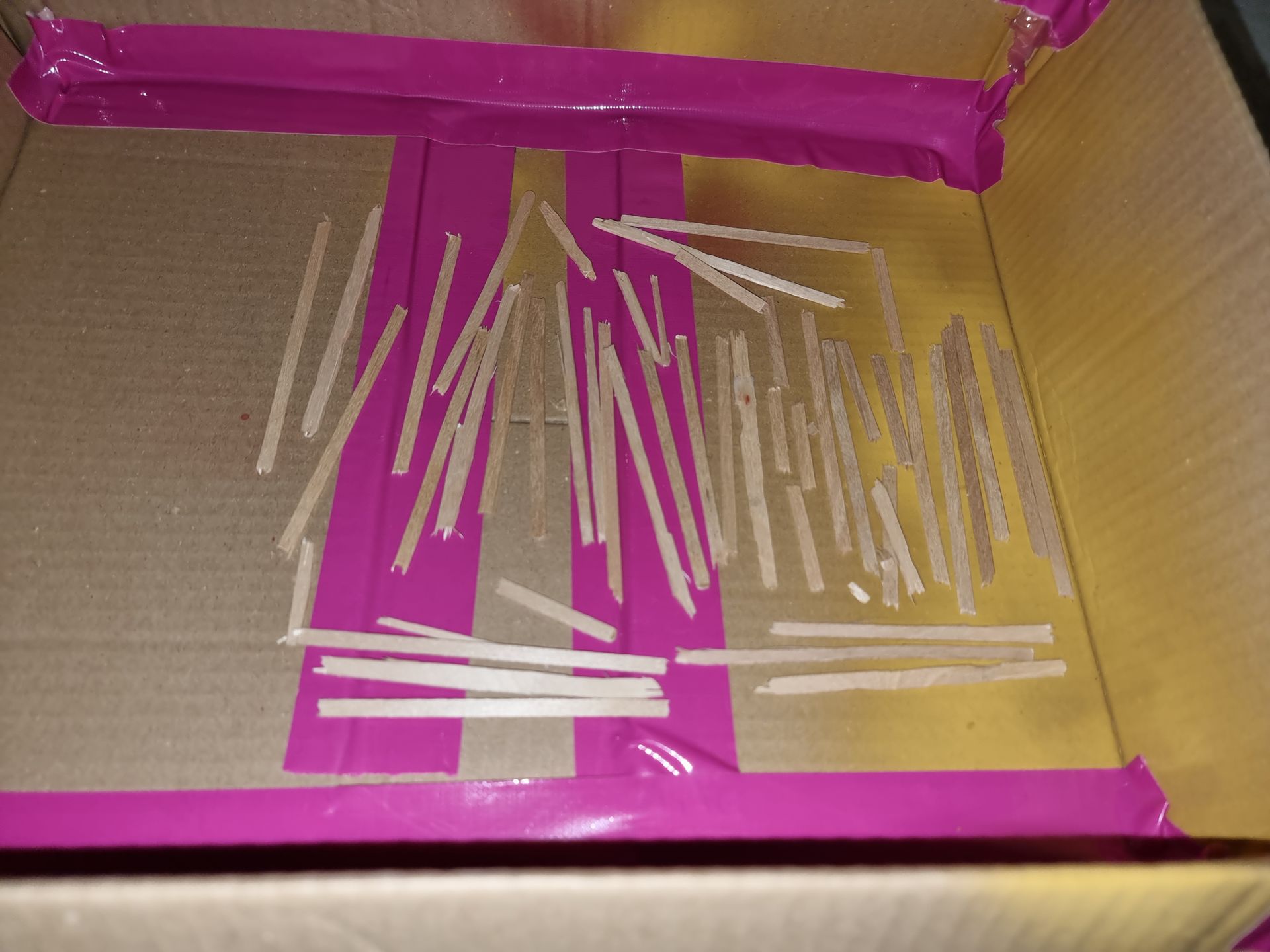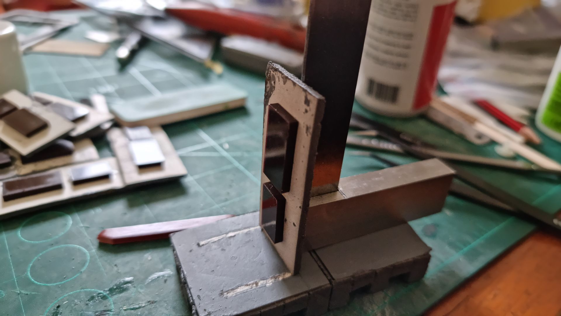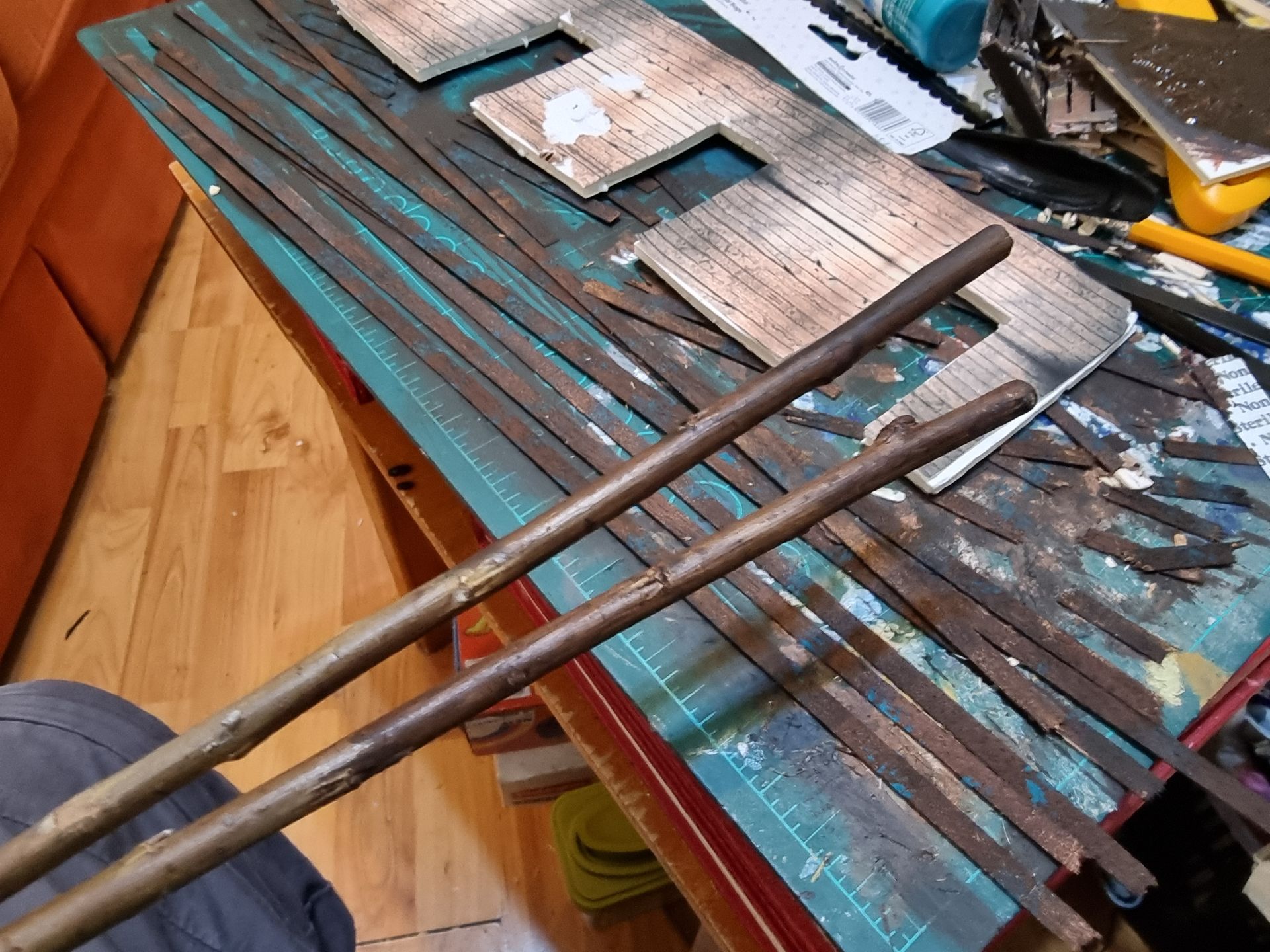 This time no laser cutting or CAD designing. This was constructed mostly from wooden coffee stirrers, split spatulas, strips of walnut laminate (Which looks old and darkened wood).