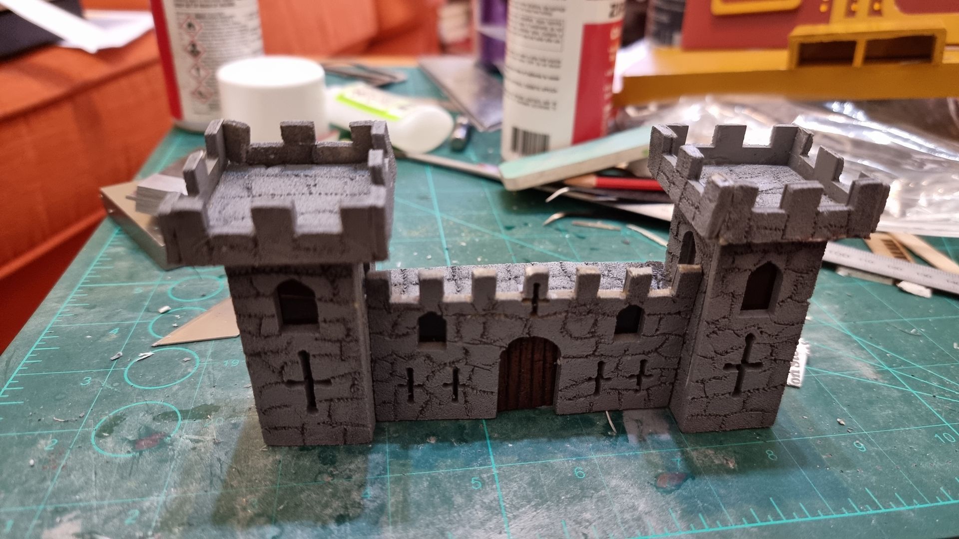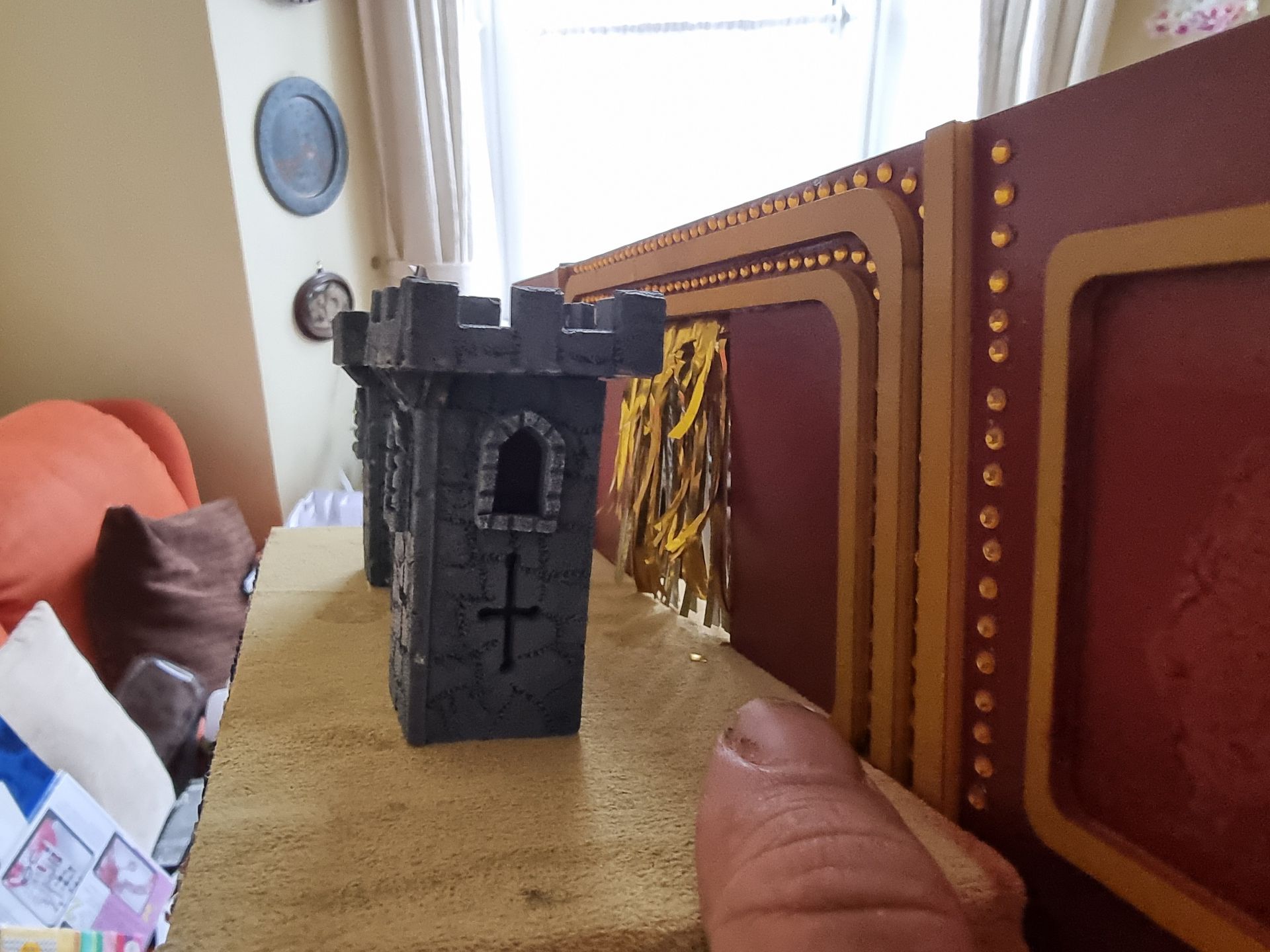 It seems a far easier idea to go with a mock castle gate house, that could look cheaply made be that out of polystyrene or wood that’s painted or coated in carved foam or plaster or simply painted card, paper or material over a wooden frame. The cheap, low tech tacky look would fit the style of a 70s game show and be far easier, quicker and more importantly very cheap to construct, take apart assemble and store, possibly for re-use later.