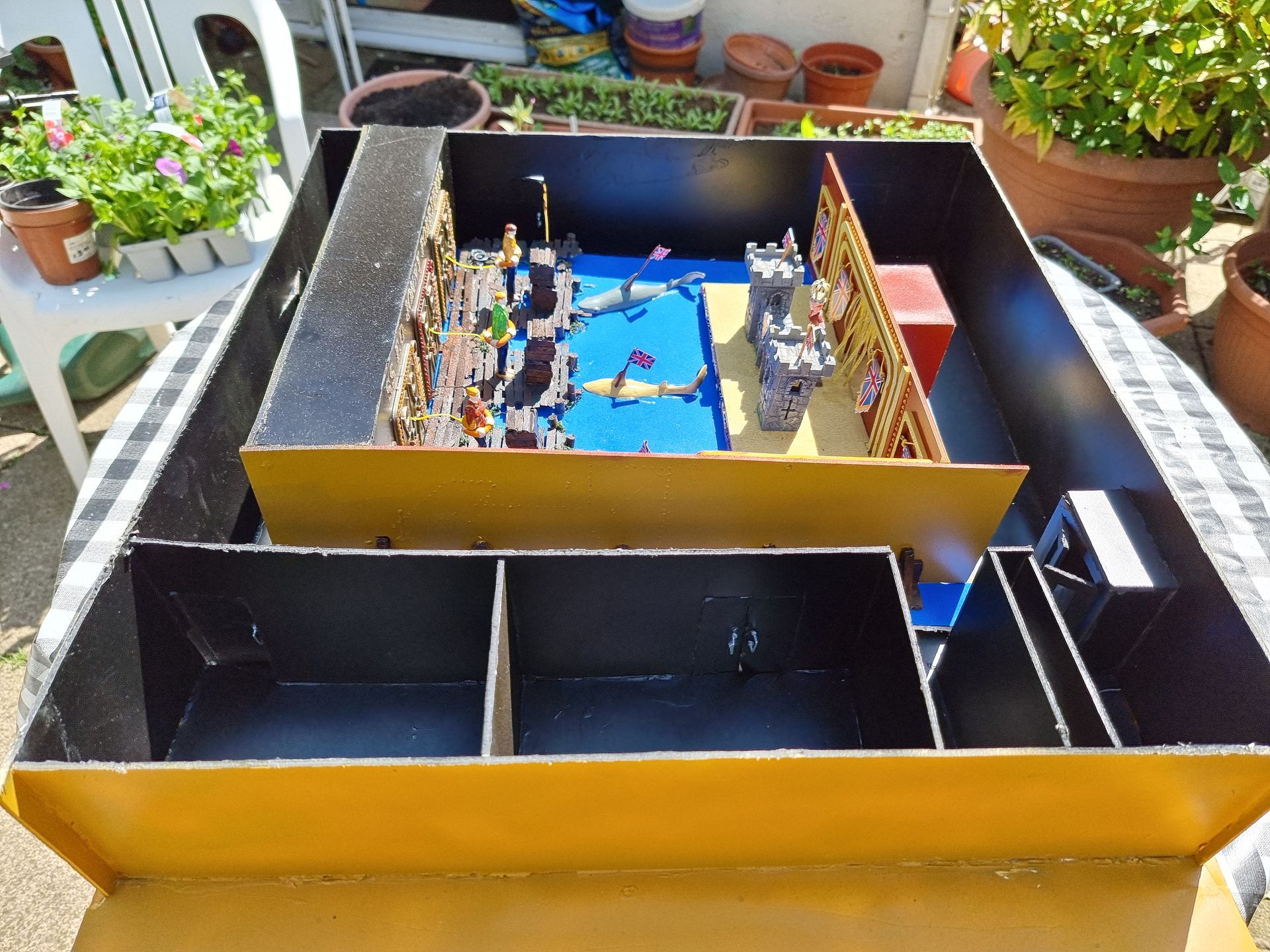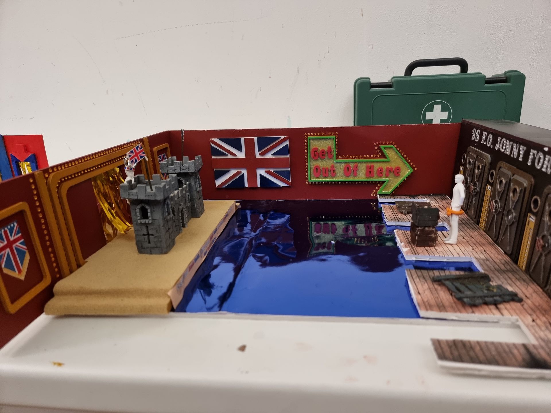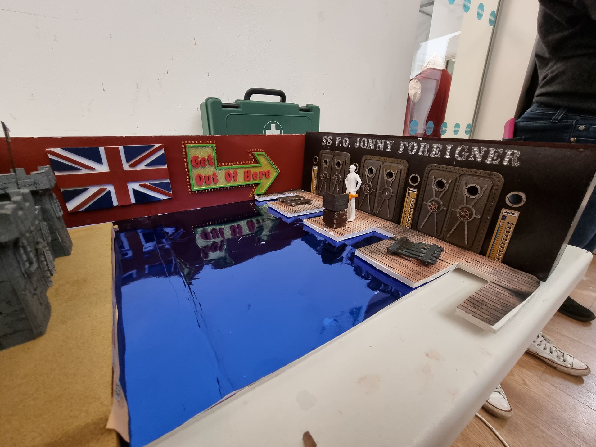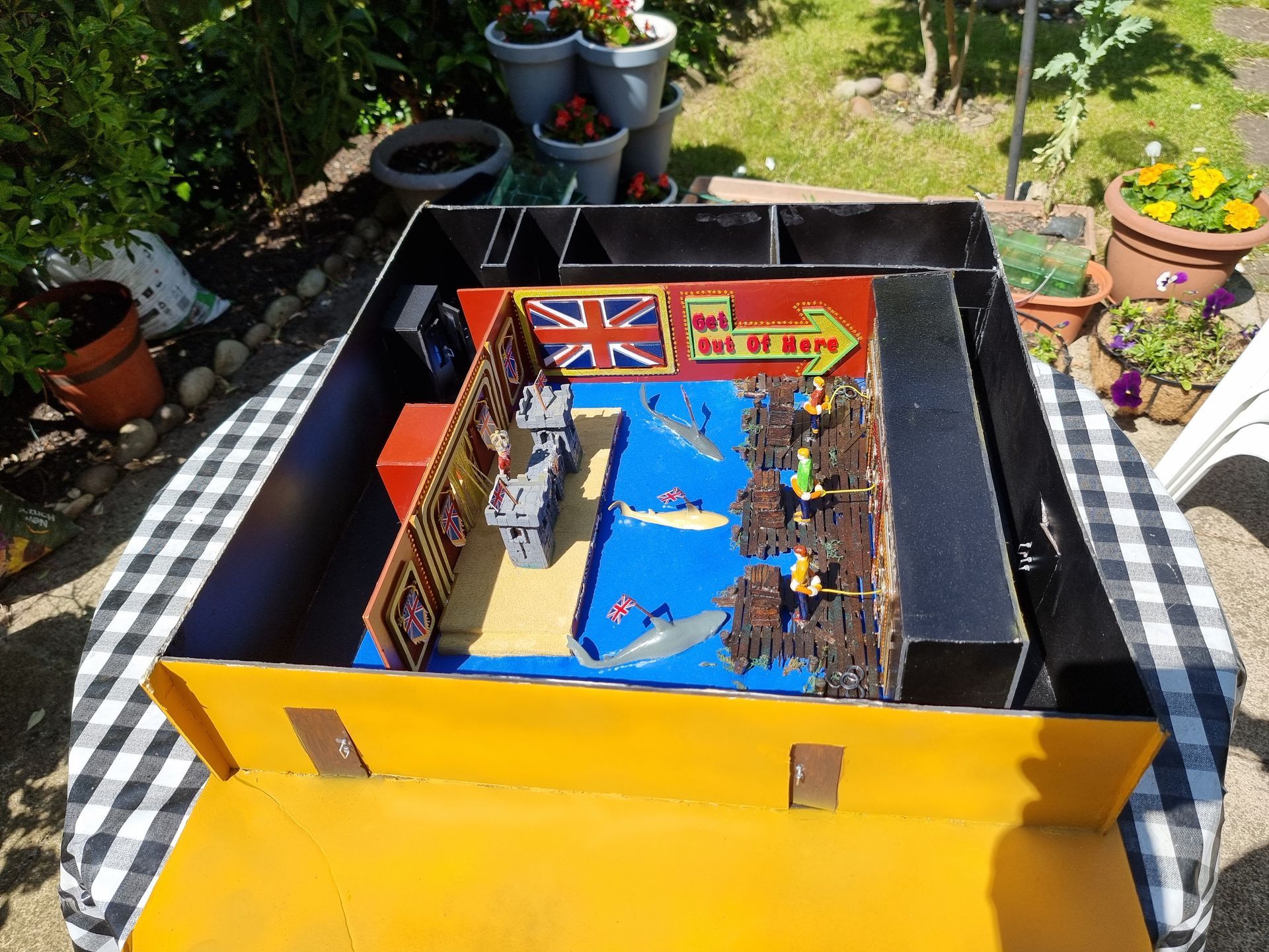 - The floor space dressed to represent the English Channel and a castle moat to keep out the migrants and infested with patriotic sharks (Originally warships either WW2 or 18th century style. Sharks would be easier to make, probably out of polystyrne and funnier, Austin Powers style).
