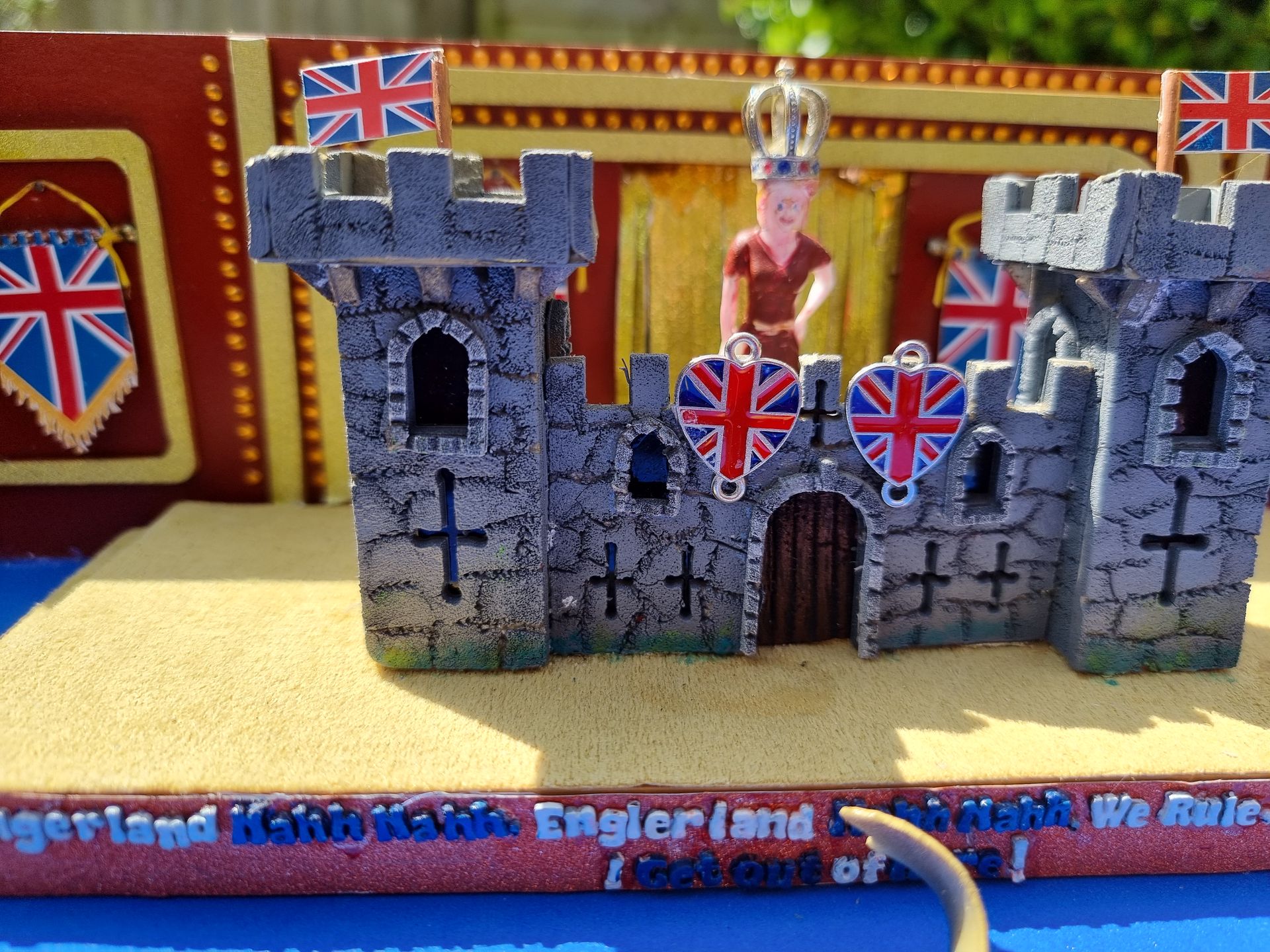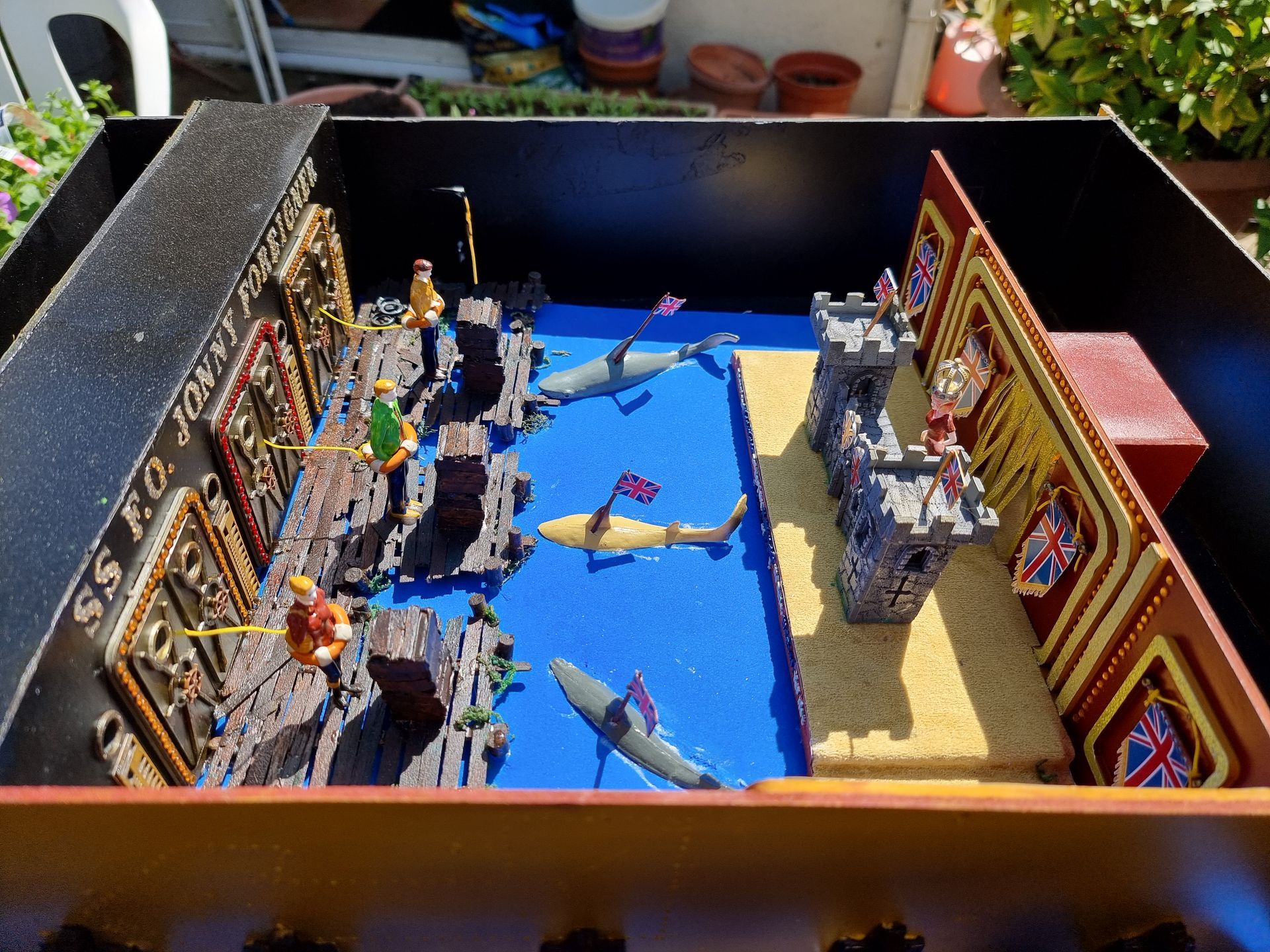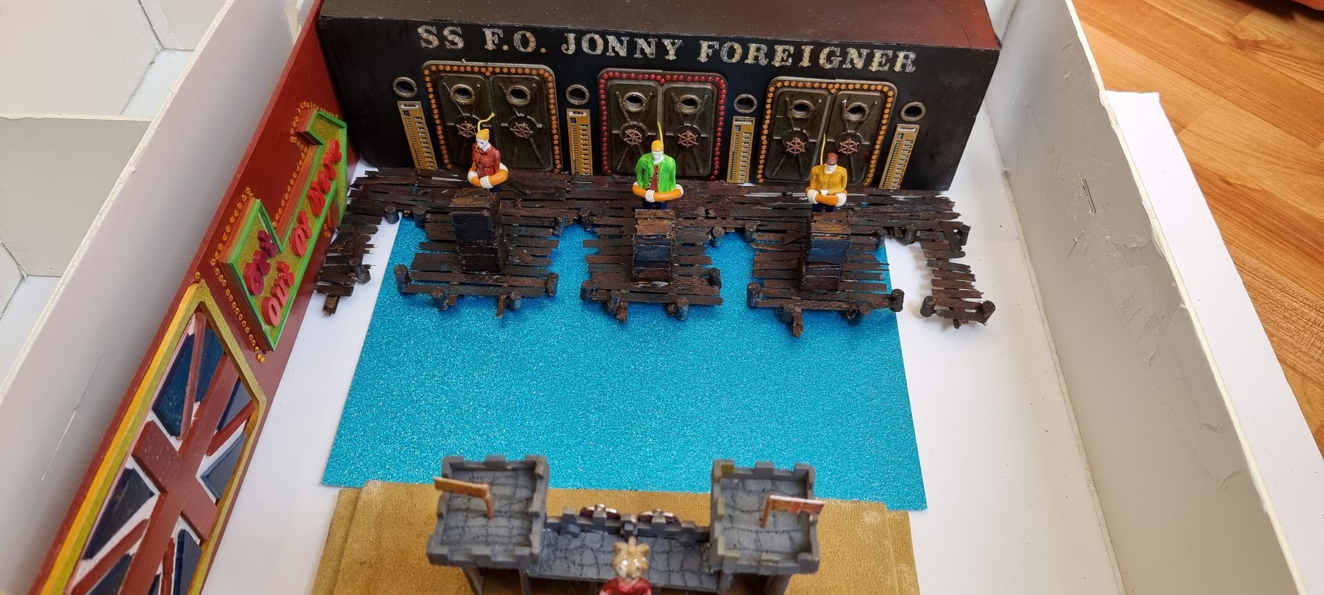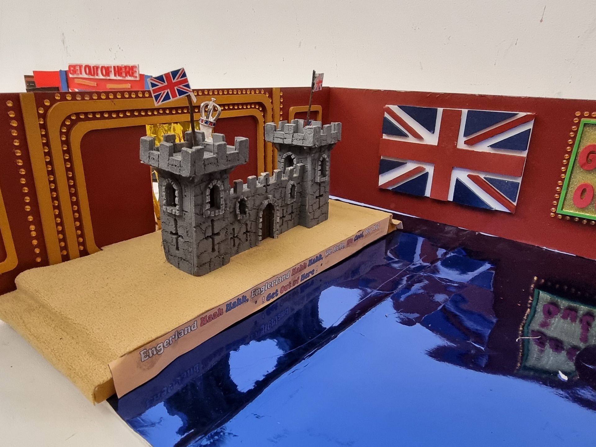 - The floor space dressed to represent the English Channel and a castle moat to keep out the migrants and infested with patriotic sharks (Originally warships either WW2 or 18th century style. Sharks would be easier to make, probably out of polystyrne and funnier, Austin Powers style).