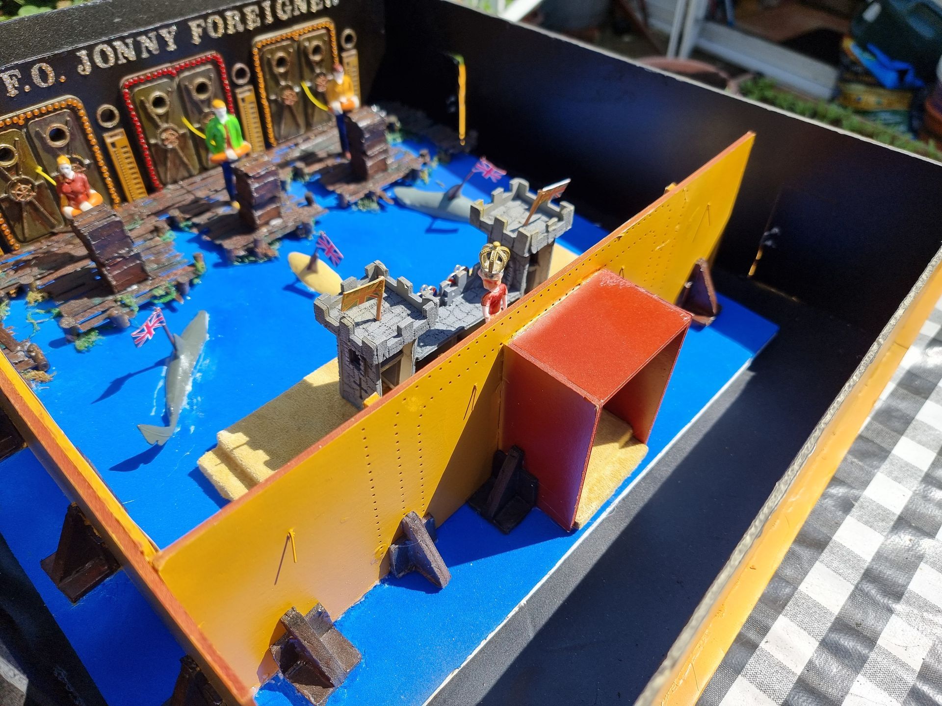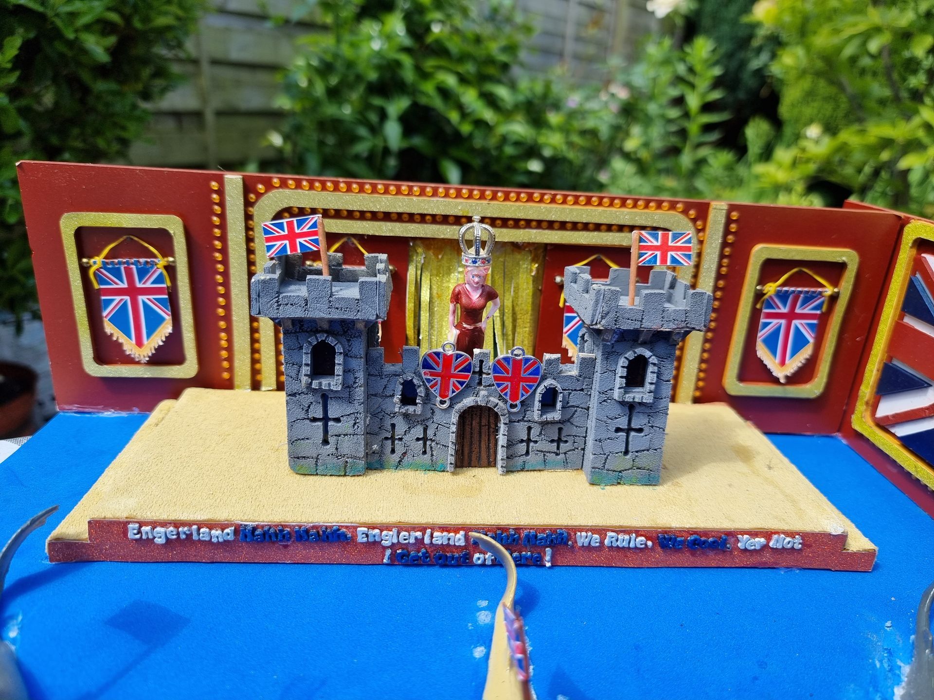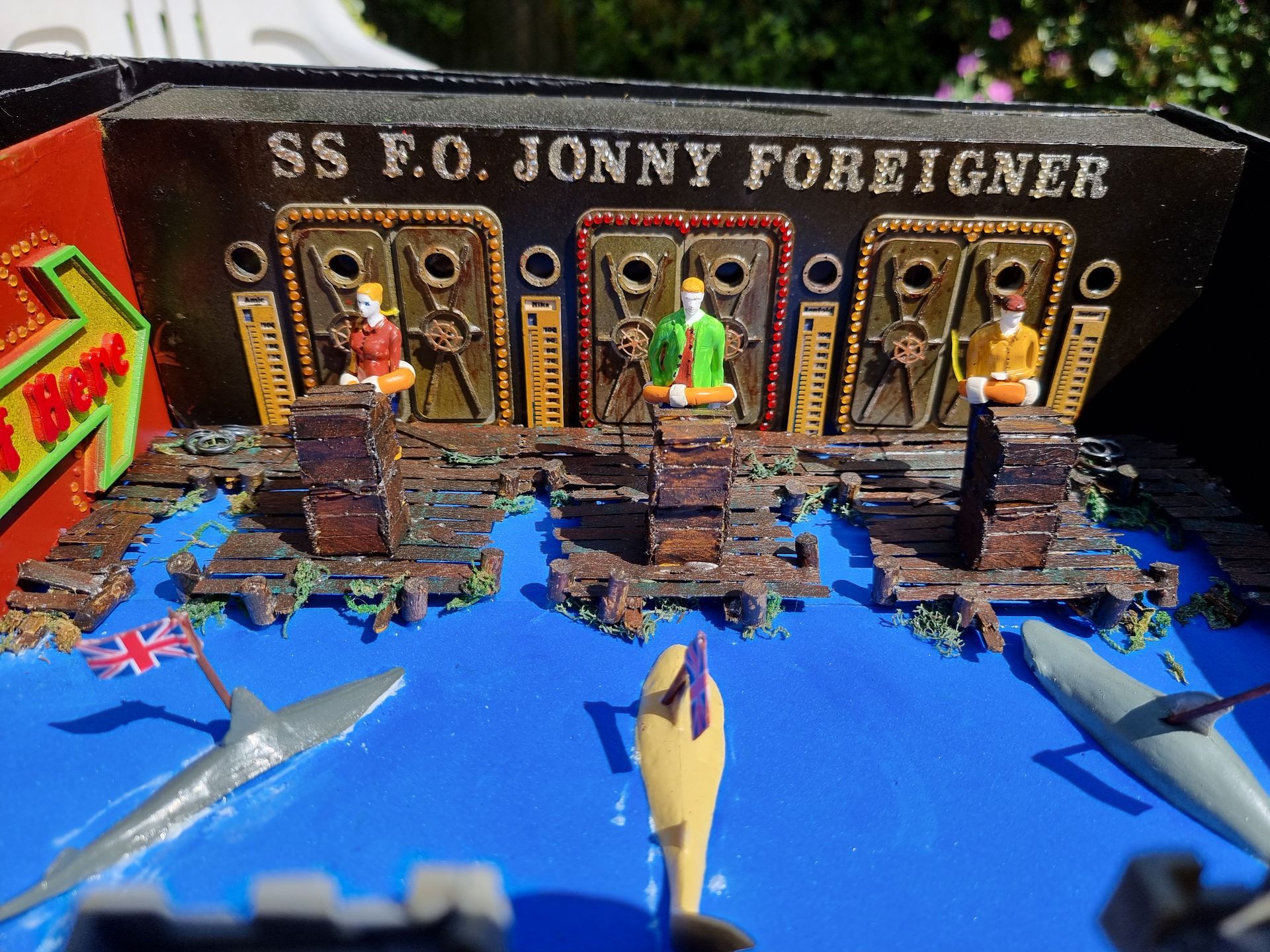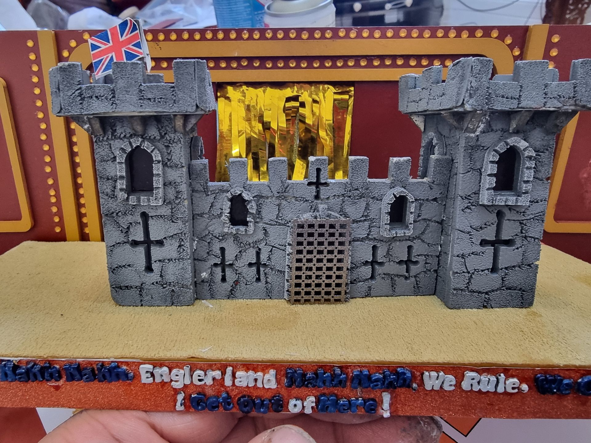 - The floor space dressed to represent the English Channel and a castle moat to keep out the migrants and infested with patriotic sharks (Originally warships either WW2 or 18th century style. Sharks would be easier to make, probably out of polystyrne and funnier, Austin Powers style).