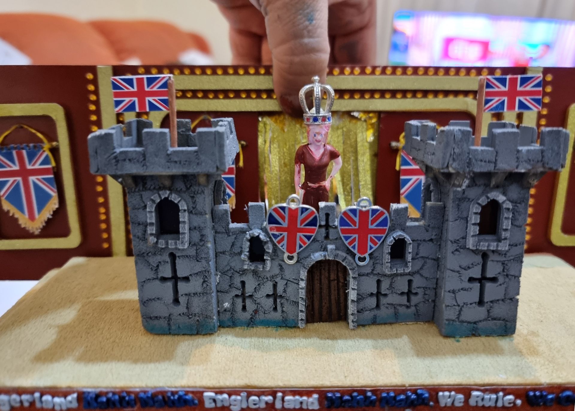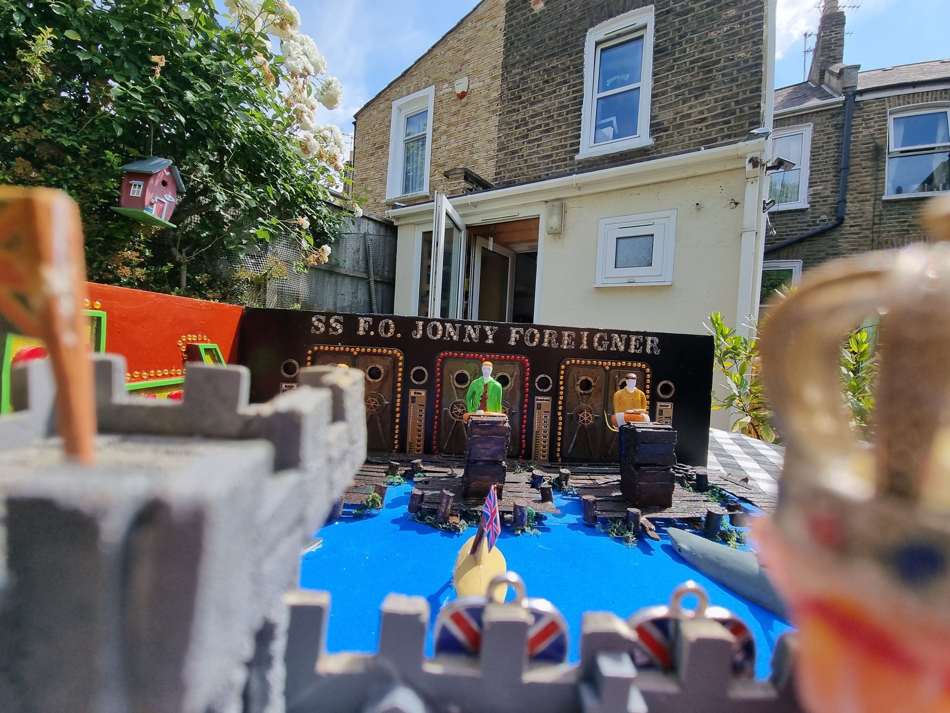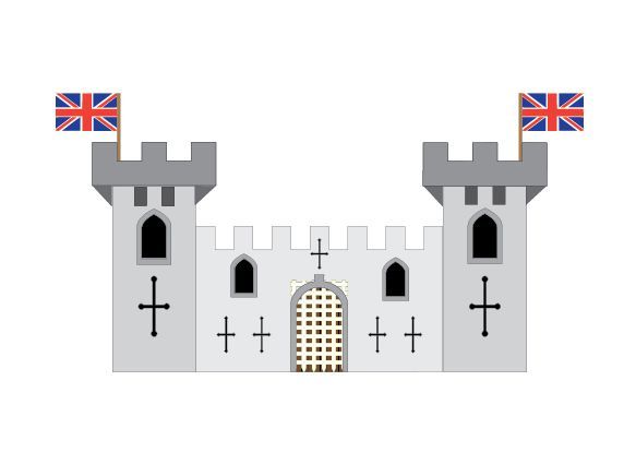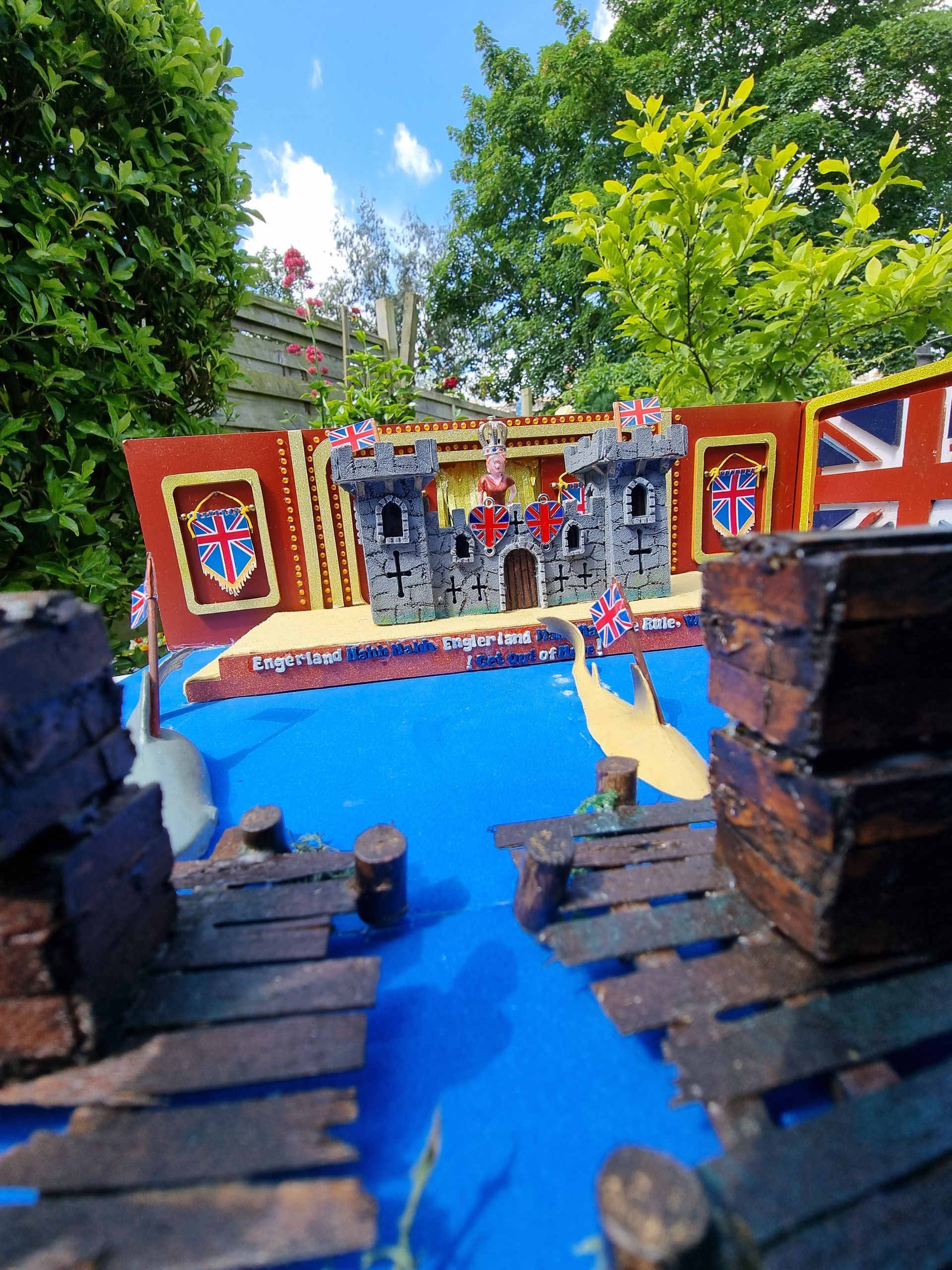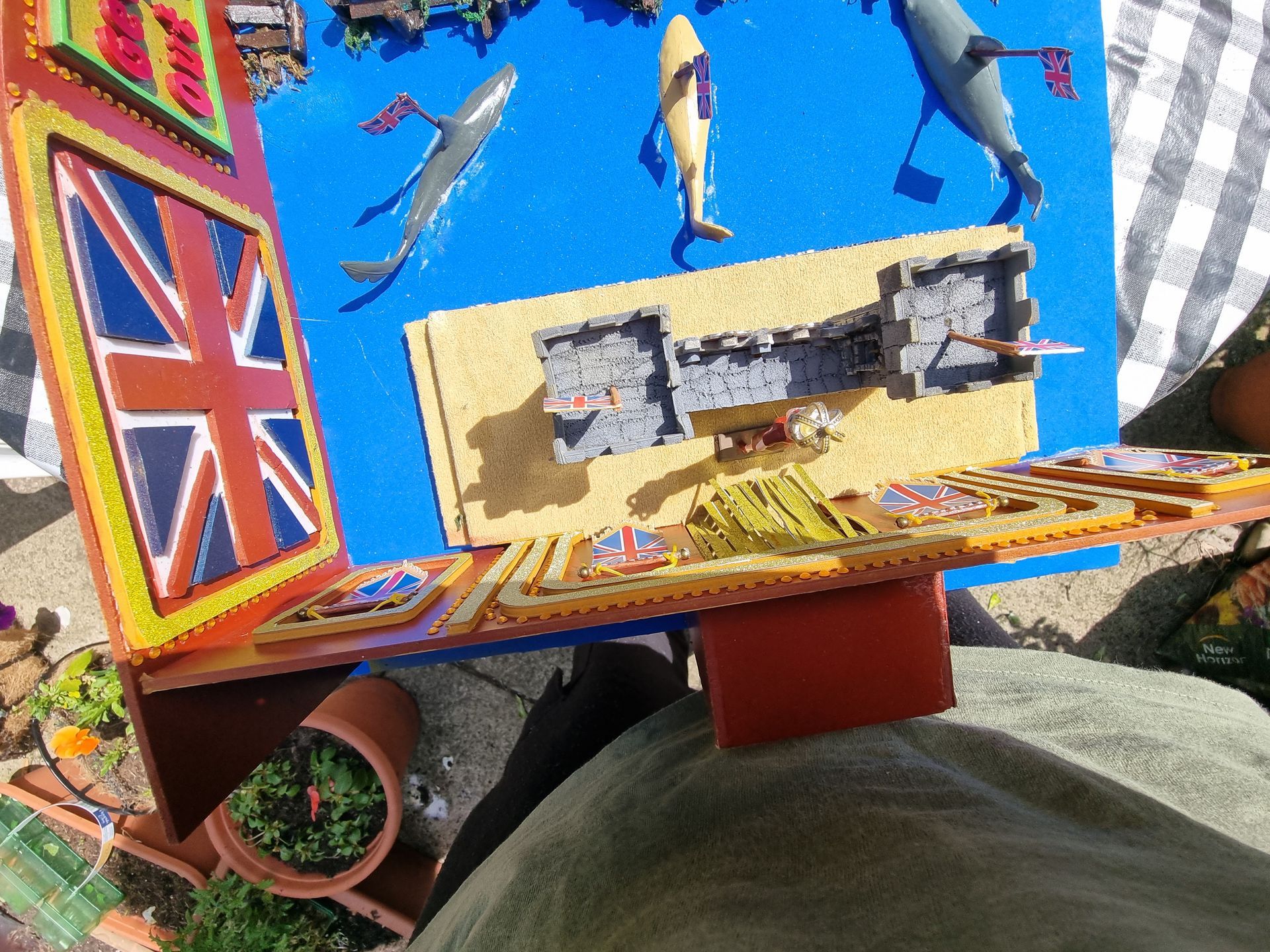 - The floor space dressed to represent the English Channel and a castle moat to keep out the migrants and infested with patriotic sharks (Originally warships either WW2 or 18th century style. Sharks would be easier to make, probably out of polystyrne and funnier, Austin Powers style).