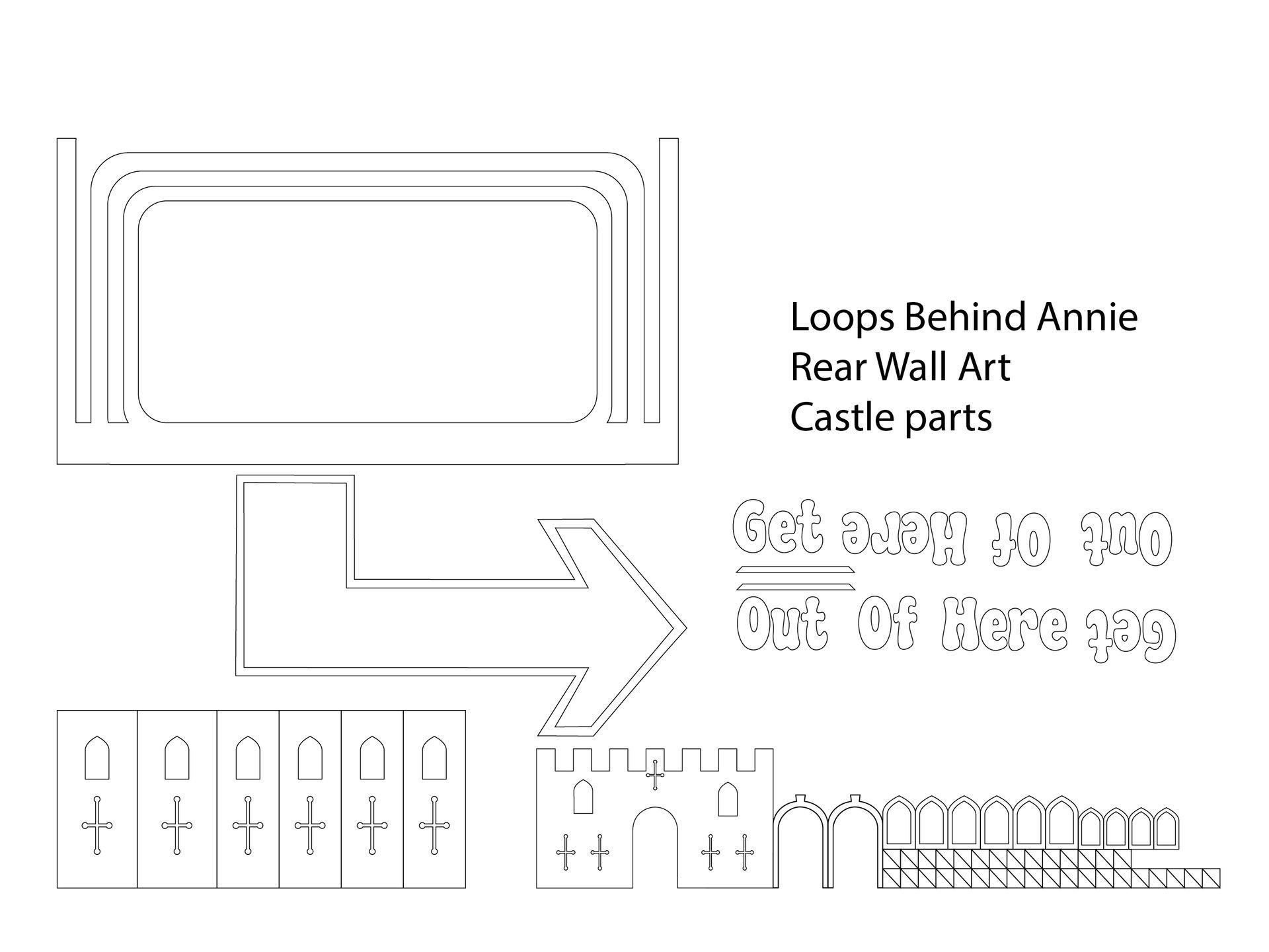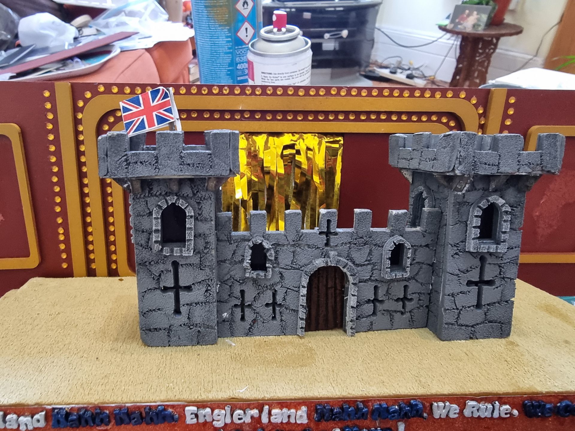The set walls that make up the backdrop to Amie the host’s castle stage. The rear arrow and union jack wall, plus the ship would be made from standard flats. In the case of the castle rear wall, it needs to be measured around the host gate.