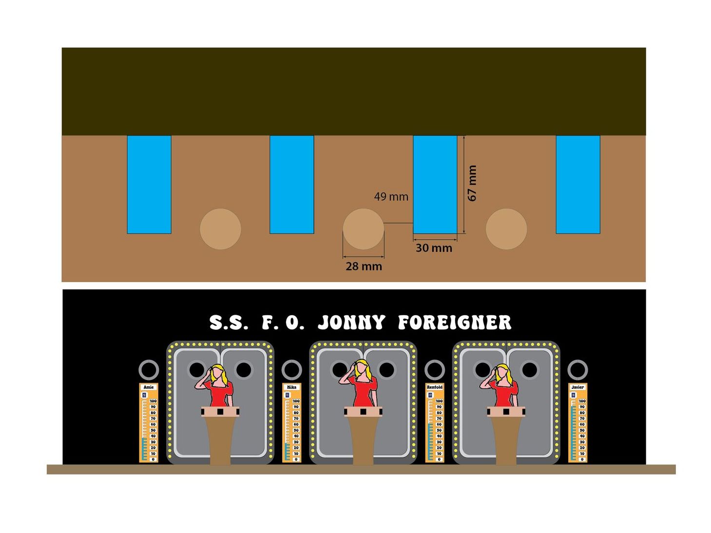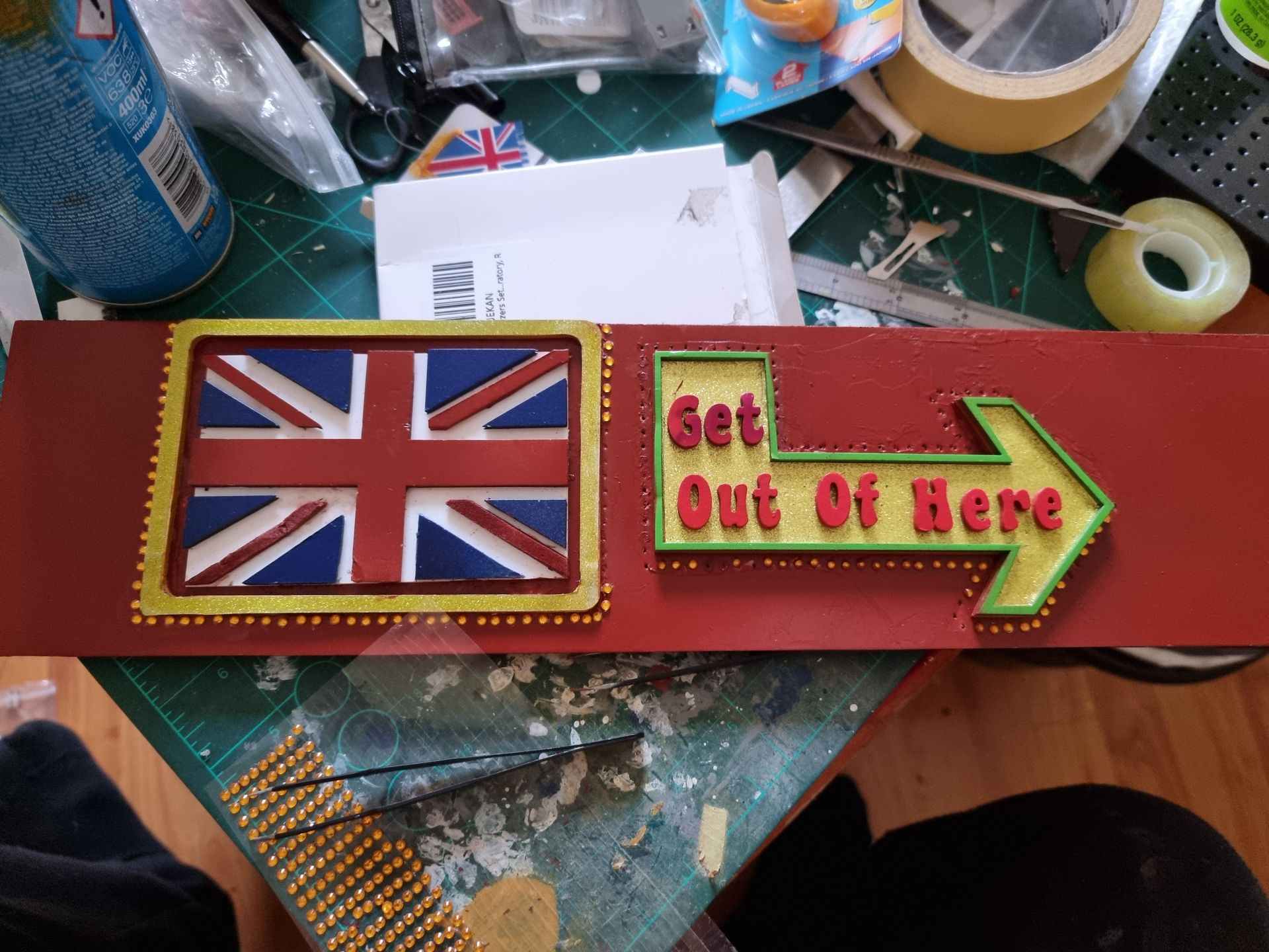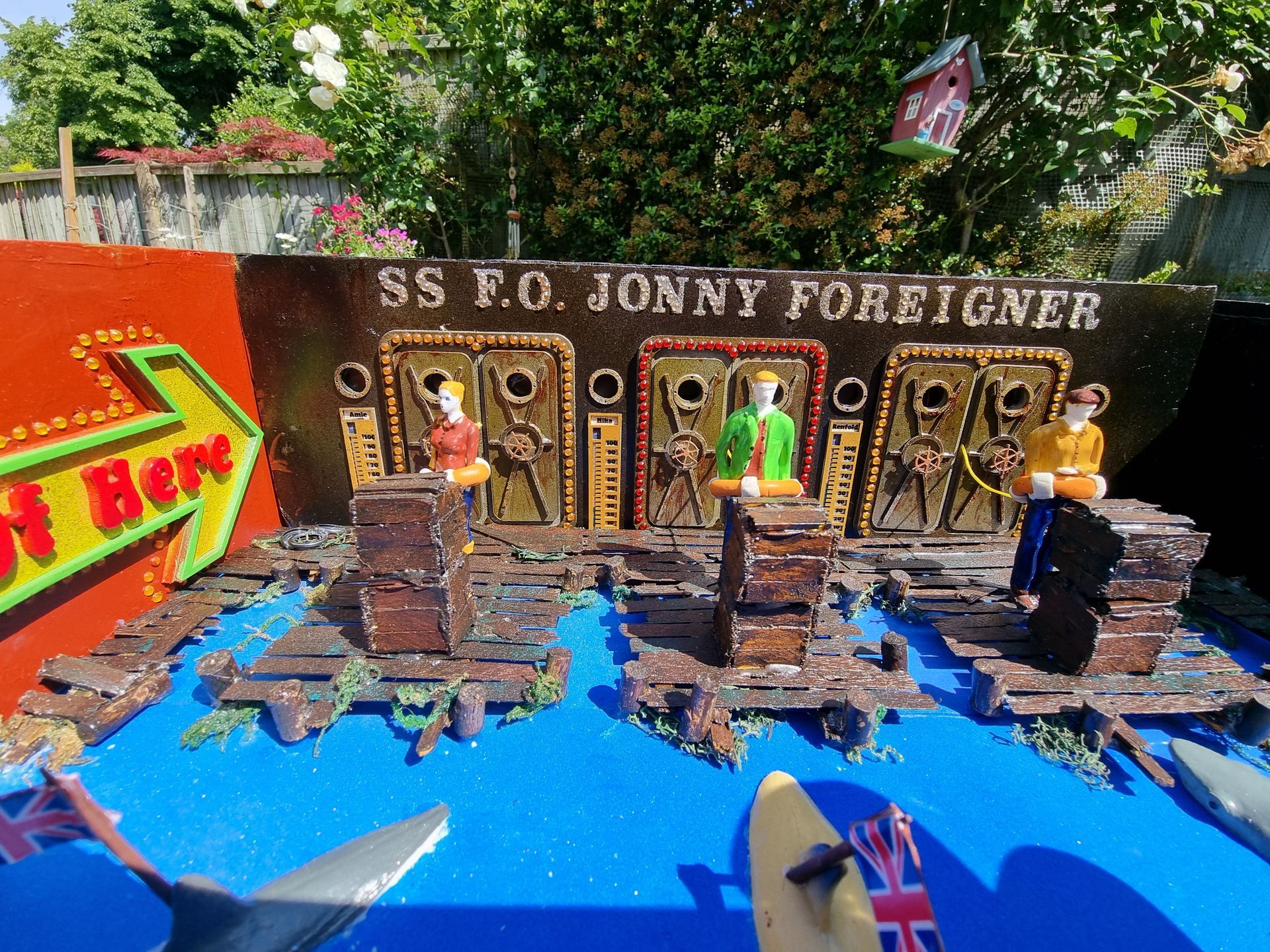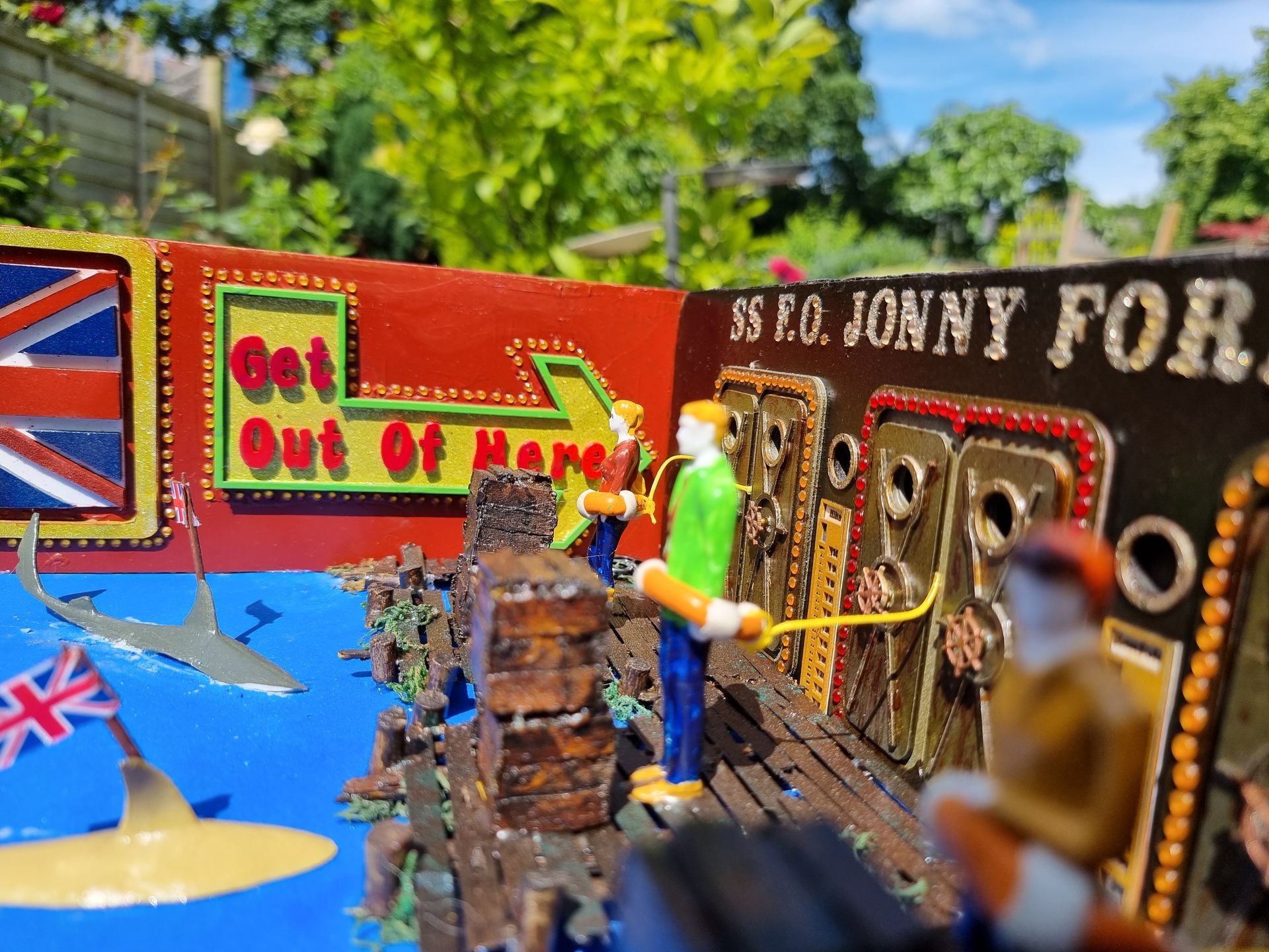 The ship name was intended to be as offensive as possible and totally typical with the attitude of far right, racist nationalists always saying migrants should go back where they came from and referring to human beings as Johnny foreigner. To fit the seventies vibe the lettering would be glittery, fat round with light bulbs. The gameshow was called 'Get out of Here' so it was worked around that
