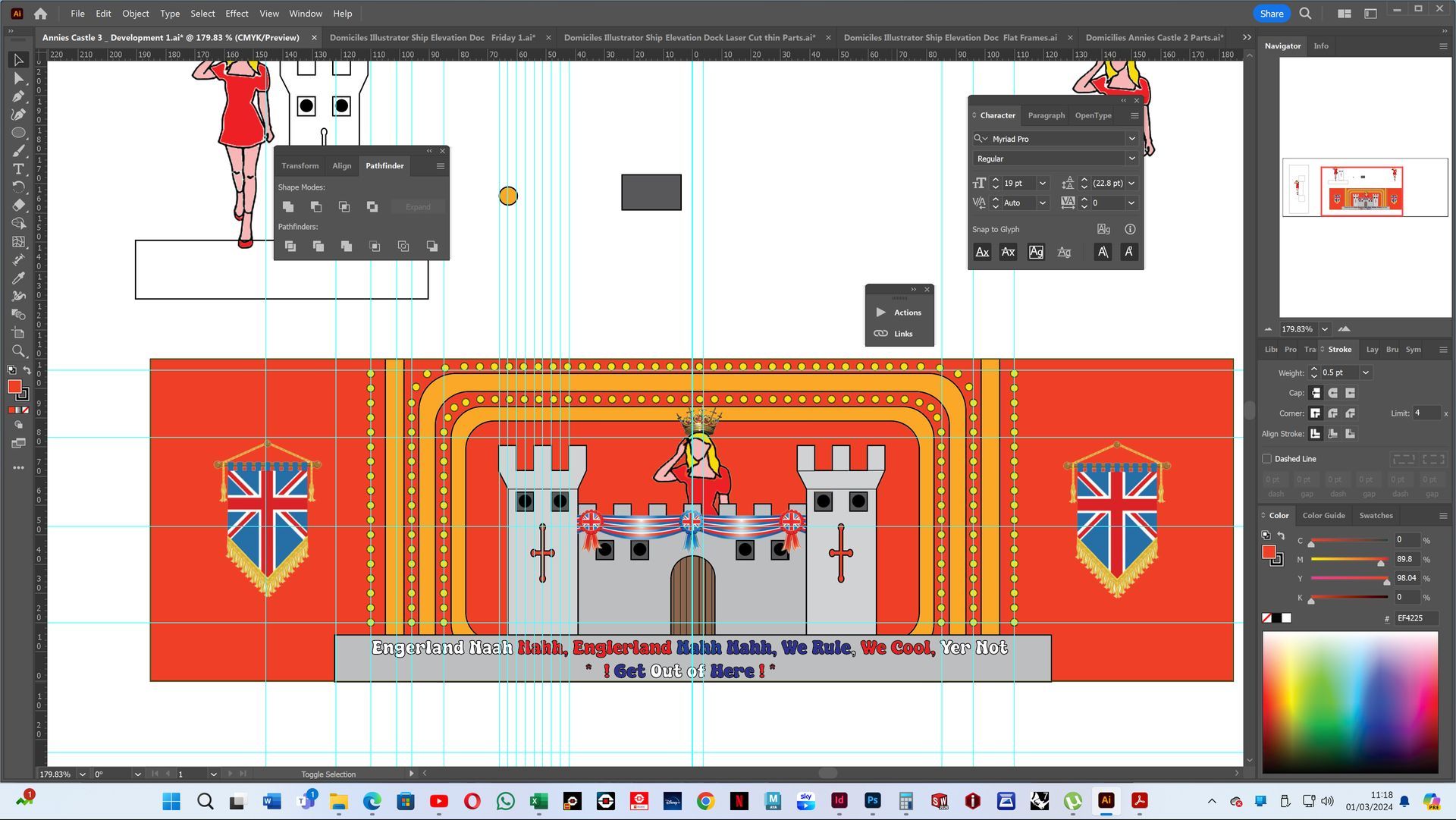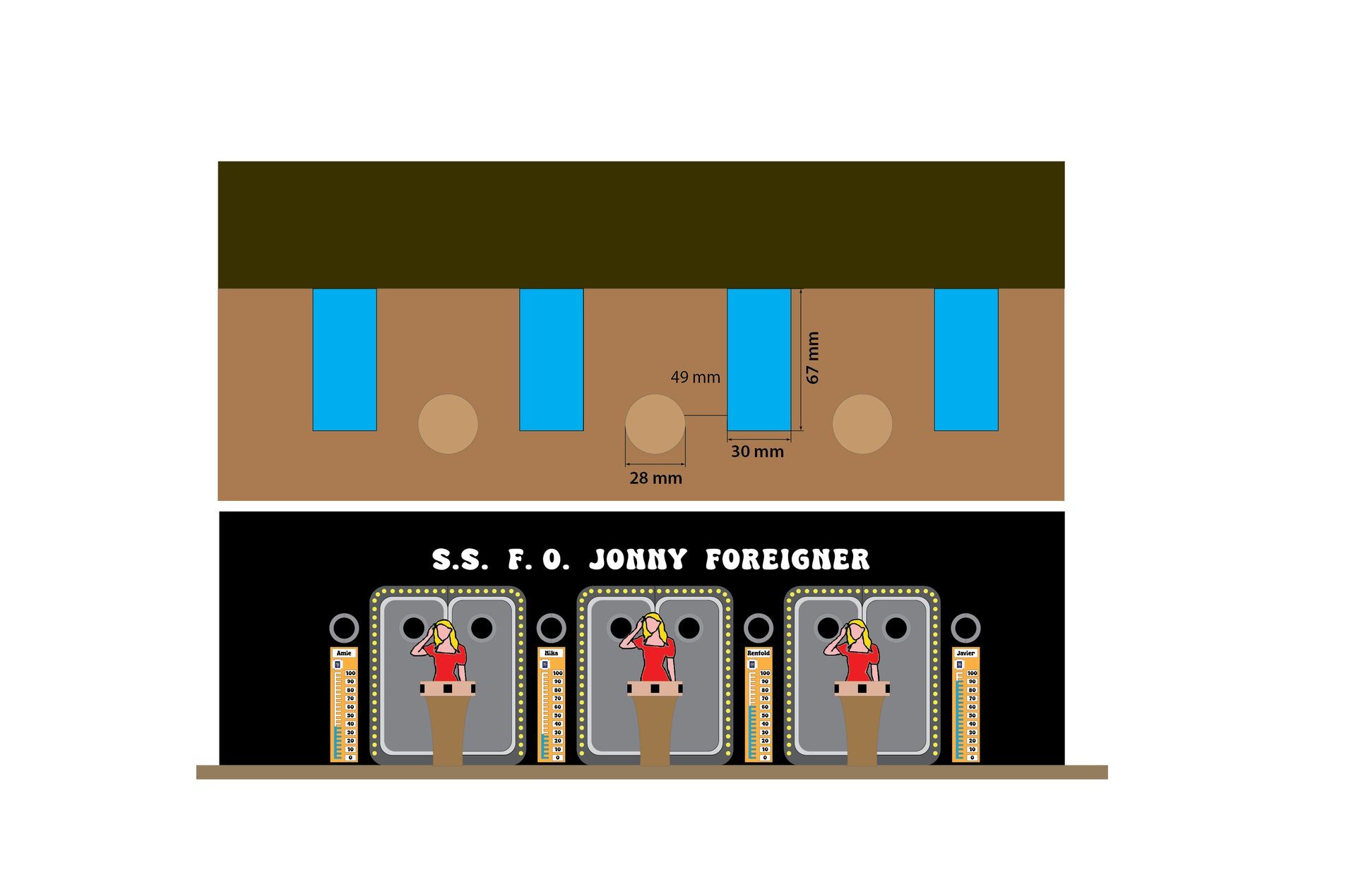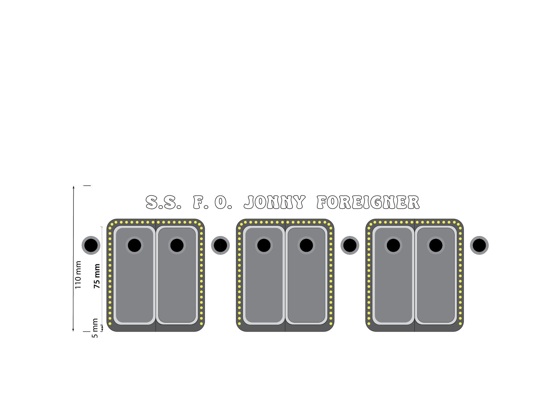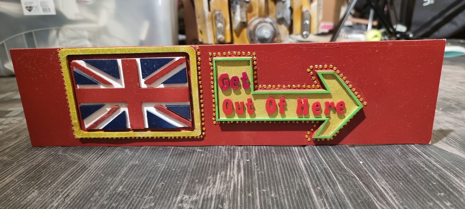 The ship name was intended to be as offensive as possible and totally typical with the attitude of far right, racist nationalists always saying migrants should go back where they came from and referring to human beings as Johnny foreigner. To fit the seventies vibe the lettering would be glittery, fat round with light bulbs. The gameshow was called 'Get out of Here' so it was worked around that