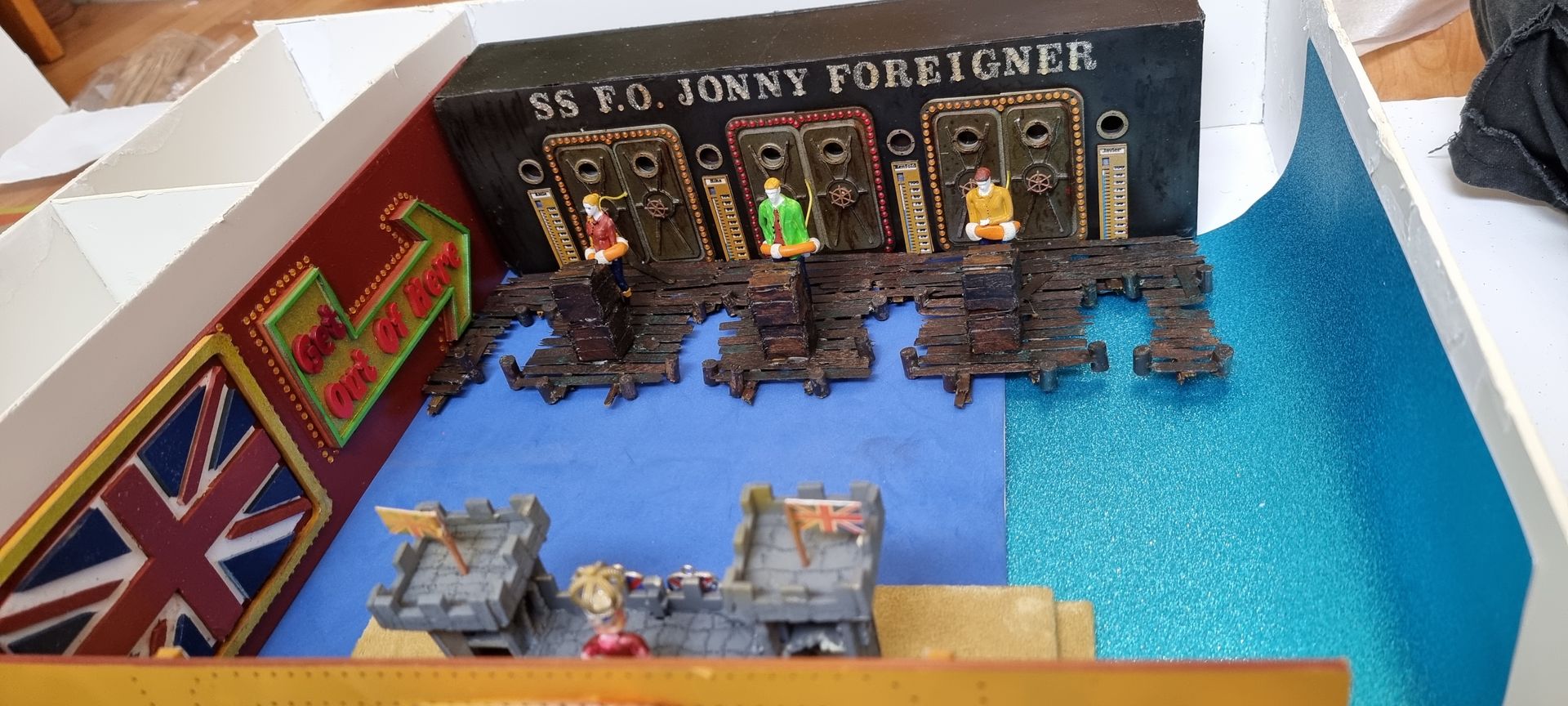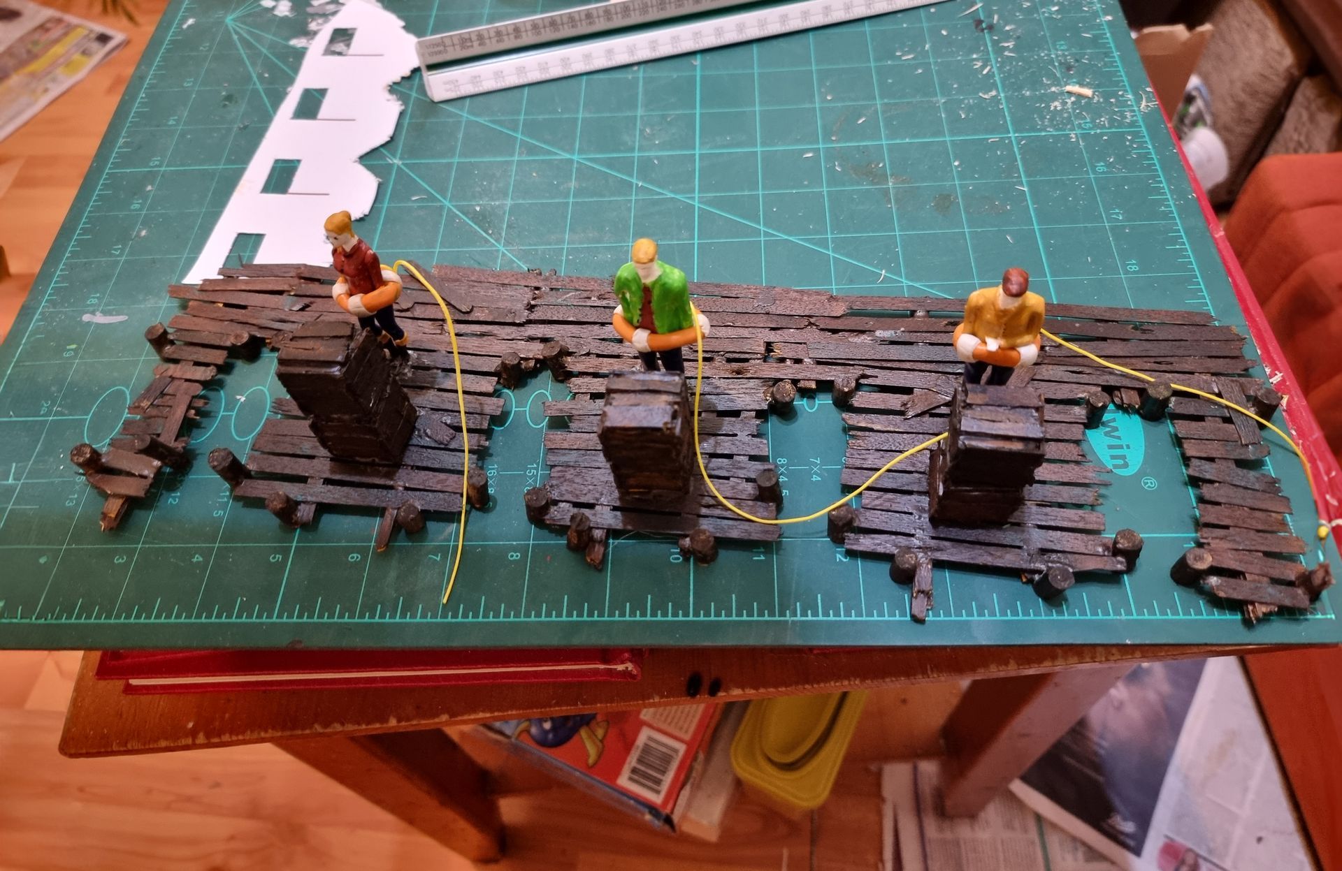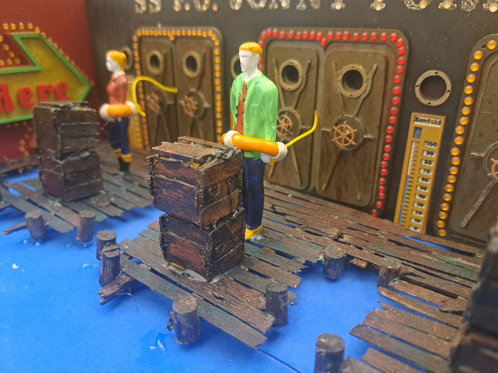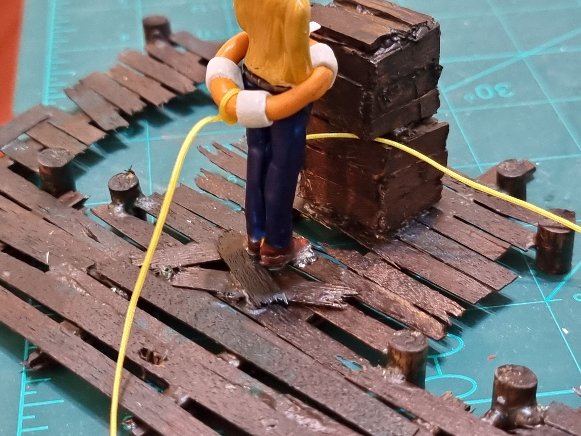 These figures where superglued onto the dock. This glue was painted over and simulated planting onto the glue resin.