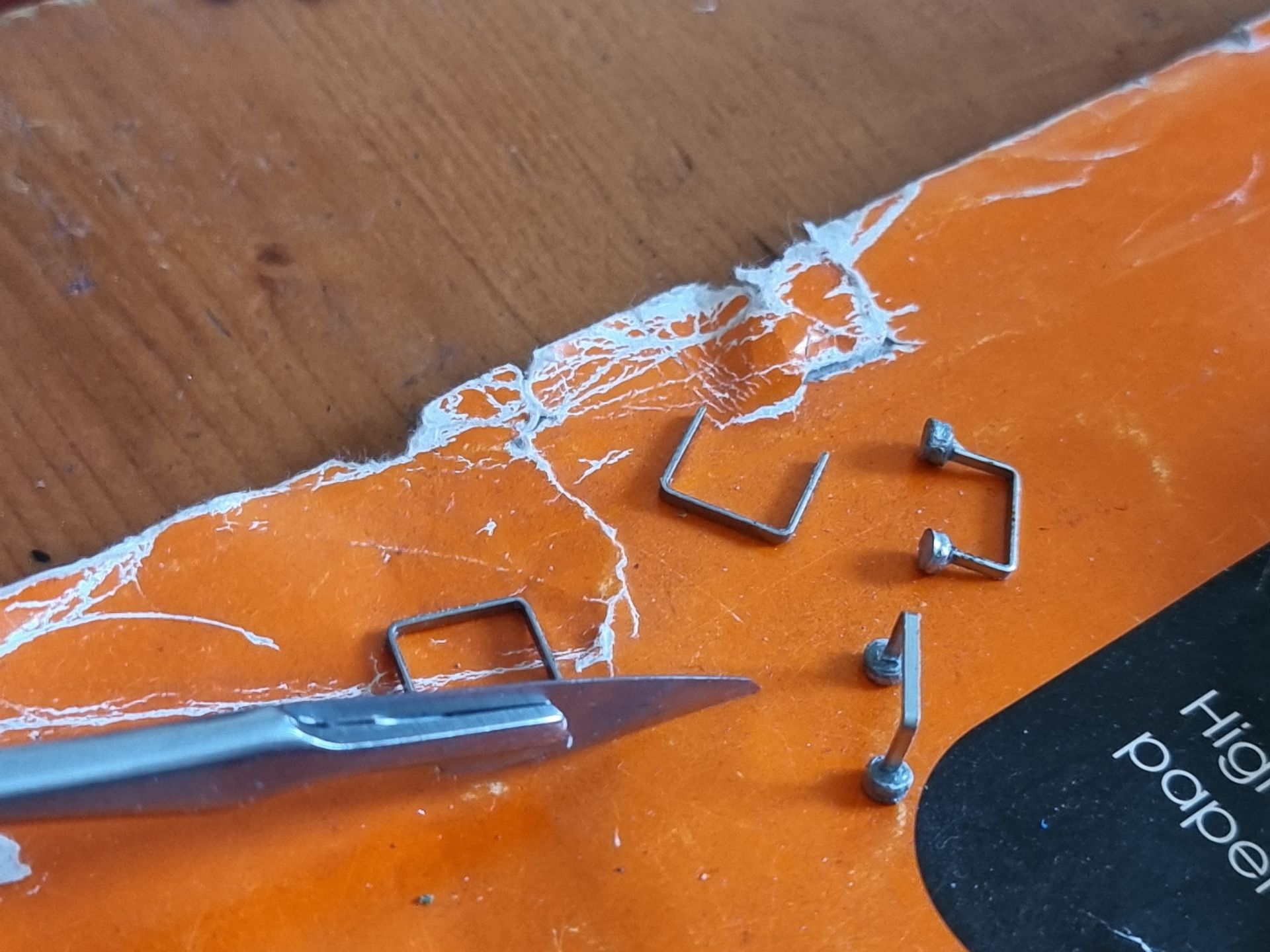 To enhance the model, I decided to add door handles and some of the metallic trim on the windows found that the staples from a staple gun were the ideal size for the door handles on a model set to 1:25 scale.