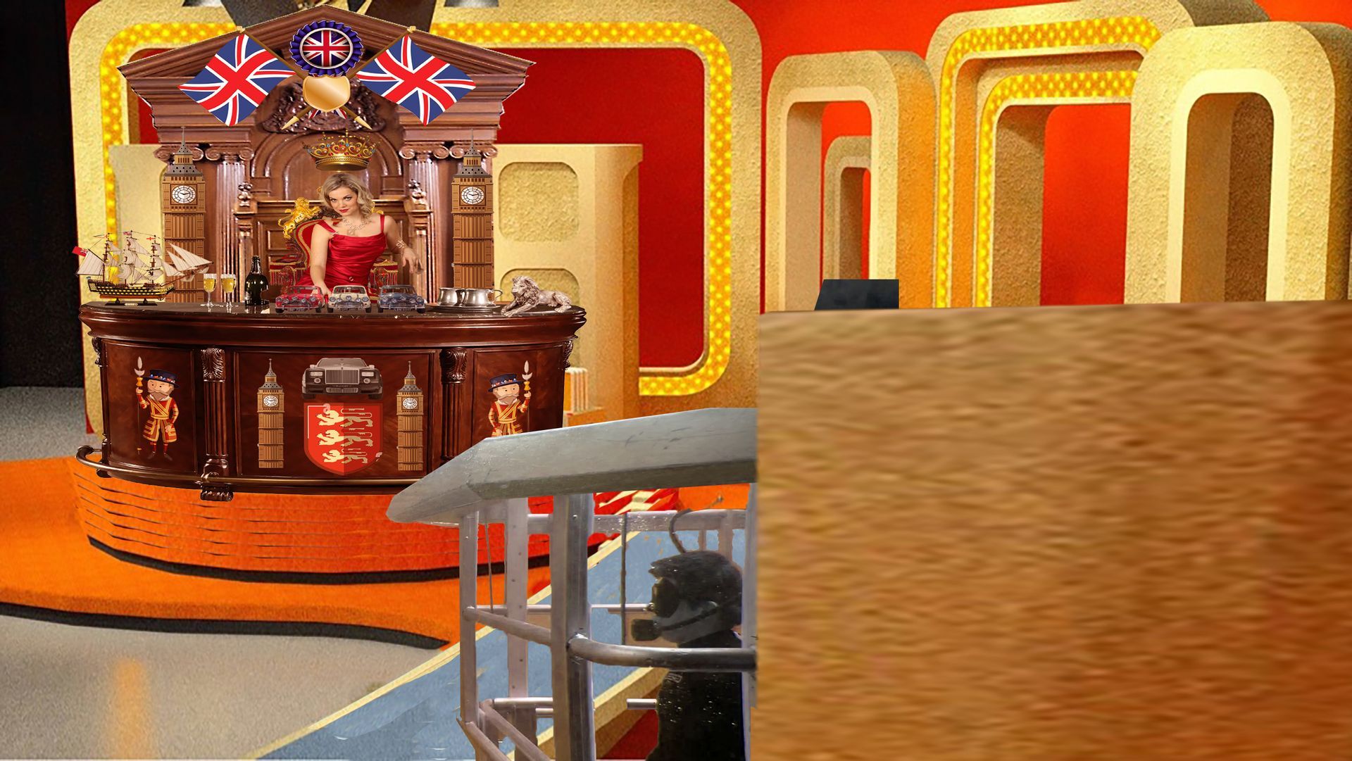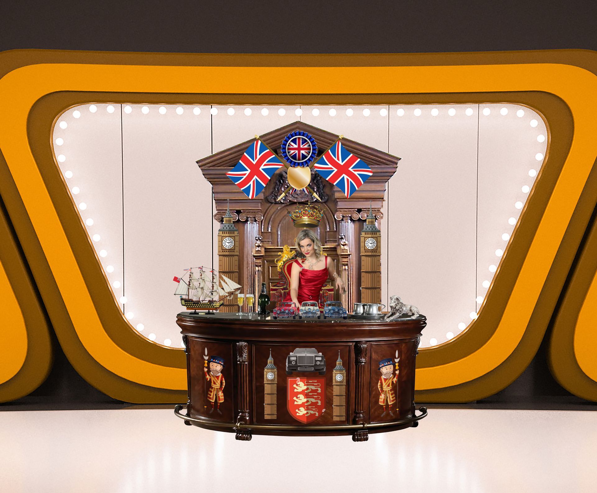 The host would get a British pub like desk podium with rooms for luxuries and refreshments such as cocktails and chocolates as well as sy7mbols of Britishness and memorabilia.