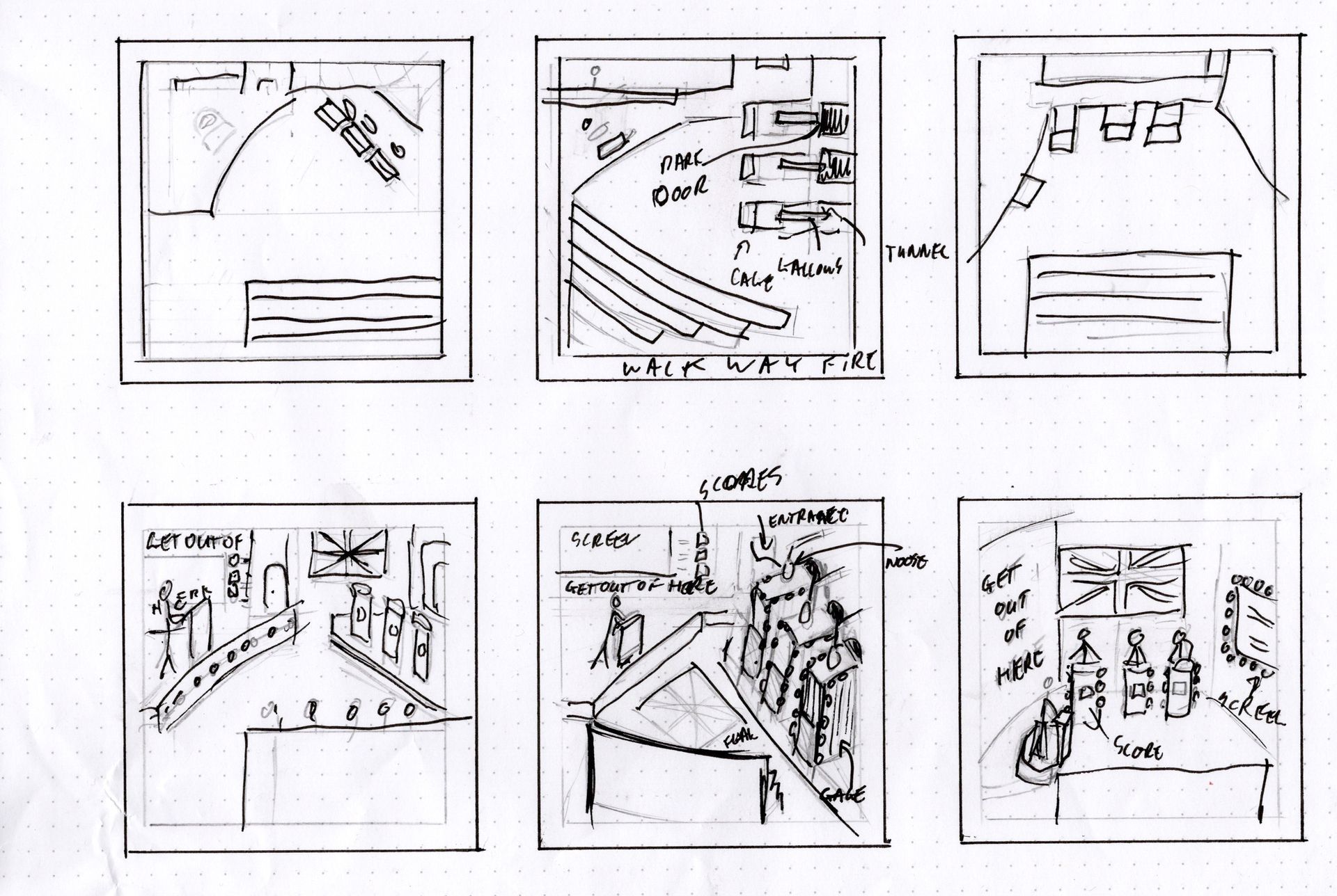 Please use the links below to read the treatment and script that we worked from, to understand how and why I interpreted them the way I did to develop my concepts to fit them. It is a nightmarish rigged, racist and xenophobic gameshow that ill-treats the migrant contestants so make it bad.