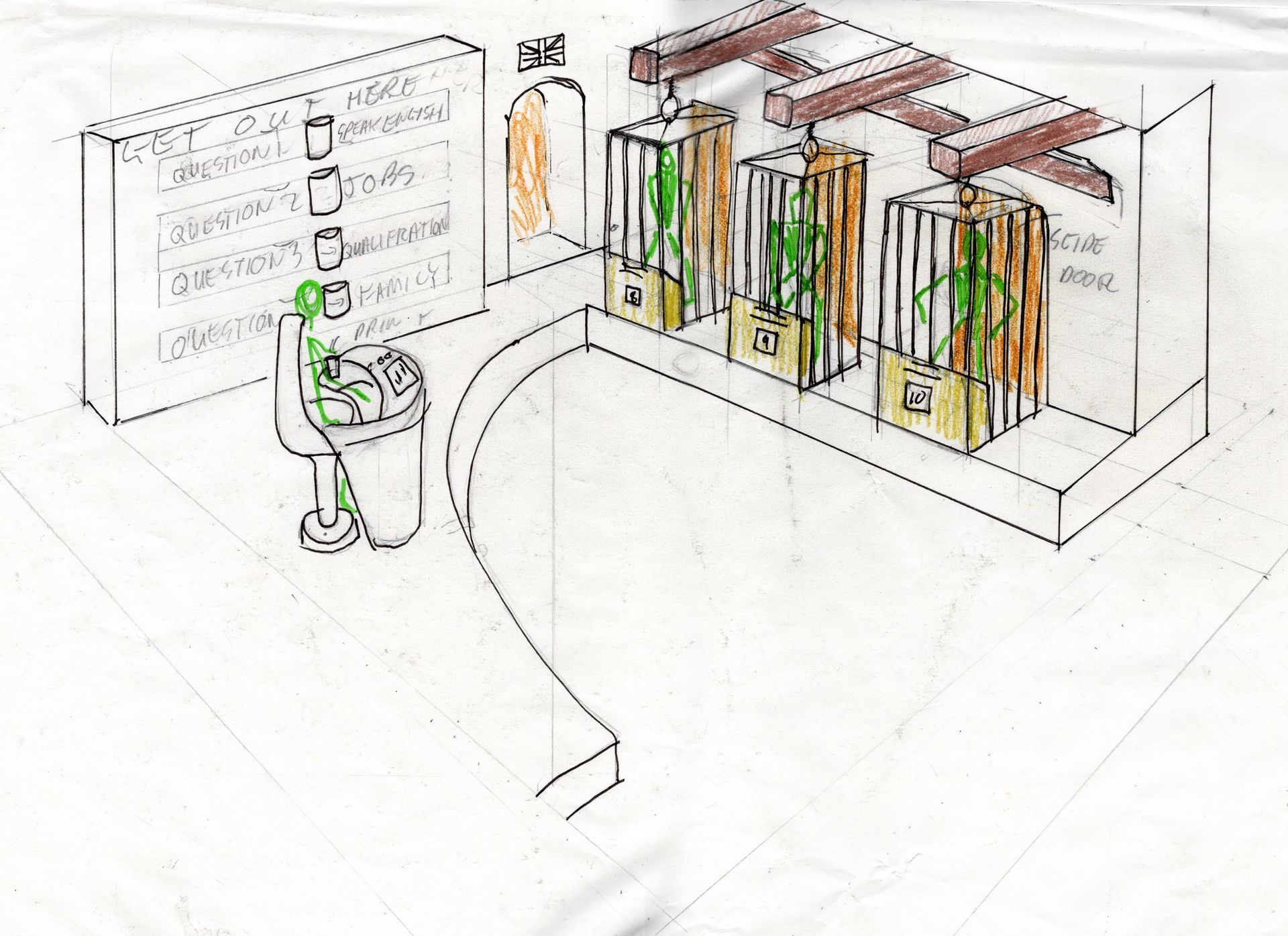 Behind the Contestants would be a mock side of a ship ready to deport and take them away. A simple box room structure made of flats, with doors to contain the immigration officer troops ready to pull contestants into the darkness and doom.